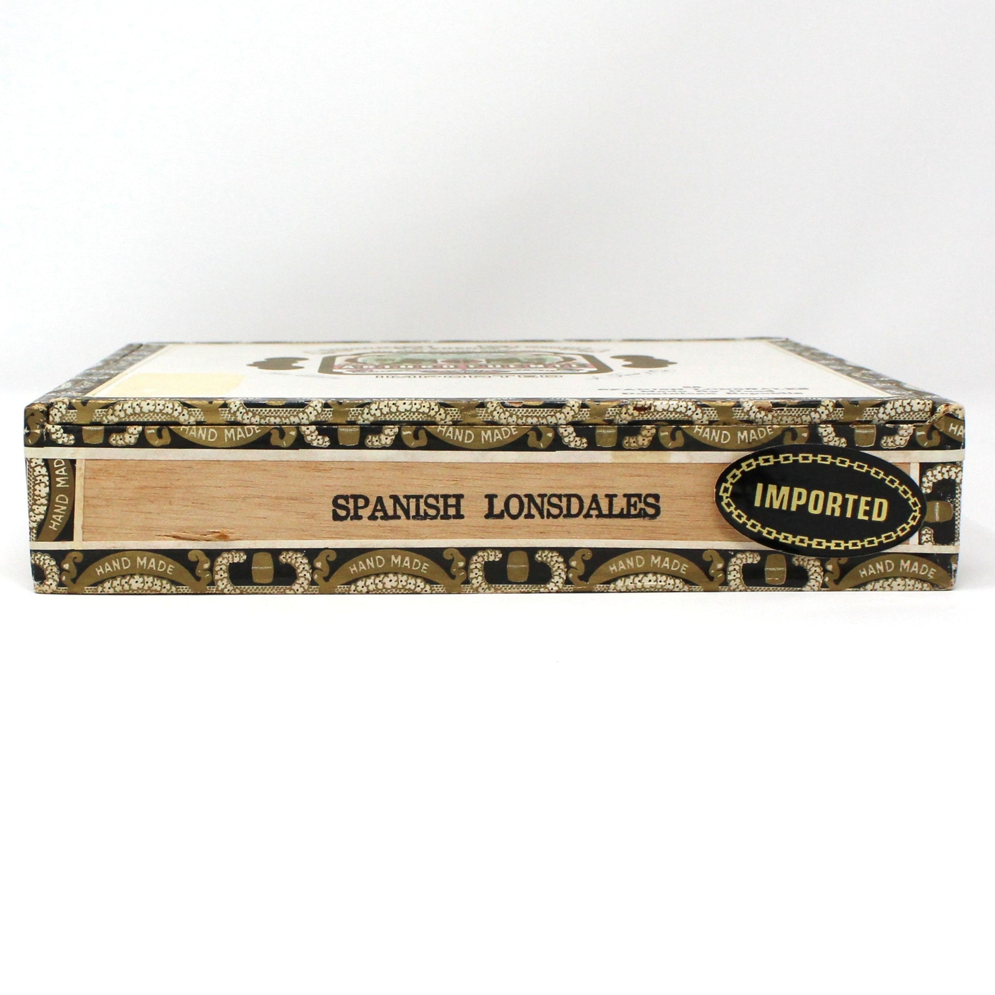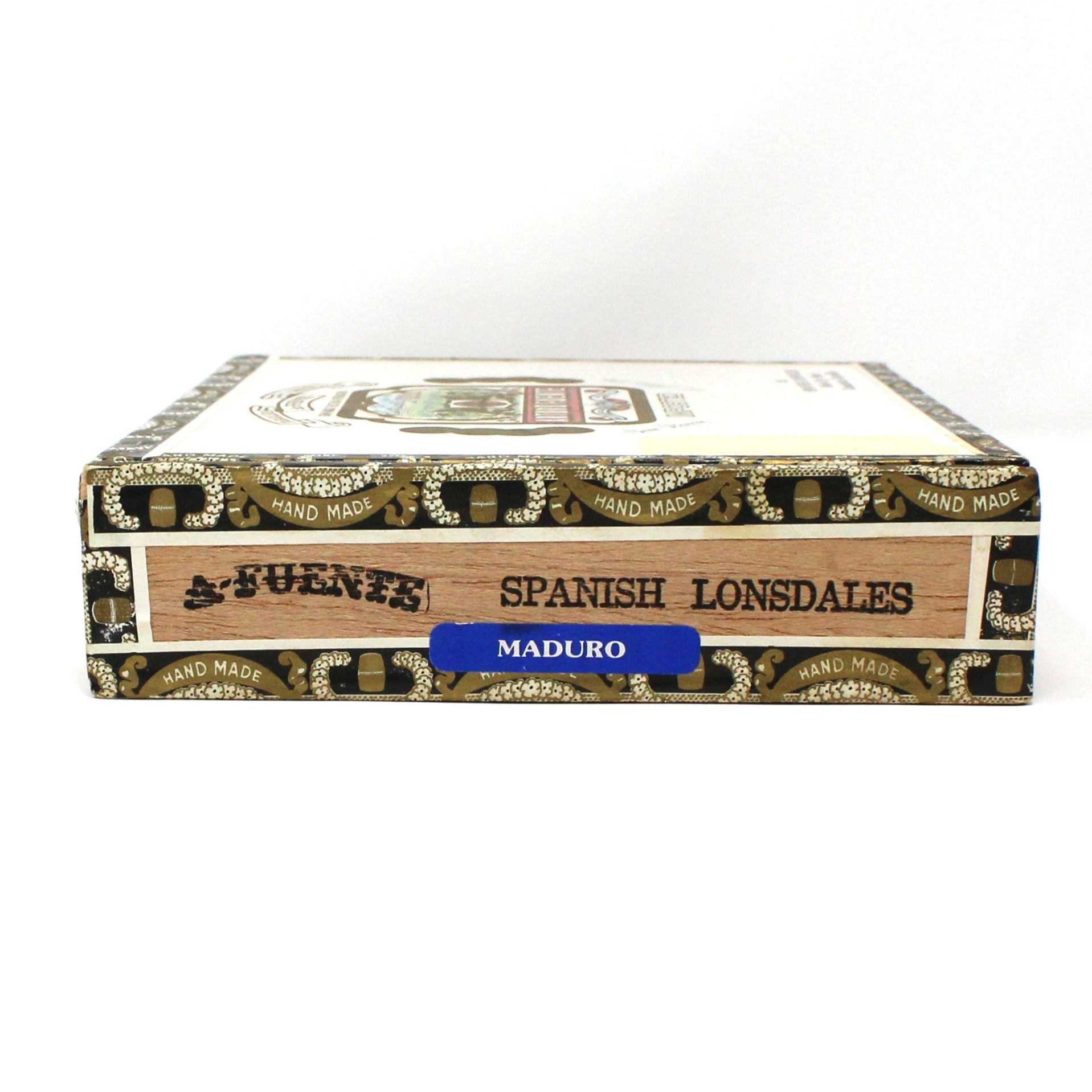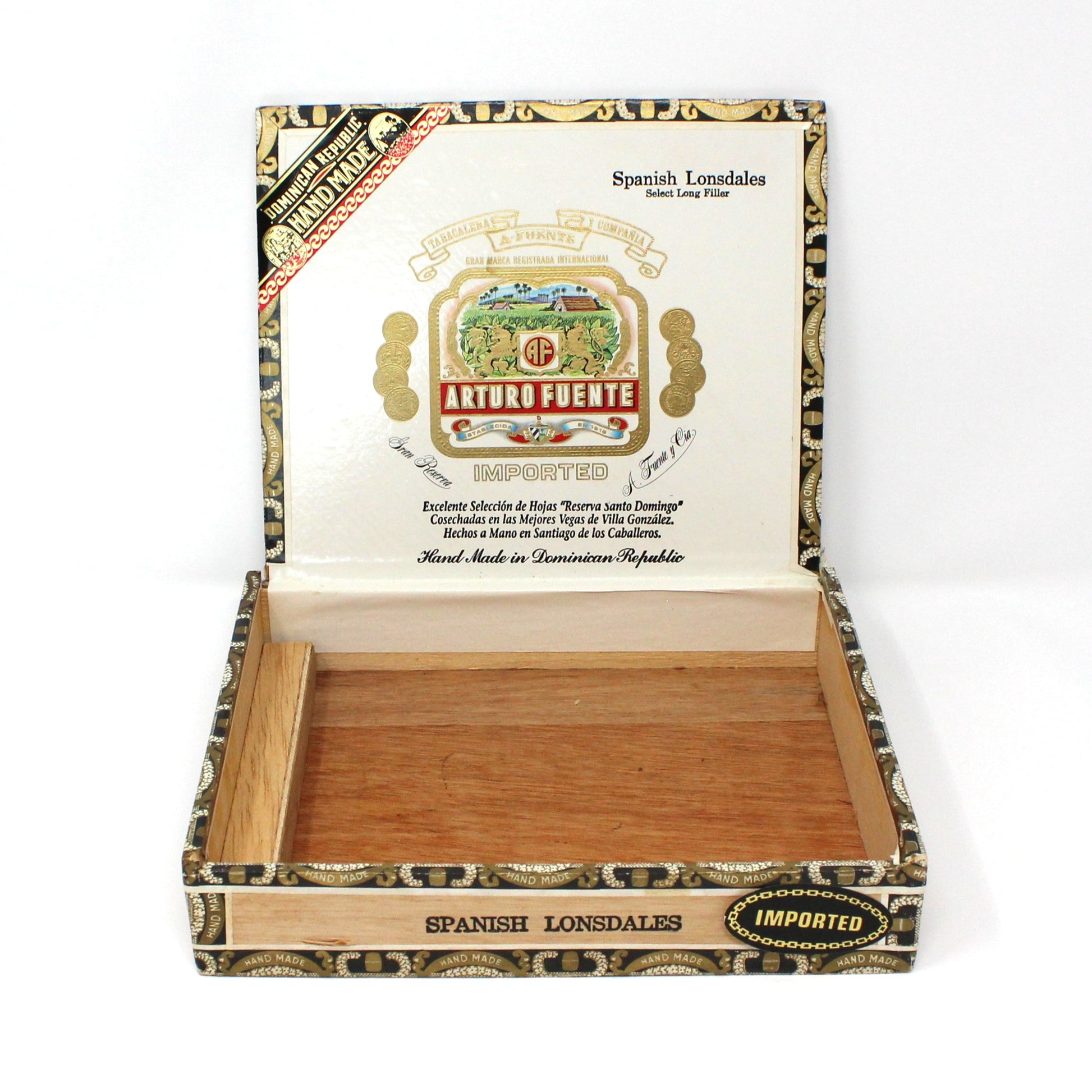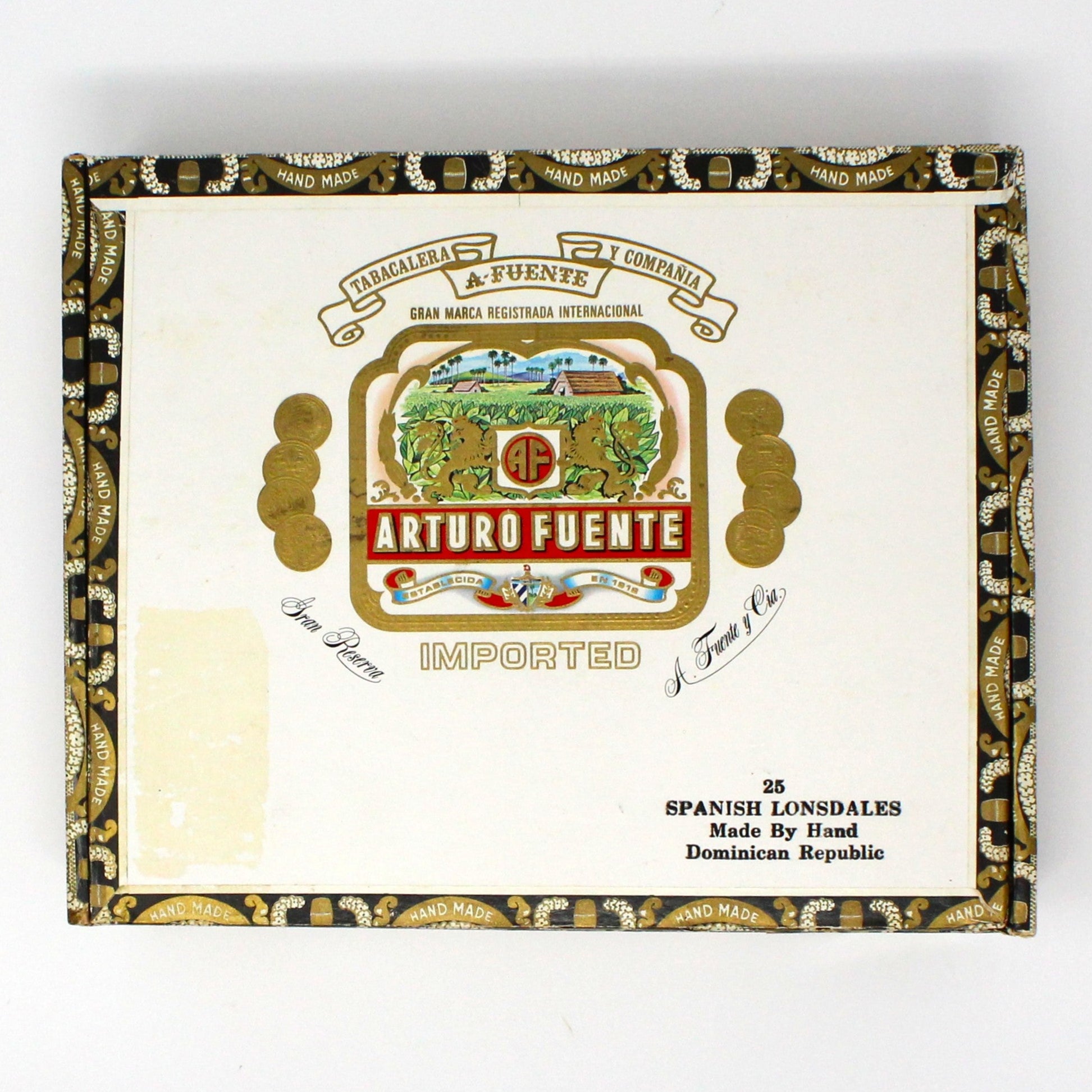 - Details: This box of Arturo Fuente Spanish Lonsdales Maduro cigars is lovely. The label is embossed and gilded, it has the two-lions logo and the Cuban Shield, an ohmage to his home country, as Arturo Fuente was a Cuban immigrant. When the box is opened, you find another gorgeous, heavily embossed and gilded label, with the same features on the top label, but larger. It was difficult to date this box, many of the identifiers like tax stamps, etc., are missing, however, we know that in 2001, Arturo Fuente started including a humidifier pouch inside the box, and the outer label had a blue "water droplet" illustration, to indicate the addition of humidity. This box does not have the blue droplet so we can comfortably date it to the 1990's, perhaps it's older. This is a great collector's item for a cigar aficionado, or tobacciana collector. In the family room it makes a nice storage piece for remote controls, as a desk organizer for note pads and pens, great for corralling small items. We use our cigar boxes to store playing card decks and small games. In the bar it can store bottle openers, wine stoppers, coasters, etc.