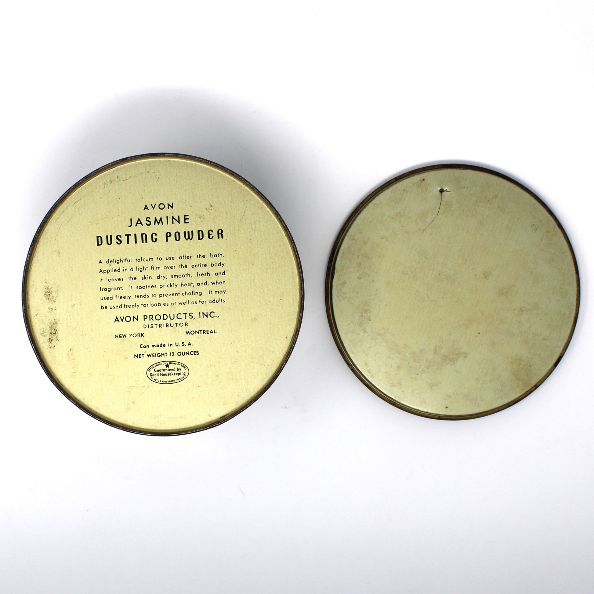 - Details: Such a pretty vintage tin!! This dusting powder round tin is from Avon, it was sold with their Jasmine scent powder, now empty. It has an elegant, Art Deco floral design on a black background with a metallic brass/gold color band on the bottom. Based on some research we found Jasmine was issued by Avon as early as the mid-1940s. The bottom of the tin reads in part: " Avon Jasmine Dusting Powder, Avon Products Inc, New York / Montreal". It features the Good Housekeeping seal first used in 1941. This tin will enhance any advertising collection and makes a beautiful bath or vanity display.