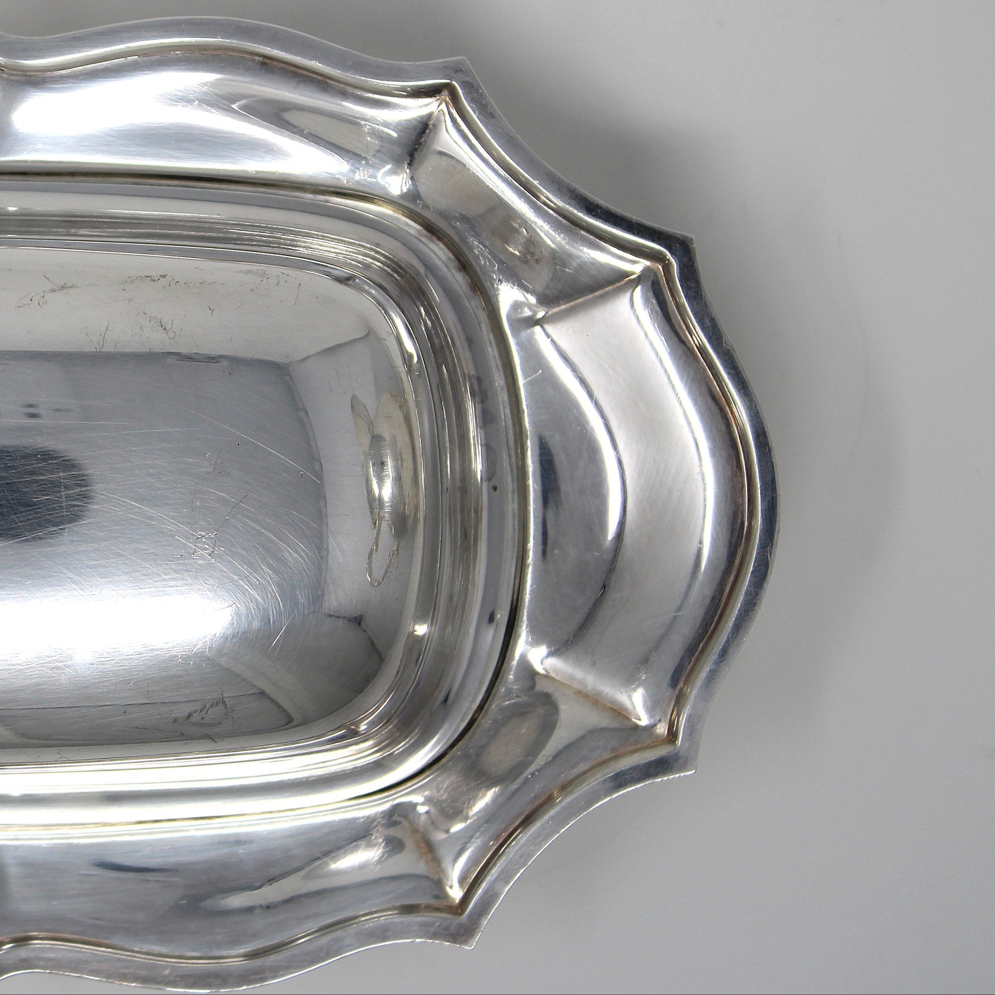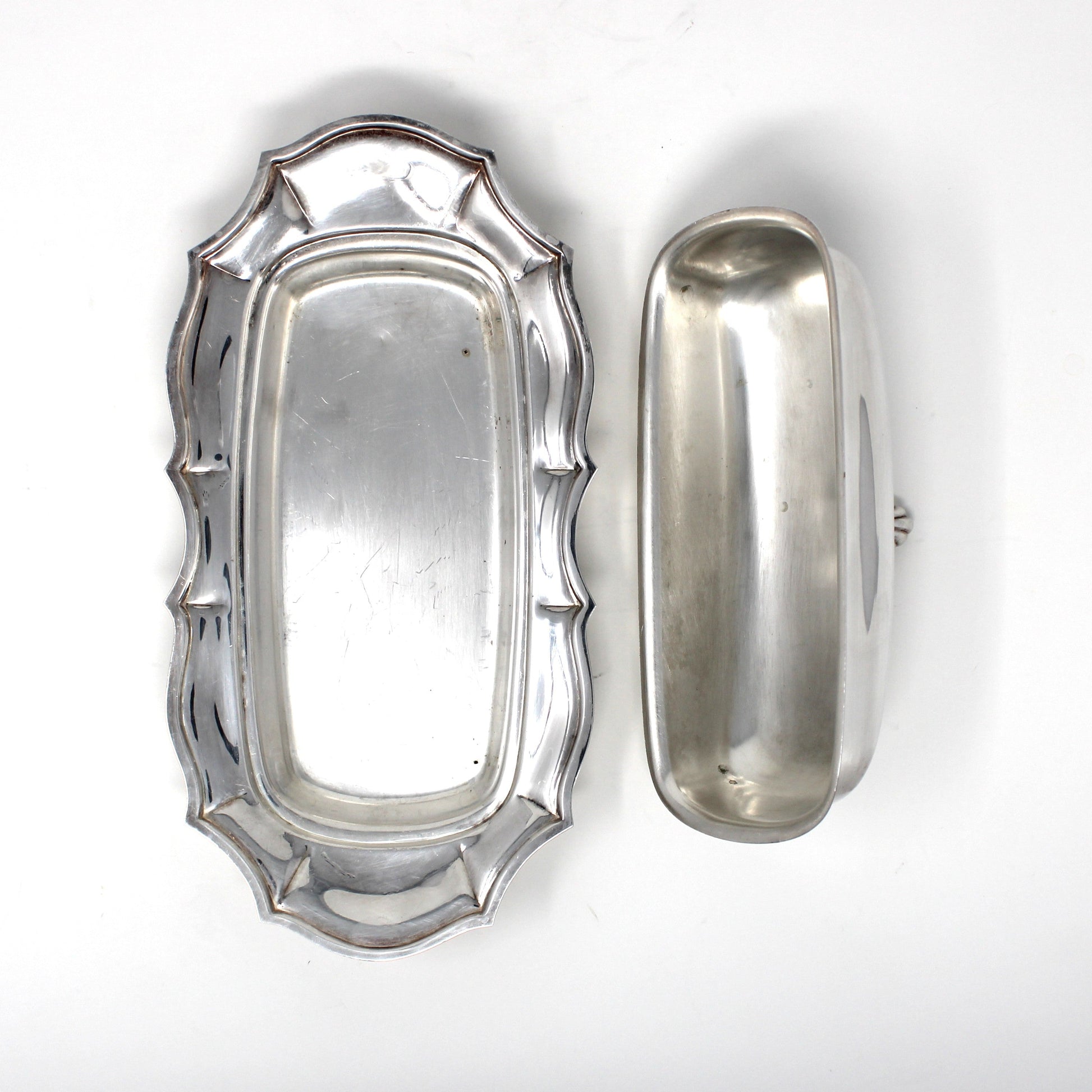 - Condition: Vintage - Used. Good Vintage Condition. There is one large scratch on the lid, photographed for you. As with all used silverplated pieces, there are minor surface scratches and marks, all acceptable due to age/use/wear. No Dents. Please review all pictures and make sure you love this item before purchasing, we cannot accept returns. Please remember these are VINTAGE and ANTIQUE items, they are NOT new, every effort has been made to show scratches, wear and tear and imperfections.