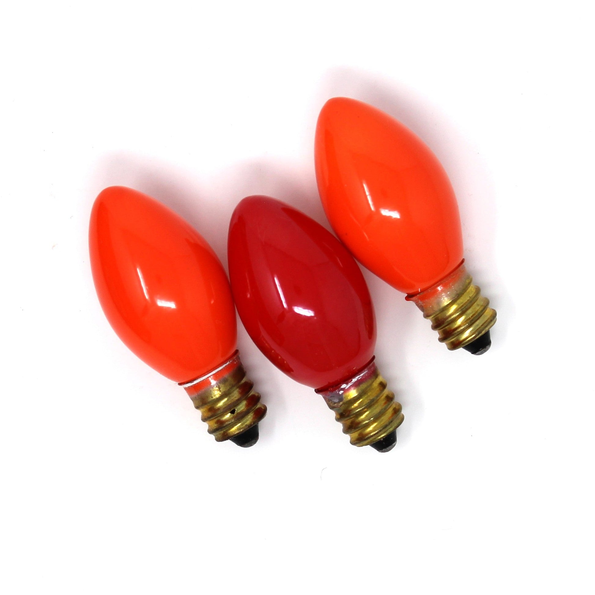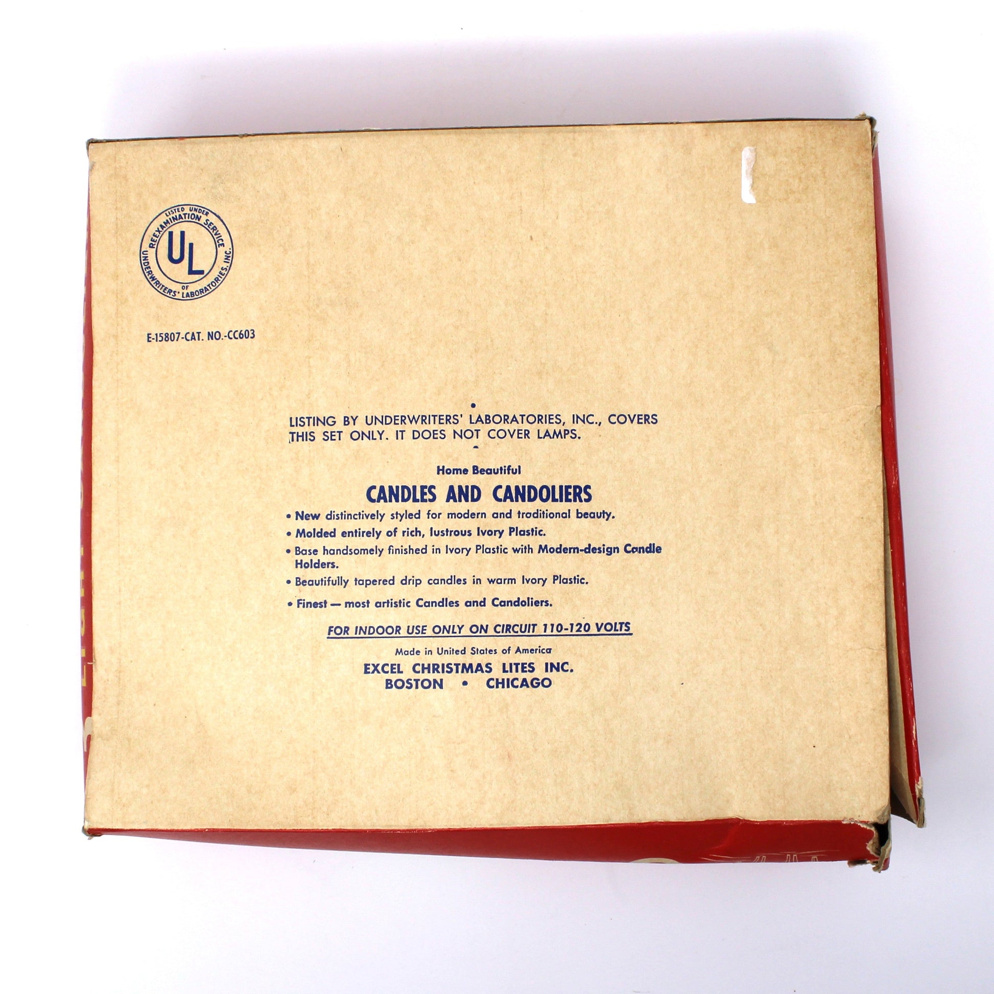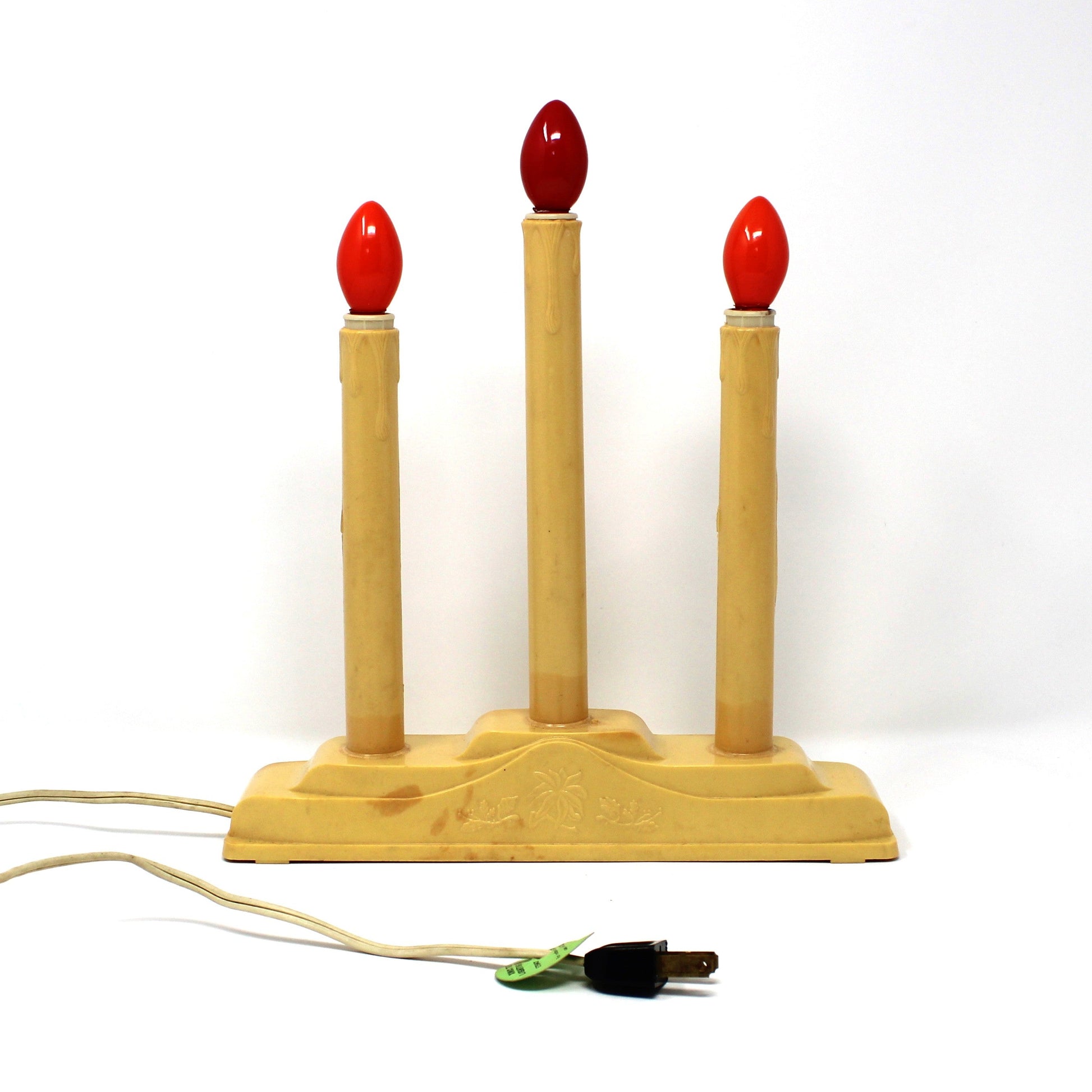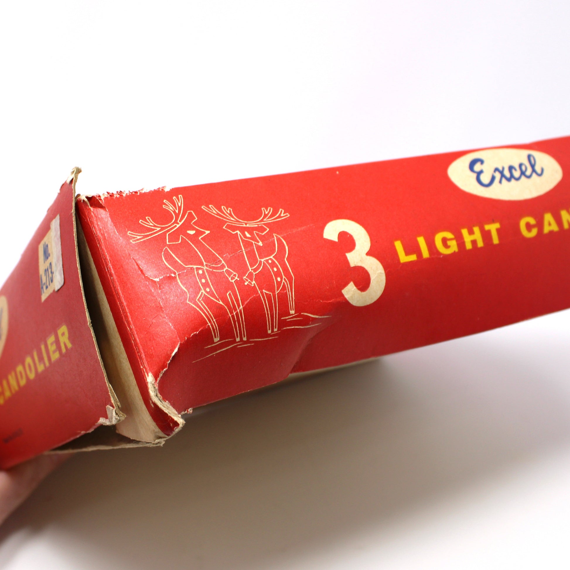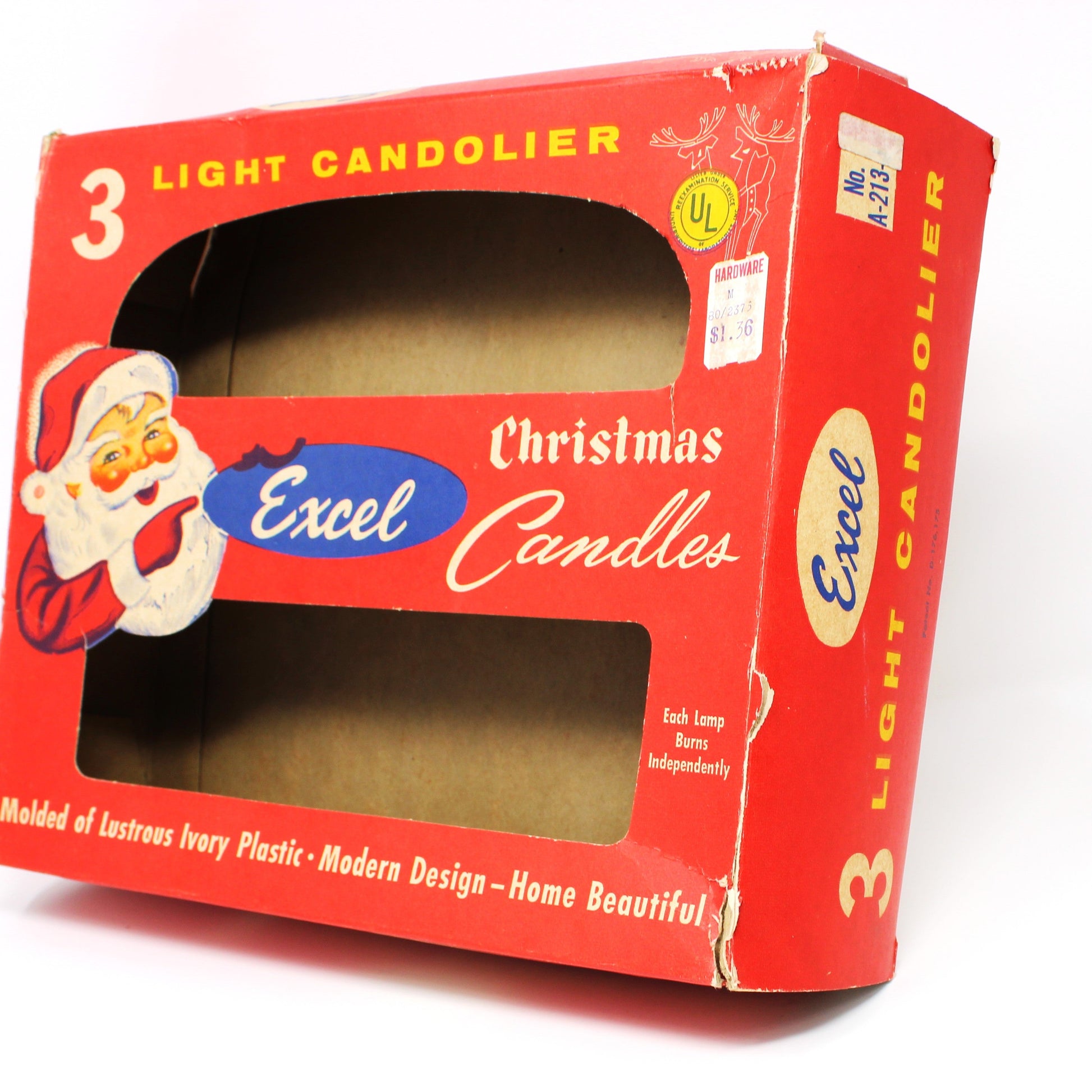 - Details: Such a fun tradition to put a Candelabra on the window during the holidays! This 3-Light Candolier will surely bring festive cheer to your windows. This Christmas Candelabra was made by Excel Christmas Lites Inc. and features three glowing lights that create a warm, nostalgic holiday glow. We added two orange and one red C7 bulbs (included), but you can swap out for whatever color you prefer. This light has been tested, works perfectly, it's ready to brighten your seasonal décor right out of the box. The original box, is in itself is a wonderful collectible, with Santa Claus on the top, reindeer on the sides and all the wonderful vintage fonts, it's one to value! A delightful piece for collectors and anyone seeking authentic vintage holiday magic.