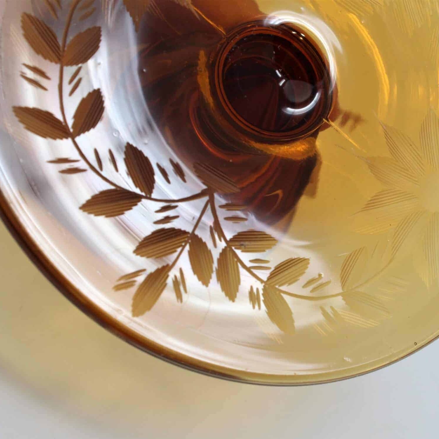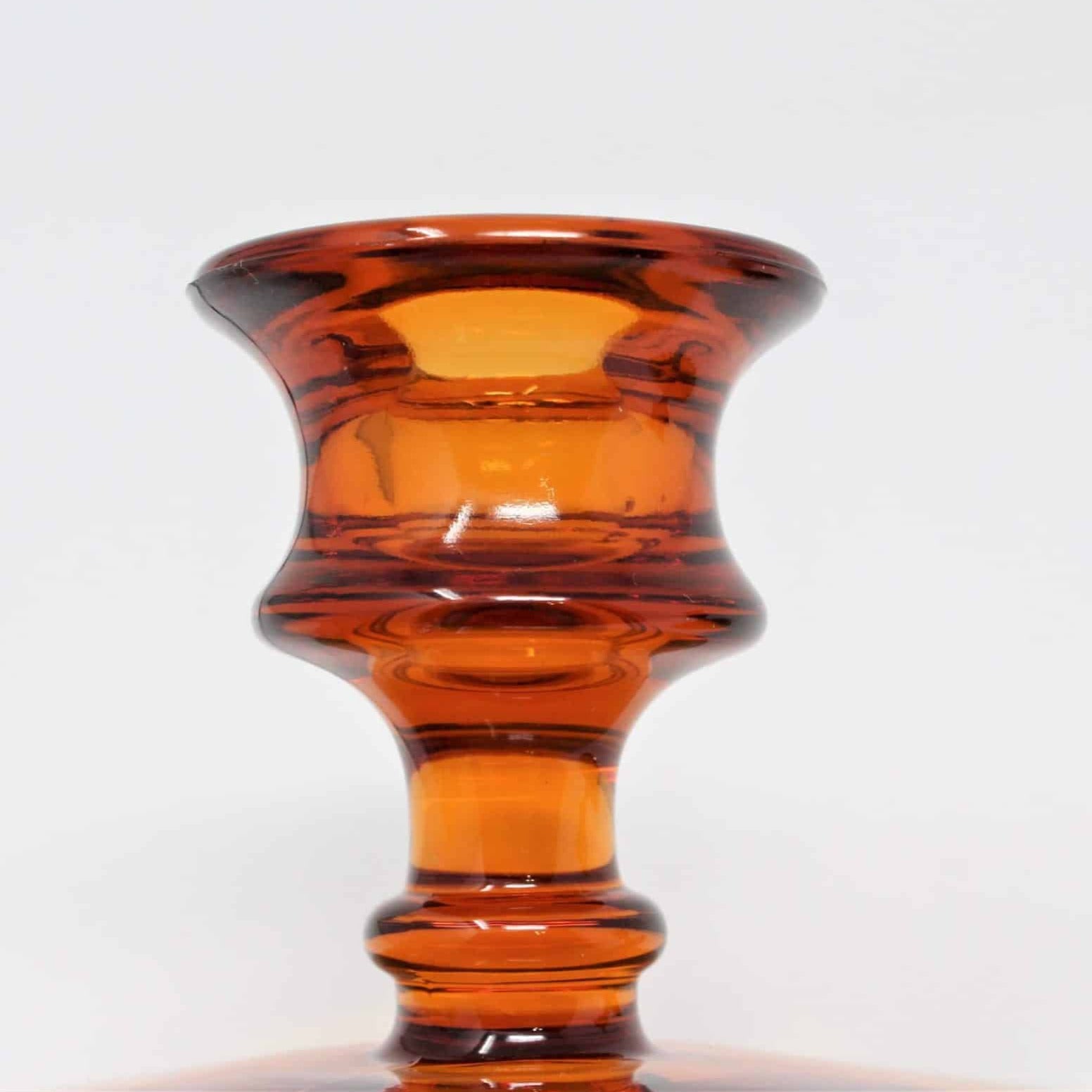 - Details: This is such a gorgeous rich amber color! These etched glass candle holders are really beautiful. We have not been able to define the actual pattern, but the shape of the candle holder is exact to the Cambridge candle holders while the floral etching looks like Lancaster's Jubilee, but Jubilee had more petals on their daisy. If you know old glass, you also know they all copied each other's patterns and shapes so it's very hard for us to tell you exactly who made them, but we believe these are Cambridge. What we can tell you for certain, they are beautiful and they are old. They will be a great addition to your Fall table or Thanksgiving table. If you are a collector and can confirm this information, we would appreciate learning more.