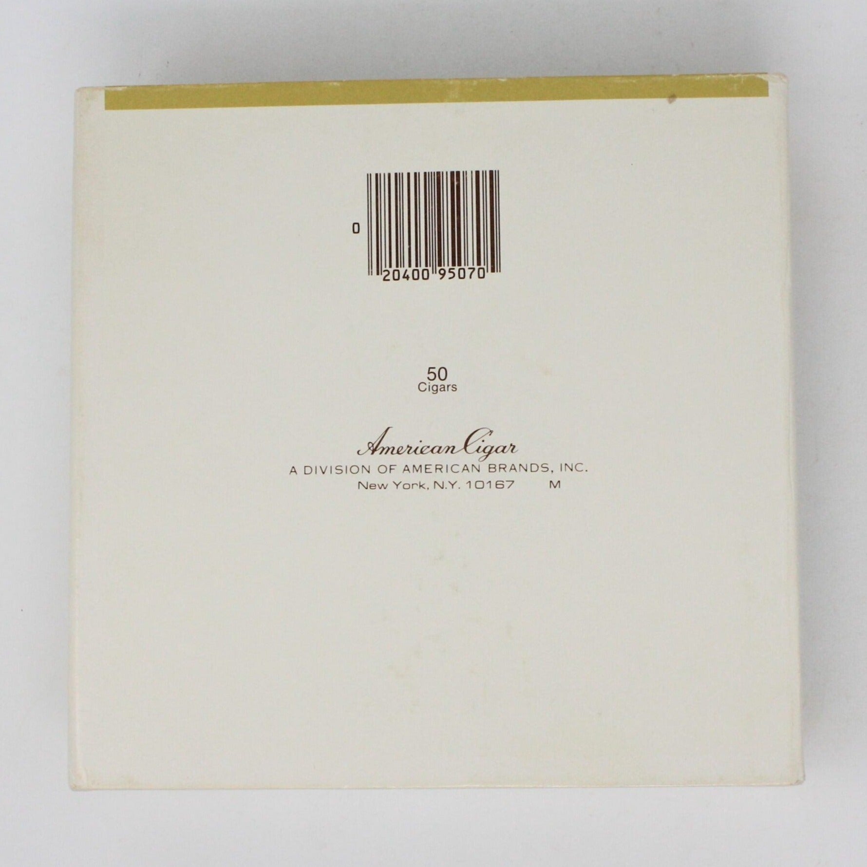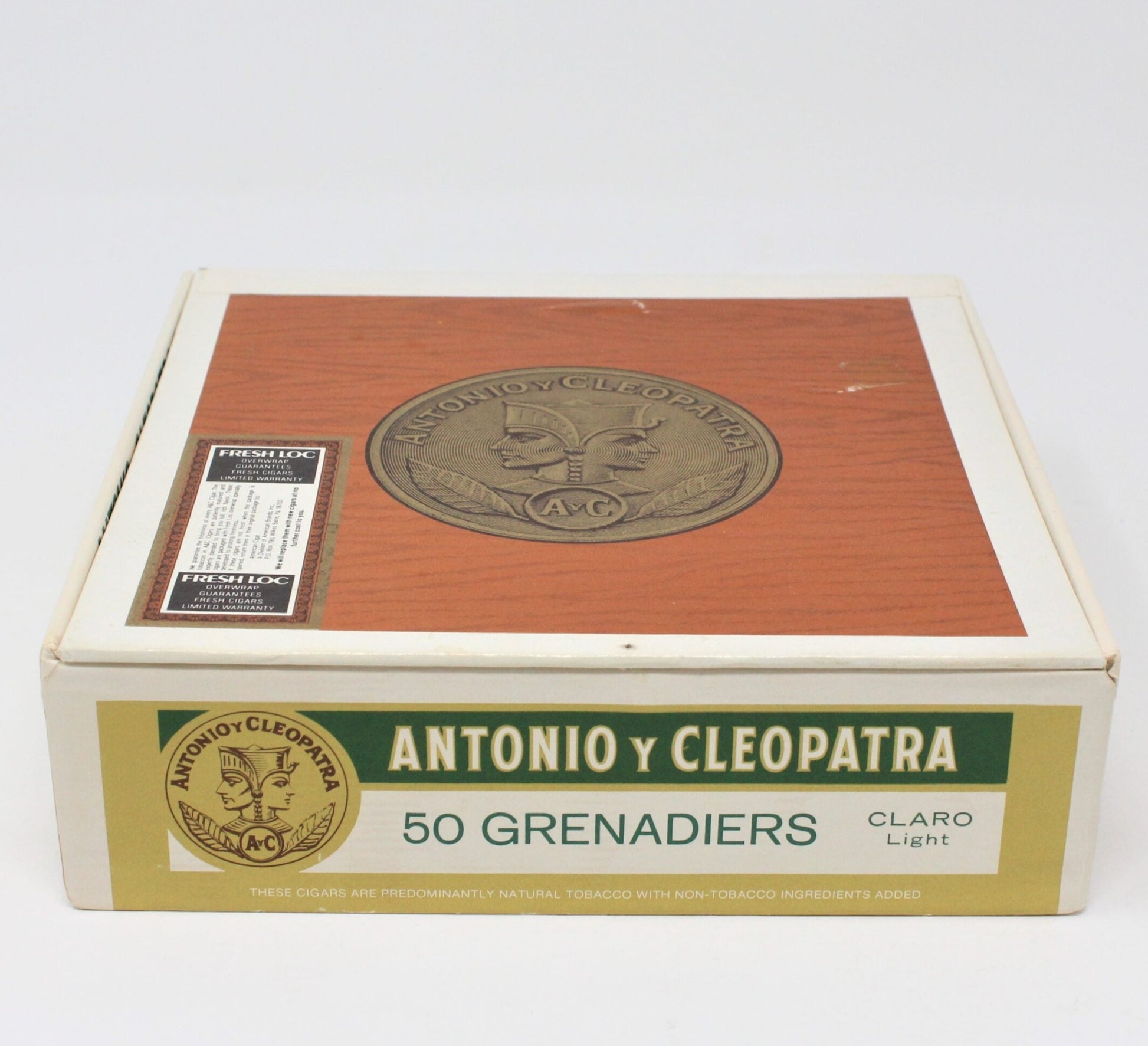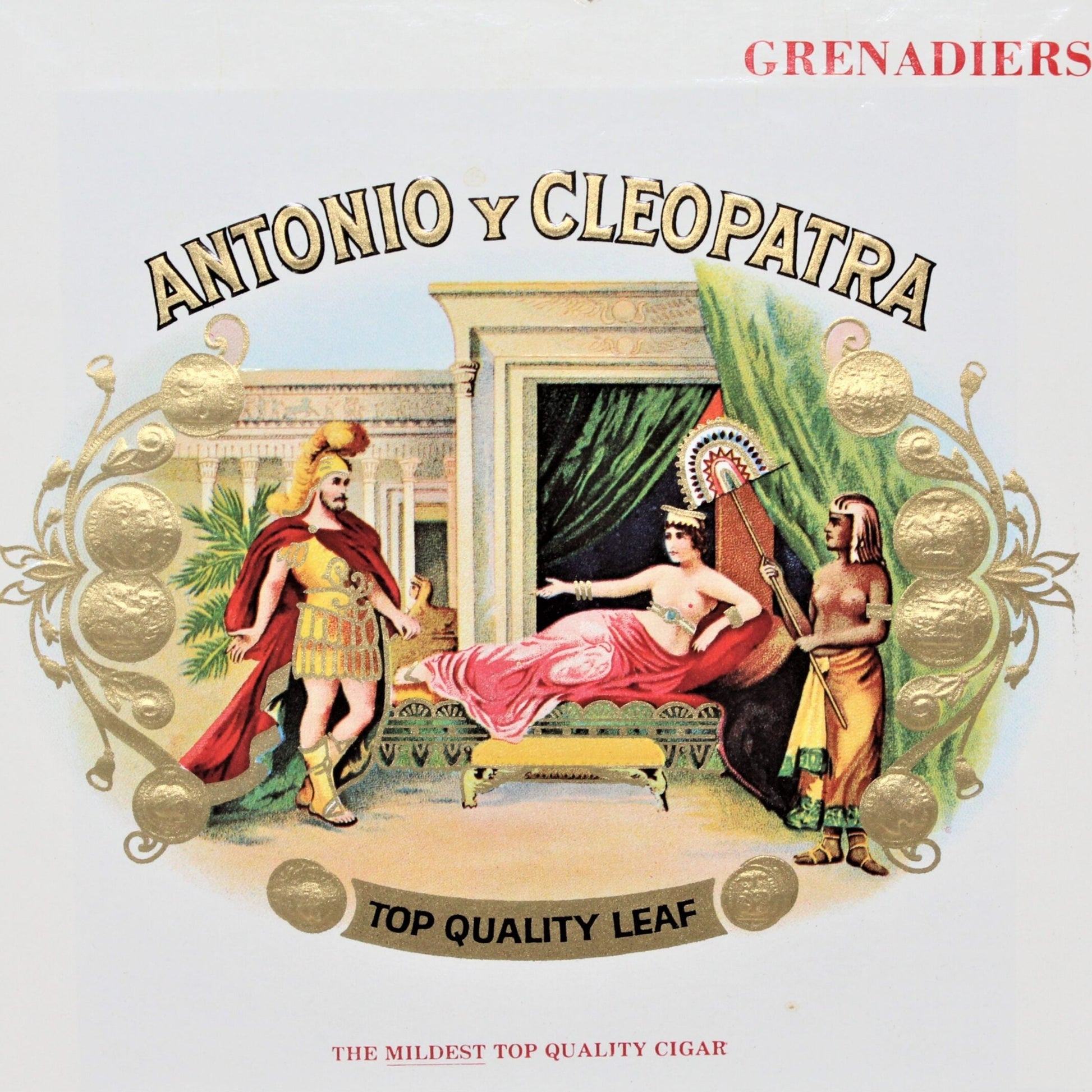 - Details: This box of Antonio Y Cleopatra Grenadier cigars is simple on the outside, a coin with Antonio and Cleopatra's profiles and tobacco leaves below. When the box is opened, you find a gorgeous, heavily embossed and gilded label, with a very detailed scene of Marcus Antonius and Cleopatra. She's laying on a very regal looking chair and he's standing by her side. The box is marked on the bottom: "American Cigar, A Division of American Brands Inc., New York, NY 10167". This helps us date the box somewhere between 1970 - 1980, perhaps early 1990's, since American Cigar sold their tobacco operations in 1994. This is a great collector's item for a cigar aficionado or collector. In the family room it makes a nice storage piece for remote controls, note pads and pens. Great for corralling small items, we use our cigar boxes to store playing card decks and games like UNO, Old Mail and Jacks. In the bar it can store bottle openers, wine stoppers, coasters, etc.
