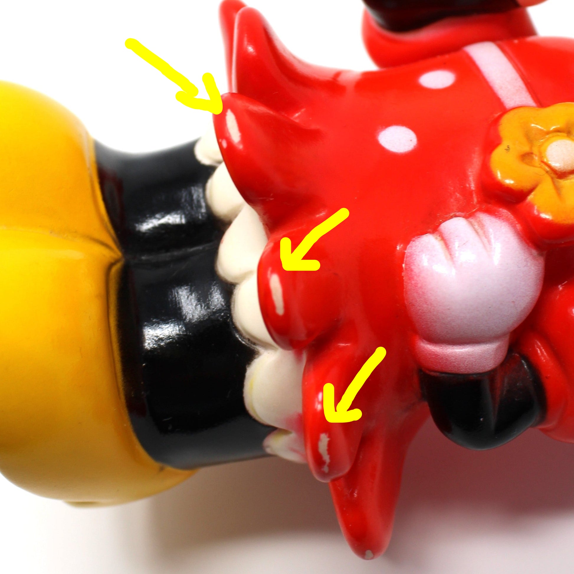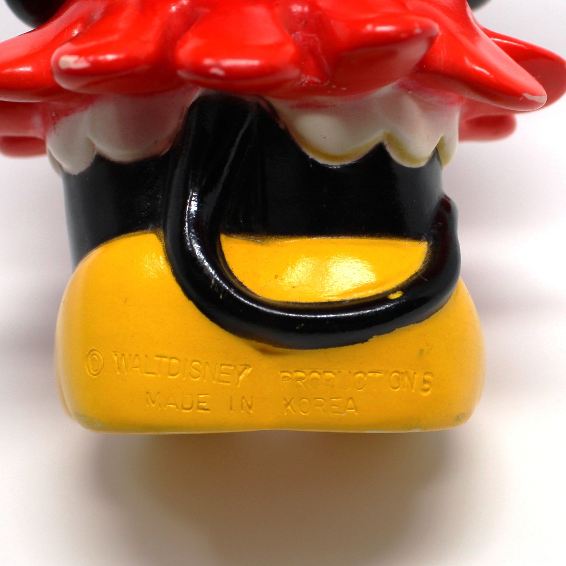 - Details: This classic Disney Minnie Mouse coin bank will bring charm to any space. Crafted from durable hard plastic, this colorful collectible features Minnie's iconic happy smile and a posable, movable arm. It retains the original stopper to keep coins secure, making it perfect for young savers or Disney enthusiasts building their collection. It's marked on the back, "Walt Disney Productions and Made in Korea". This helps us date it circa 1970s-80s. There are some condition issues, please see below for details. A delightful addition to kids' rooms, nurseries, or anywhere nostalgia meets whimsy. Great gift for a Disneyana collector.