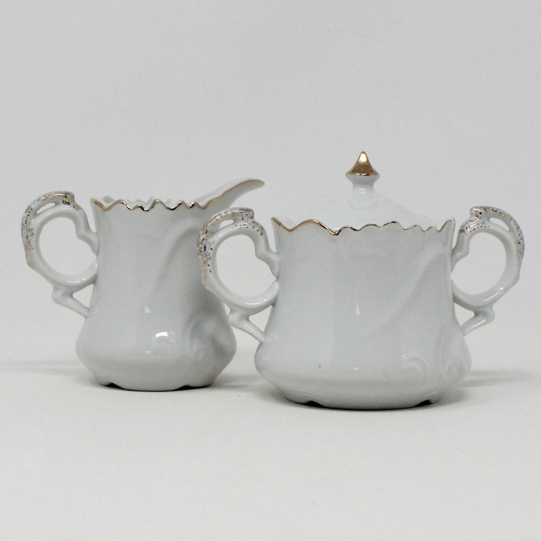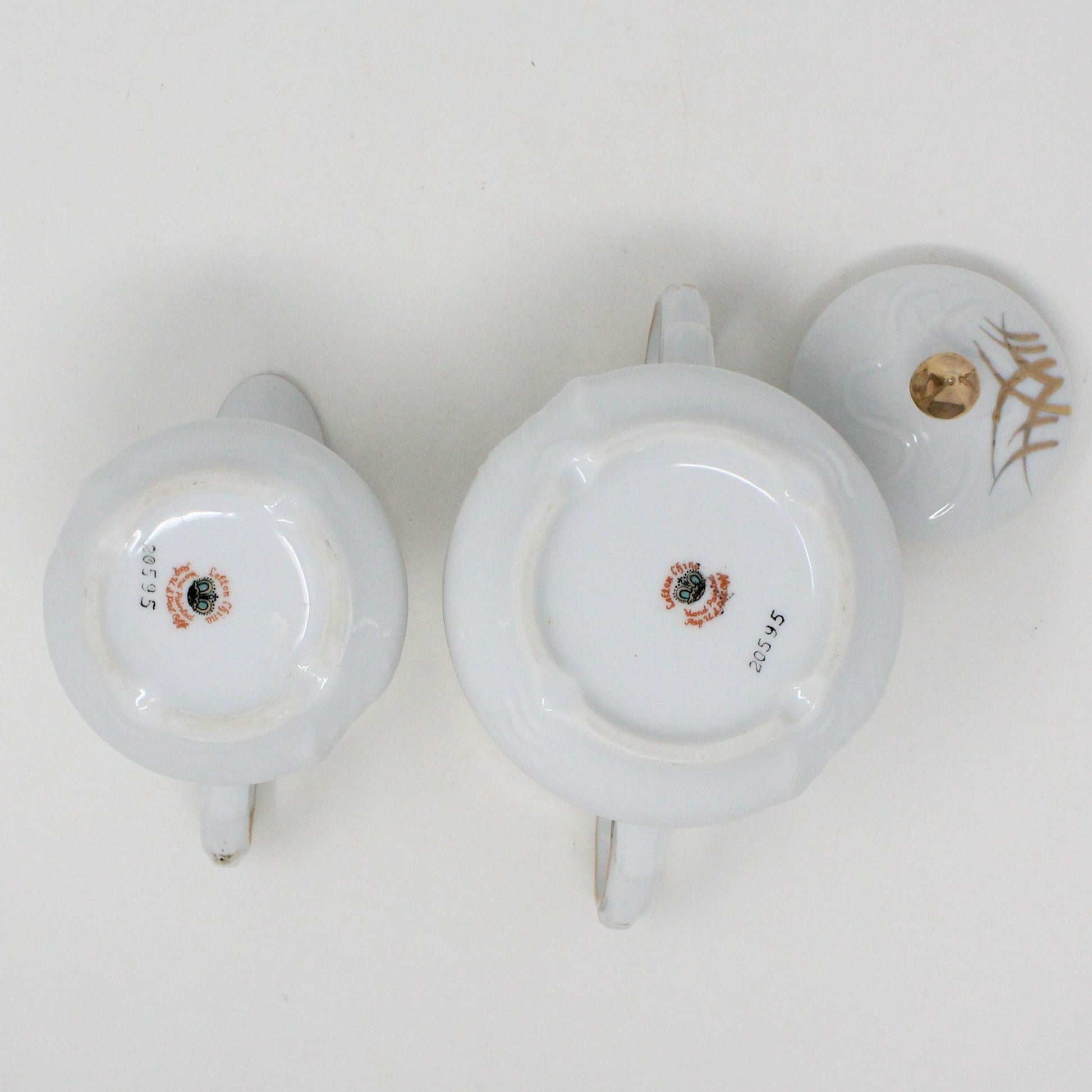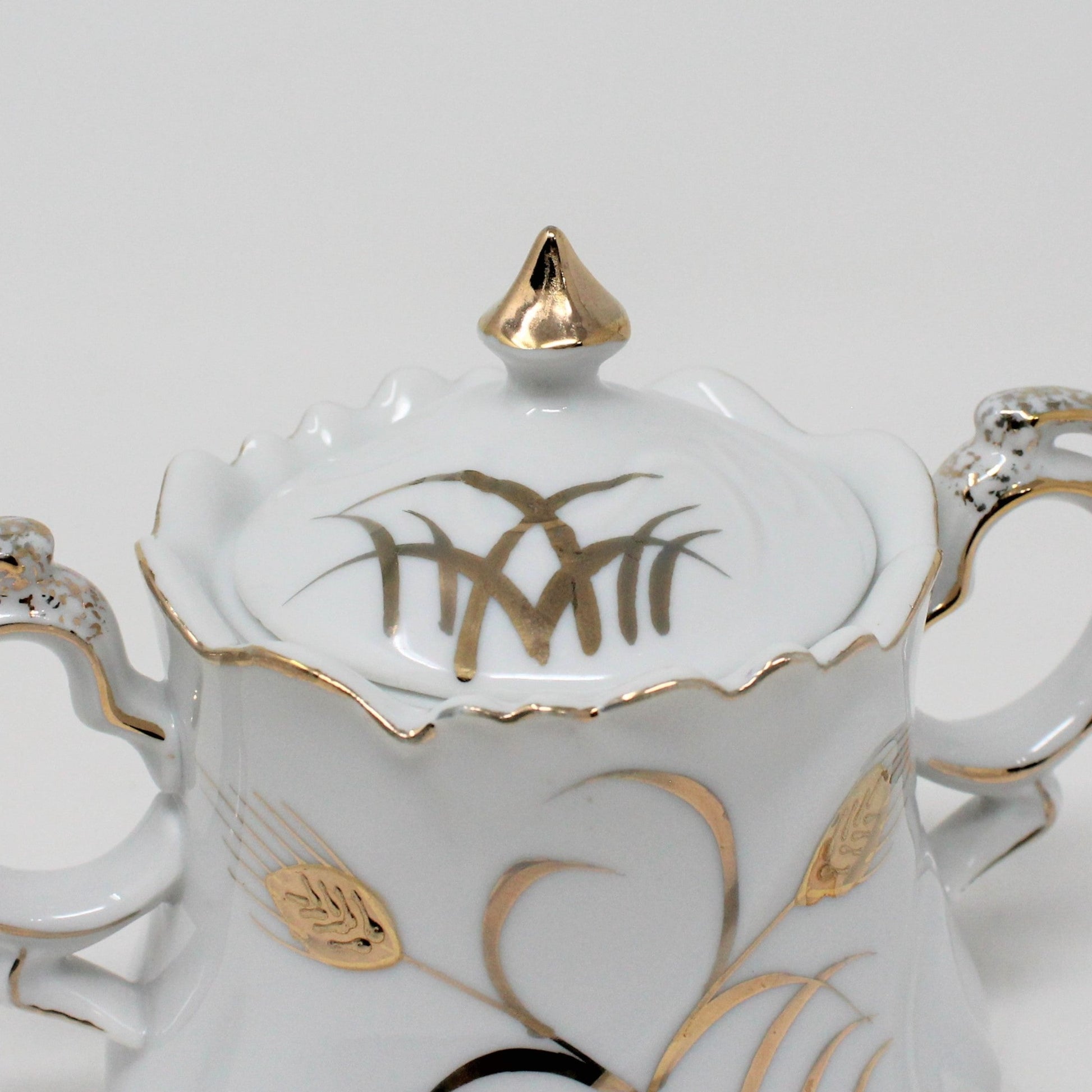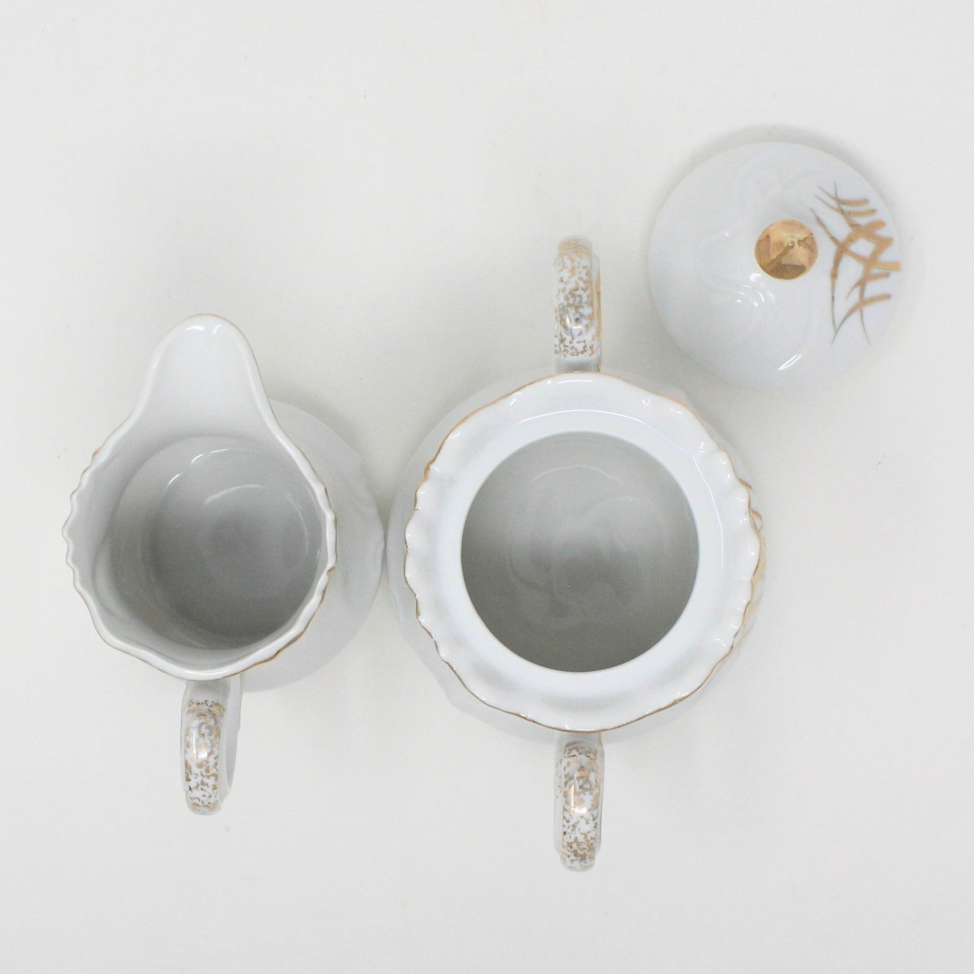 - Details: This is such a pretty set of creamer and sugar! They are delicate and beautiful with gold wheat stalks and other gold accents. The sugar bowl has a lid as well as two handles, a gorgeous "picket fence" cut rim and embossed body, just beautiful! The creamer has the same gold wheat stalks and a embossed body. These pieces are high quality porcelain, very translucent. Based on the backstamp, we can date them to between 1953 and the 1960's. The stamp reads: "Lefton China, Hand Painted, Reg. U.S. Pat. Off." and has a the Lefton crown in blue and gold and pattern number "20595". Lefton sold 3 slightly different "Wheat" patterns, the differences are minor but noticeable. Pattern #20/83 (which we also carry), has lots more embossing (swirls) on the body, and 3 wheat stalks, also the rims are smoother, swirled. This pattern, #20595, has only 2 wheat stalks, the rims are sharper, pointier, like a picket fence, and the handles are very ornate. Pattern #2153 is the least ornate, sleeker, more plain, some would say, more modern. They are all beautiful, just depends on your taste. This listing is for pattern #20595, and in great condition. Perfect as a hostess gift, a bridal shower gift or for your own enjoyment!