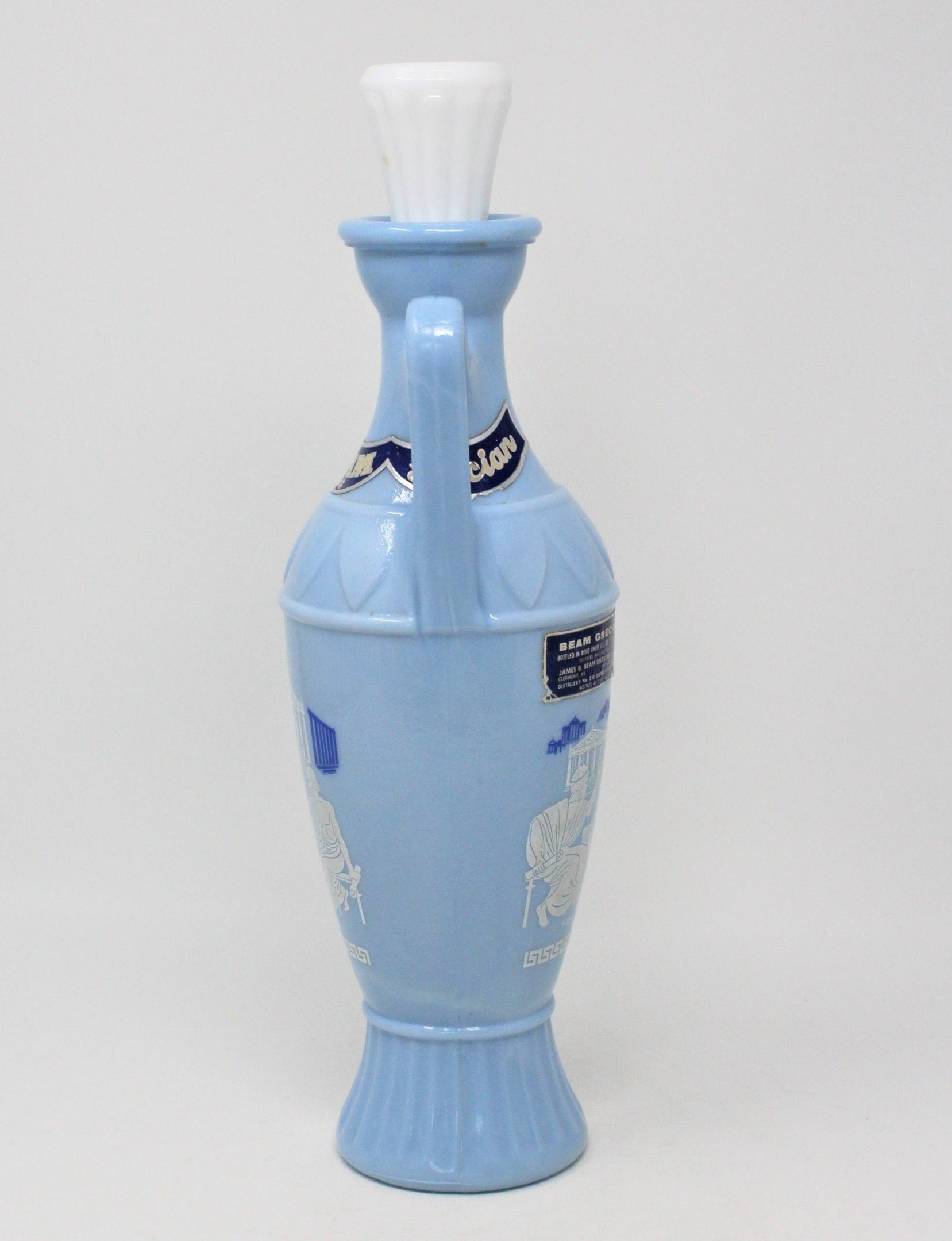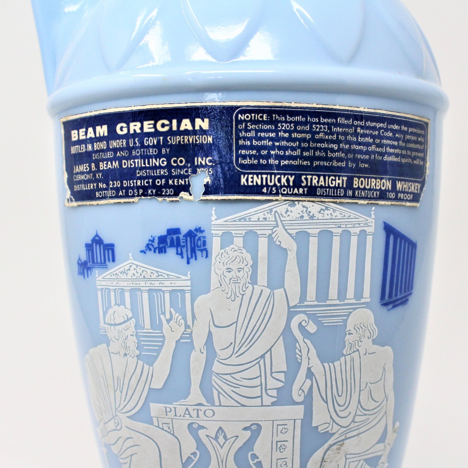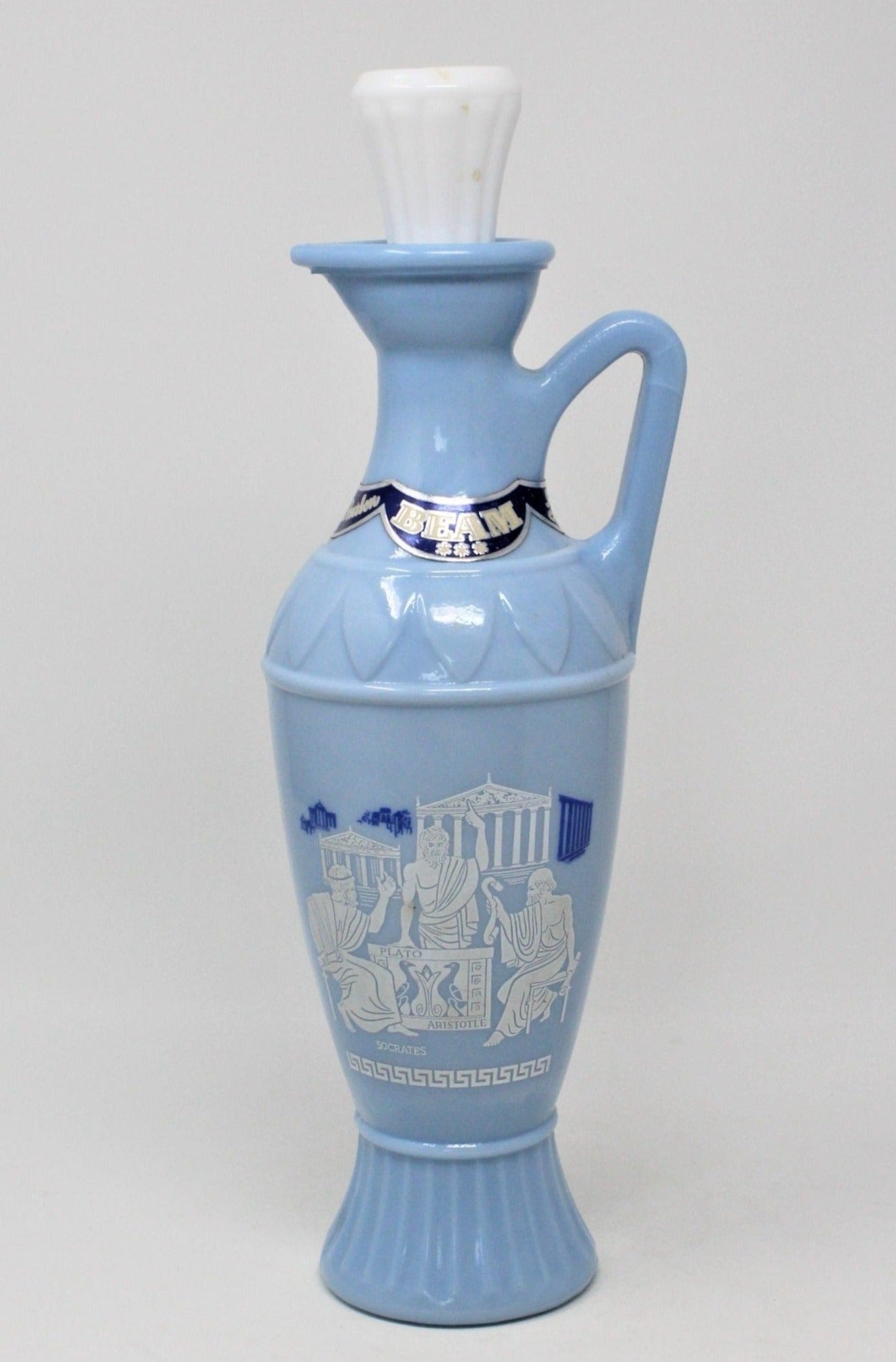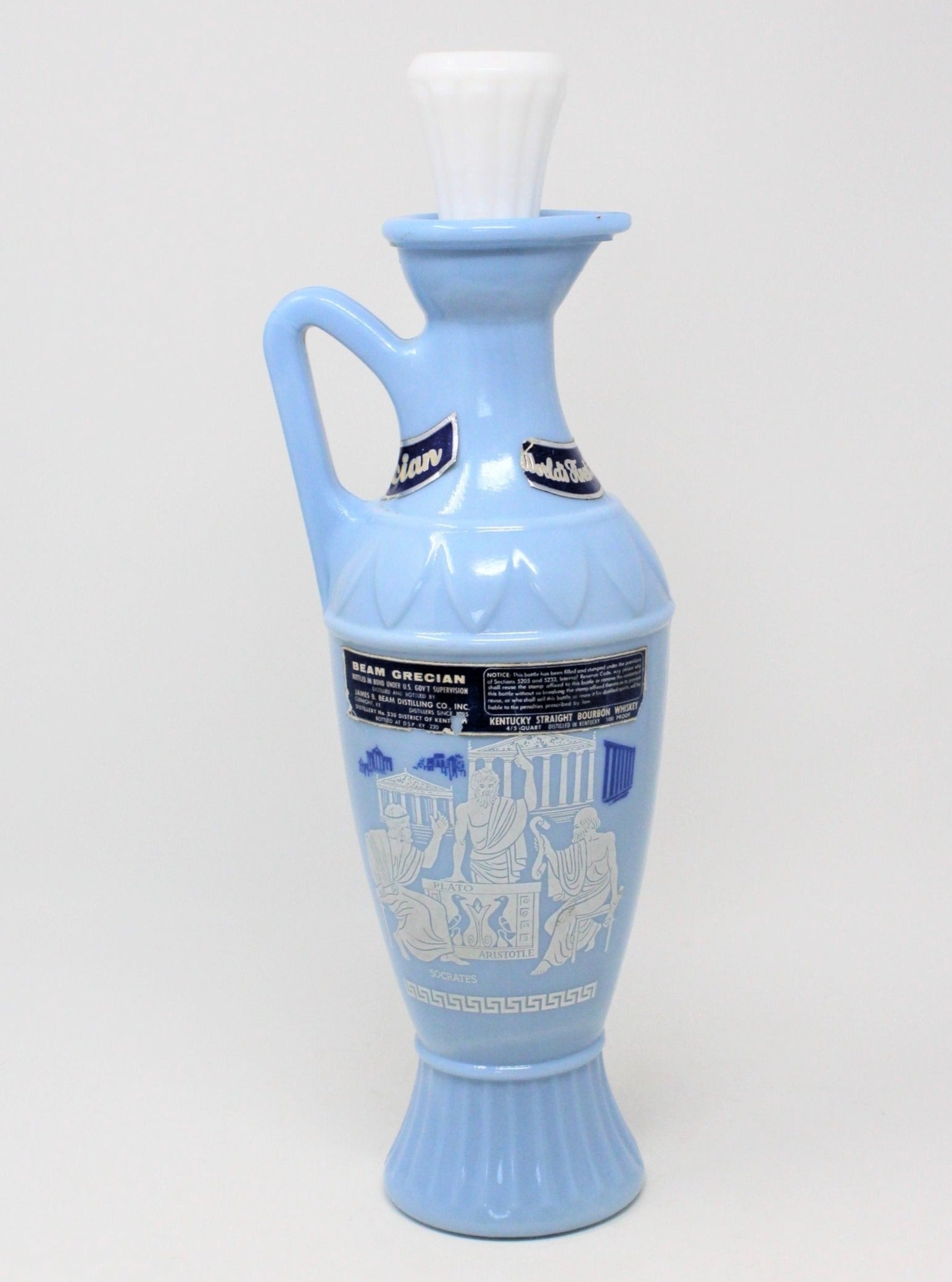 - Details: A beautiful and collectible decanter by Jim Beam. This decanter is shaped like an Old World Grecian Pitcher that was used to carry and serve wine. It is a blue milk glass with a wonderful white enamel decoration of the three greatest Greek Philosophers: Socrates, Plato, and Aristotle, (no doubt discussing The Socratic Problem), with a Greek Key border below. It has a very nice white milk glass stopper. This bottle was originally sold with Kentucky Straight Bourbon Whiskey, (now empty). The decanter retains its original blue foil label around the neck that reads: "World's Finest Bourbon, BEAM, Grecian". It also has the paper label on the back with all the information about this bourbon. Gorgeous gift for a collector, historian, a philosopher, or anyone who admires Greek history. Makes a wonderful decor for a bar or study.