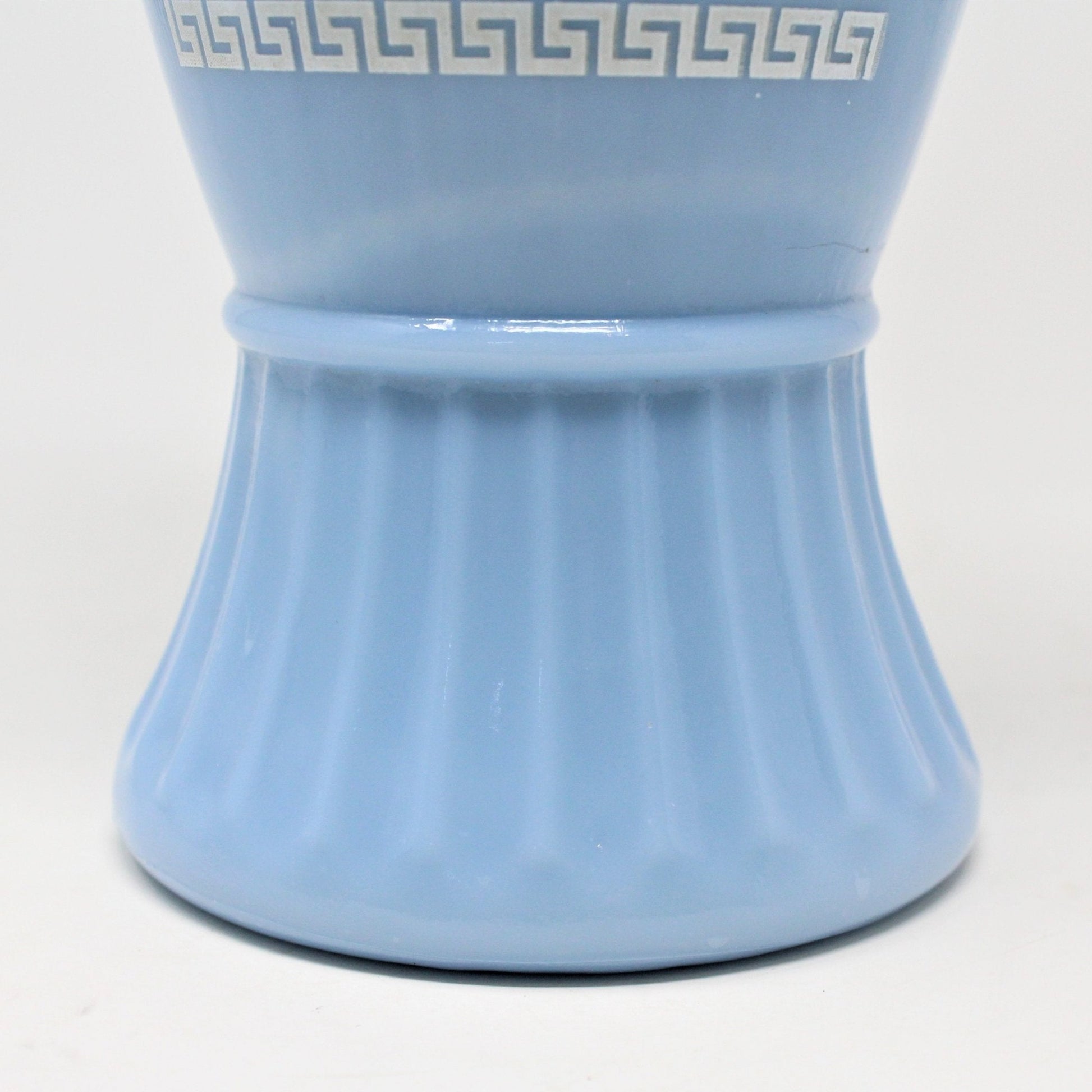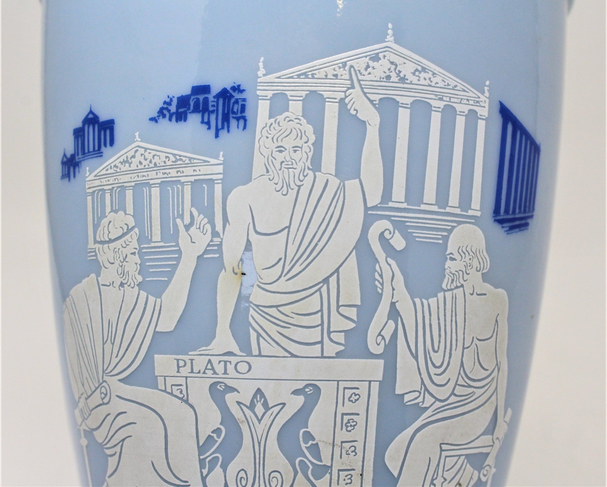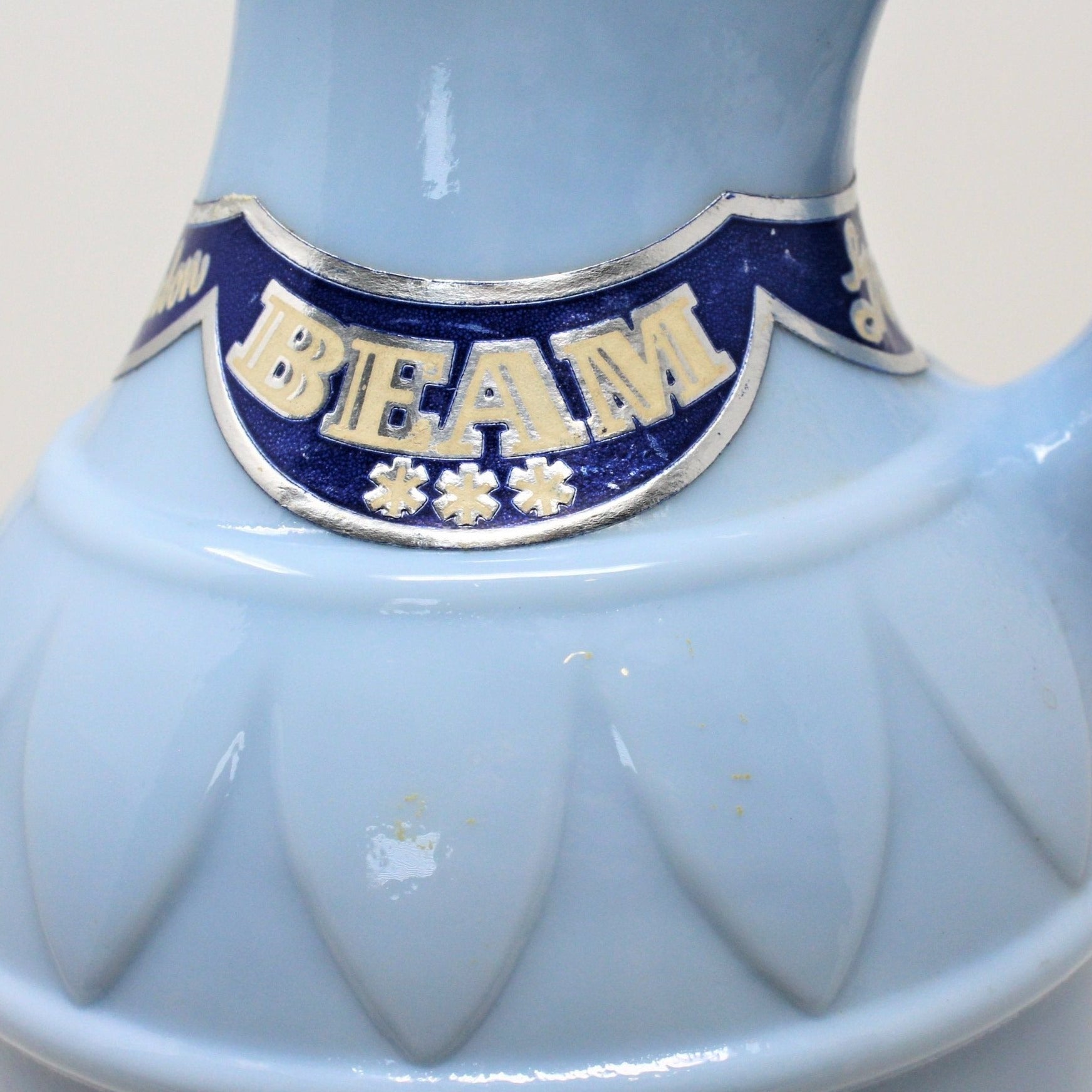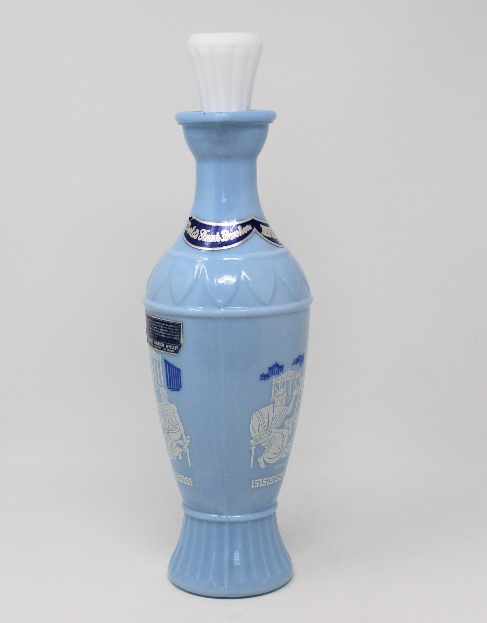 - Details: A beautiful and collectible decanter by Jim Beam. This decanter is shaped like an Old World Grecian Pitcher that was used to carry and serve wine. It is a blue milk glass with a wonderful white enamel decoration of the three greatest Greek Philosophers: Socrates, Plato, and Aristotle, (no doubt discussing The Socratic Problem), with a Greek Key border below. It has a very nice white milk glass stopper. This bottle was originally sold with Kentucky Straight Bourbon Whiskey, (now empty). The decanter retains its original blue foil label around the neck that reads: "World's Finest Bourbon, BEAM, Grecian". It also has the paper label on the back with all the information about this bourbon. Gorgeous gift for a collector, historian, a philosopher, or anyone who admires Greek history. Makes a wonderful decor for a bar or study.