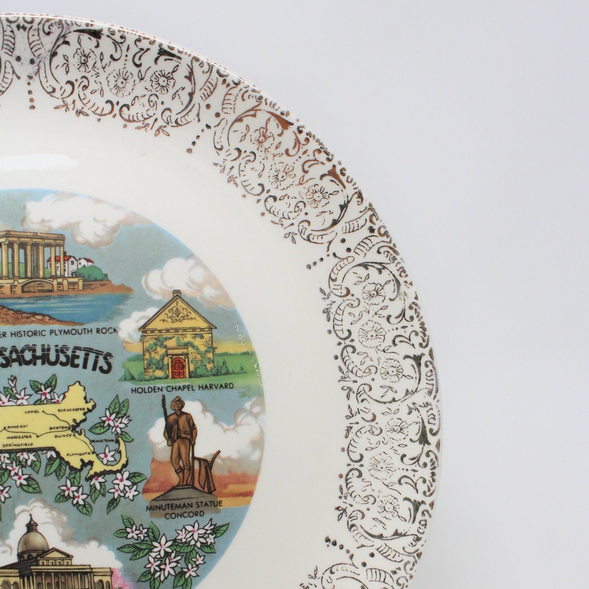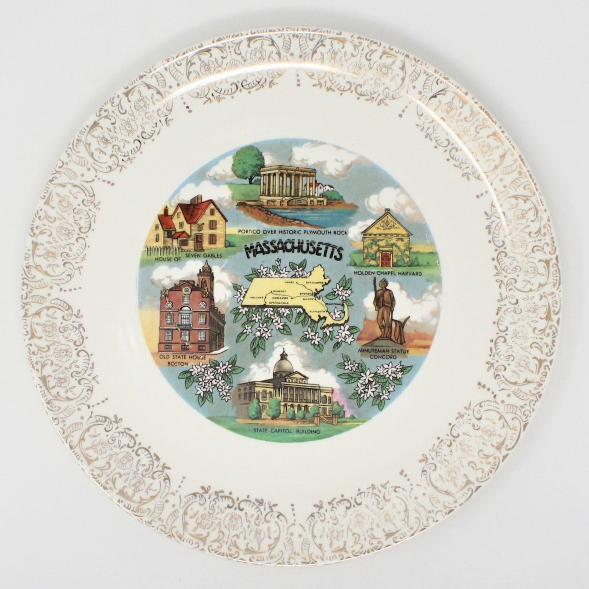 - Details: This is a beautiful plate, and part of a very large Souvenir State Plate Collection made in the 1950's by several potteries like: Homer Laughlin, Vernon Kilns, Salem China Co and others. This plate is unmarked but after reviewing plate designs from several manufacturers, we are thinking this is most likely an unmarked Homer Laughlin plate. The plate has a beautiful gold floral filigree. It has the name "Massachusetts" written in an old fashioned block font and the state map in the center. The plate features several points of interest like: Old State House Boston, State Capitol Building and the Minuteman Statue. This is a great addition to a state plate collection. Great gift for someone moving to the state of Massachusetts, or a birthday gift for someone born in that state. Or collect them for yourself for states you've visited or lived in. We carry several other plates, if you would like 3 or more Decorative Plates (mix and match from our entire Decorative Plates section), please Contact Us for 20% off, don't forget to let us know which 3 plates you would like.