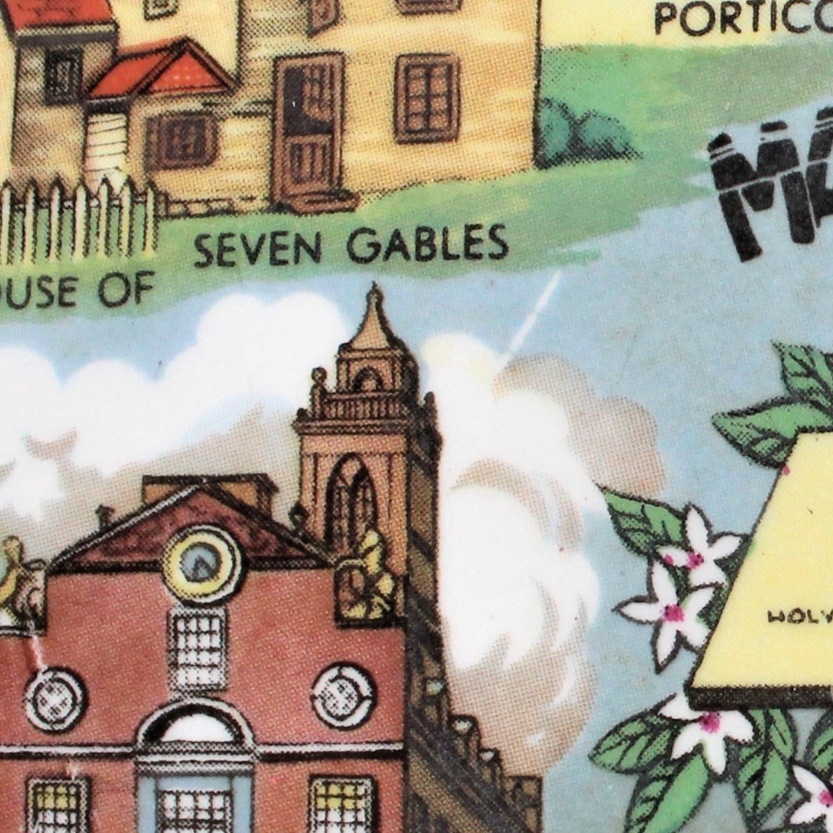 - Condition: Vintage - Used. Very Good Condition. There is a very small scratch below the House of Seven Gables, photographed for you, we could find no other issues. These were souvenir plates and not considered high quality, this is really in great condition considering age. There may be other issues as acceptable due to age/use/wear. Please review all pictures and make sure you love this item before purchasing, we can't accept returns. Please remember these are VINTAGE and ANTIQUE items, they are Not New, every effort has been made to show any scratches, wear and tear and imperfections.