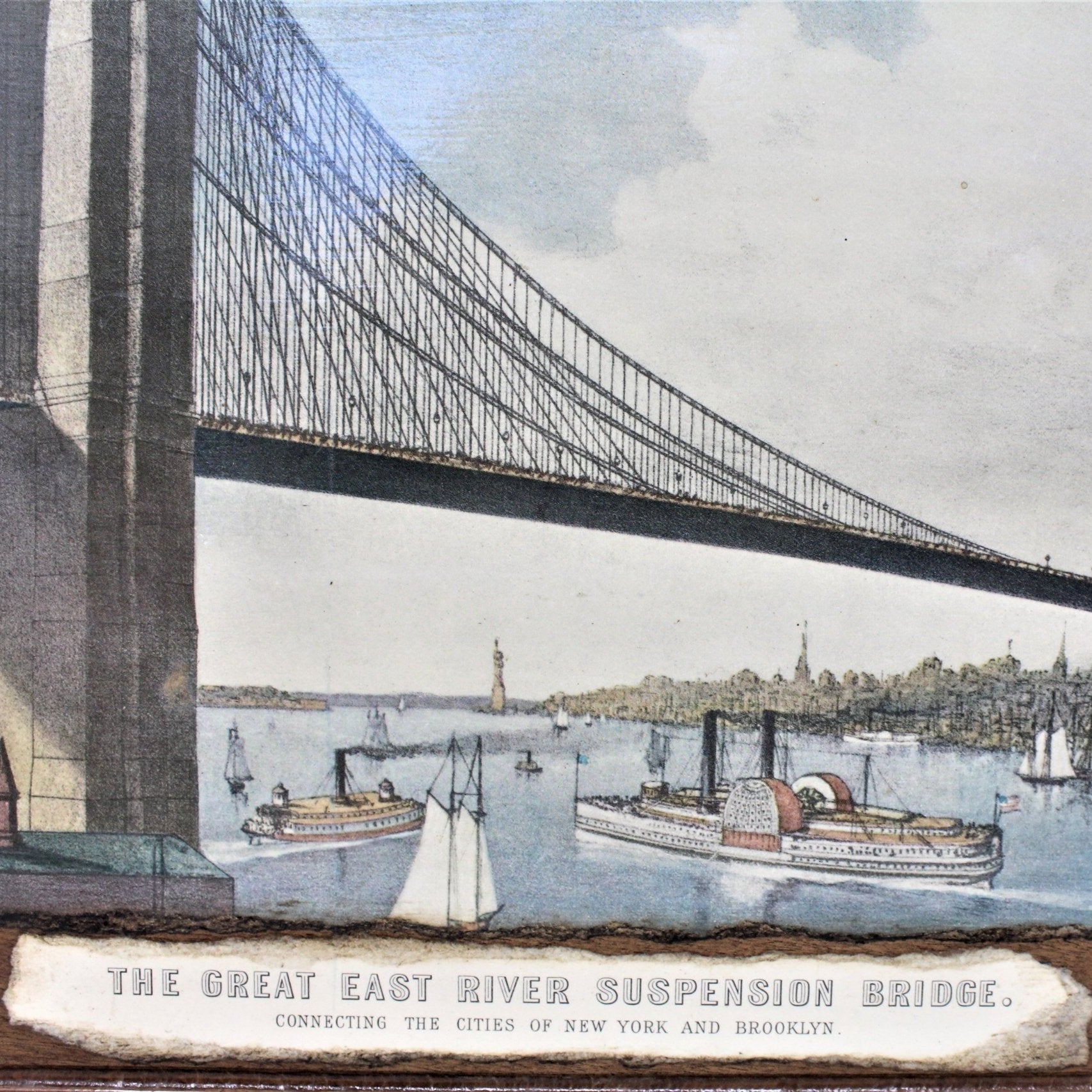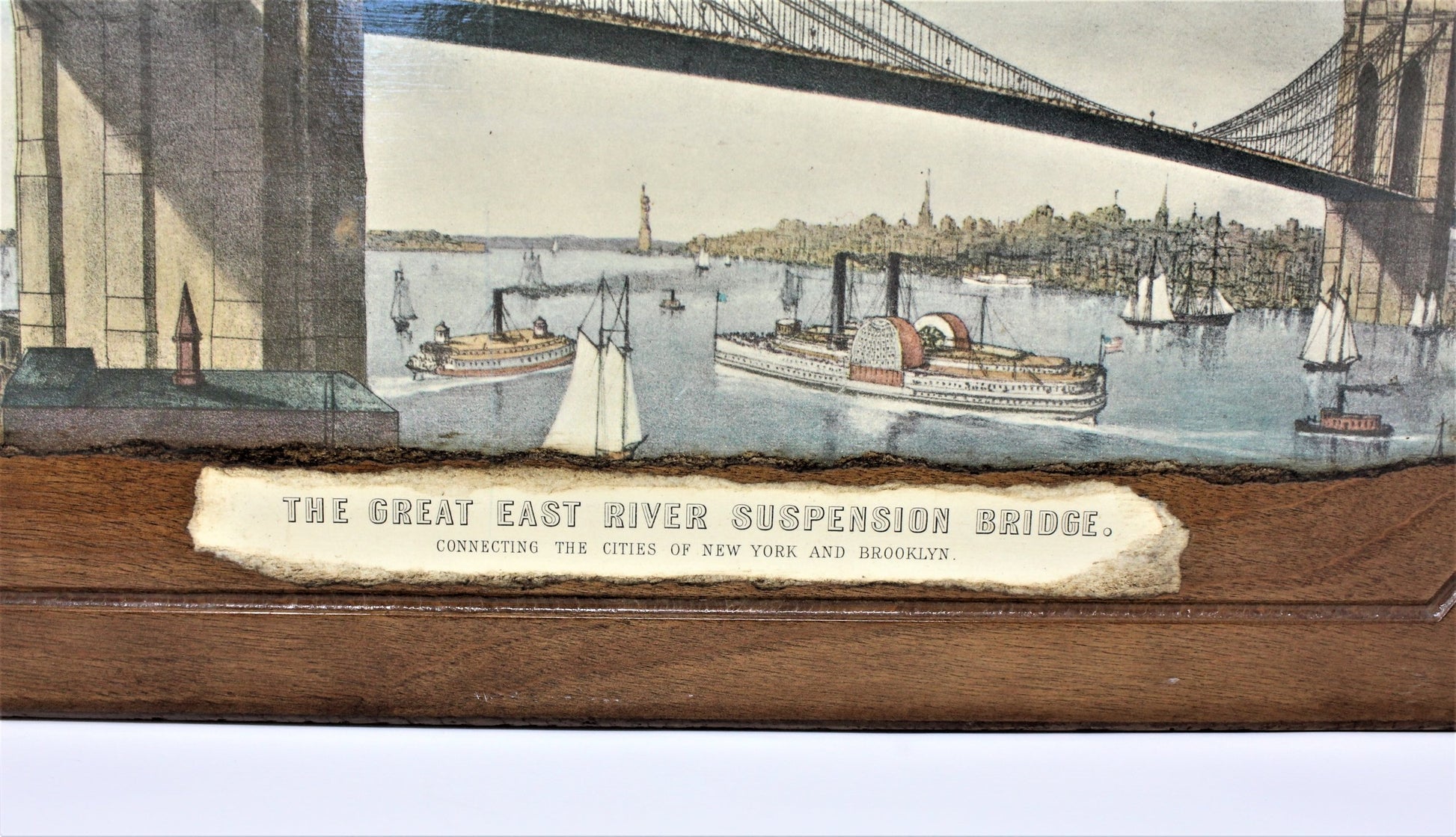 • Details:  This style of decoupage art work was very popular in the 1980's and feels just as appropriate today.  This one was made using a print from a Currier & Ives lithograph copyrighted in 1881.  Currier and Ives made a few lithographs of this bridge, undoubtedly a tremendous feat of engineering at the time.  We like this image because it has both the sailboats and the steamships which really captures the era.  The print is framed in a wooden frame that has been carved and burnt to create a rough edge.  The caption on the bottom reads: " The Great East River Suspension Bridge, Connecting the cities of New York and Brooklyn".    This is Old Americana at its best, great decor in a study, office, or what about an entrance hall in a New York or Brooklyn home?!   A great gift for an Americana collector.  We have several other Currier and Ives items, please search our site if interested.  If you're gifting this item, you may want to replace the "cord" in the back with picture hanging wire.