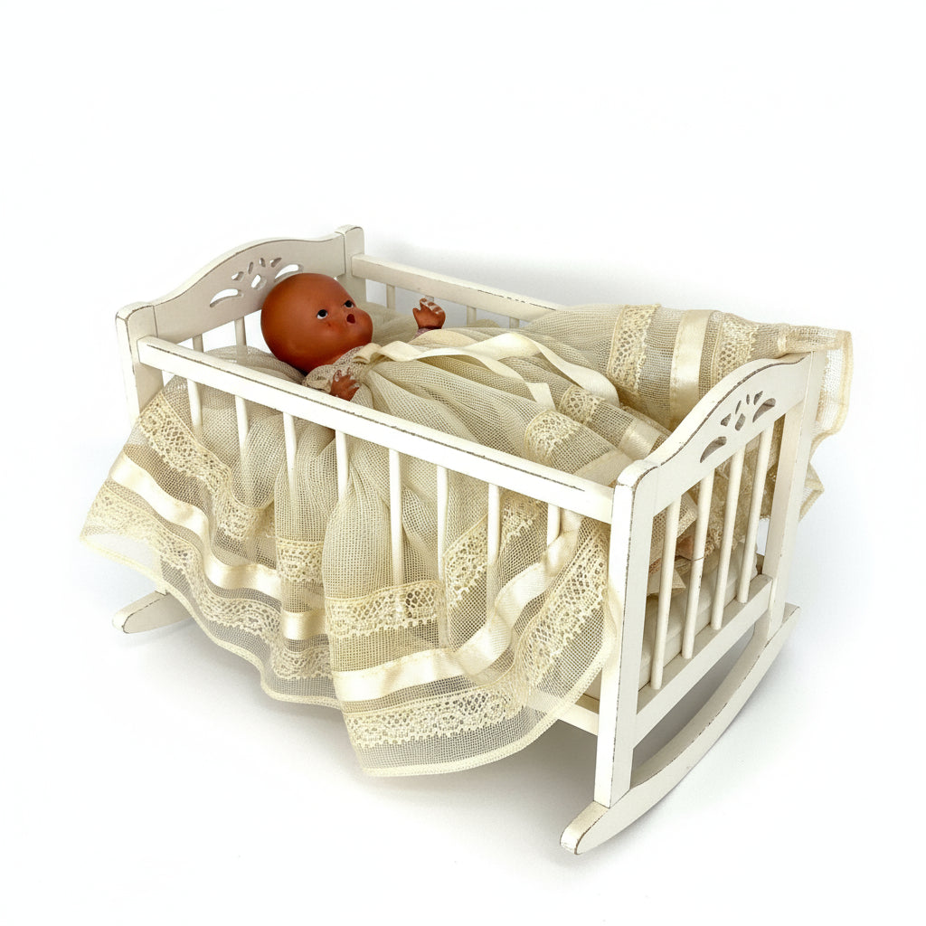 - Condition: Vintage - Pre-Owned, Never Used. Very Good Vintage Condition. The only issues noted are all due to long term storage: Fabric has yellowed, wrinkled in back. Retains original wrist tag but it's broken off, included, and original box. The box is in average condition, some yellowing, signs of wear and a couple of tears on one side. Crib in picture is a prop, NOT included. Please review all pictures and make sure you love this item before purchasing, we cannot accept returns. Please remember these are VINTAGE and ANTIQUE items, they are NOT new, every effort has been made to show any scratches, wear and tear and imperfections.
