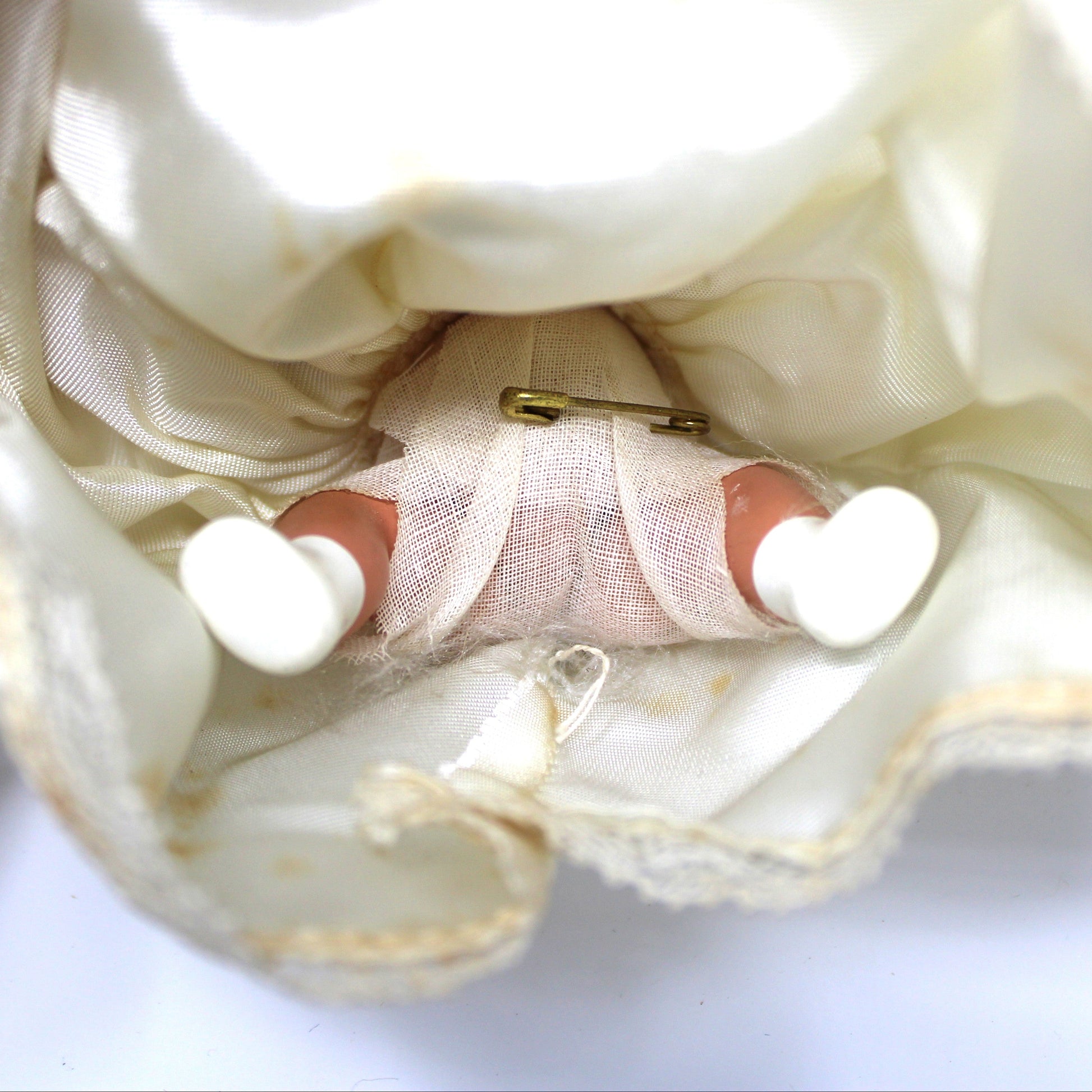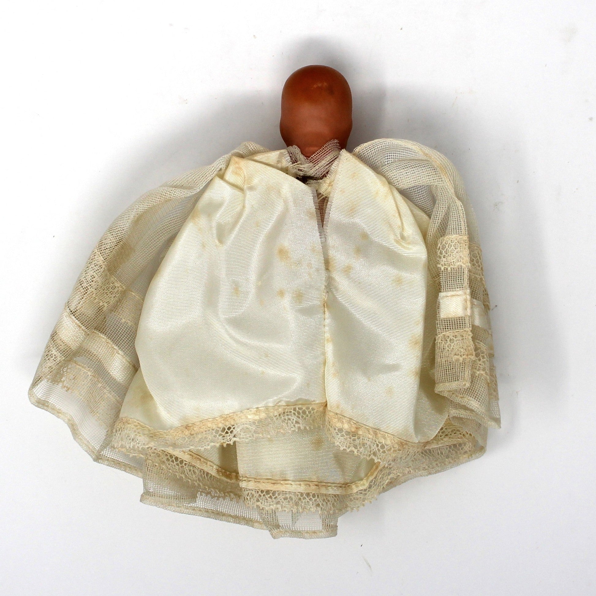 - Details: An absolutely wonderful vintage doll! From the Nancy Ann Storybook collection, part of the Commencement Series, this is the Christening baby doll #70. It retains the original wrist gold foil sticker which helped us date it, (has torn off the hand, but included in box). For further identification please consider the following: The gown is held in place with a safety pin, also the muslin diaper is held in place with a safety pin. Doll is clay with painted eyes, and painted white boots, Jointed legs at hip (Dolls with hip joints were made until 1942). It's in the original box, white with blue polka dots, marked "Nancy Ann Storybook Dolls". Crib in picture is a prop, NOT included. Never been played with, from a doll collector's estate sale.