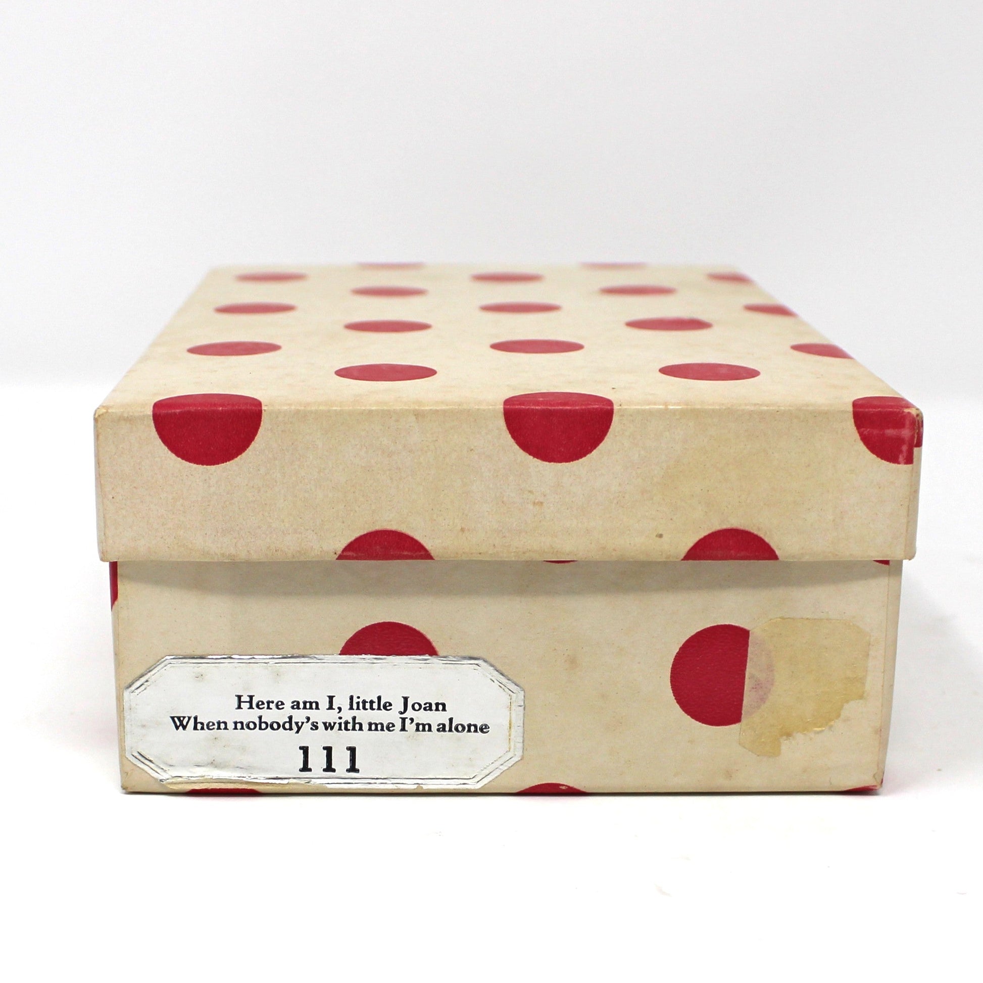 - Details: An absolutely wonderful vintage doll! From the Nancy Ann Storybook collection. This is little Joan #111. Doll retains the original wrist gold foil sticker which helped us date it, (has torn off the wrist, but included). For further identification please consider the following: The taffeta plaid dress is held in place with a safety pin, she wears white muslin pantaloons. She is bisque with painted eyes, and painted shoes. She has stiff legs and jointed arms. It's in the original box, white with pink polka dots. Never been played with, from a doll collector's estate sale.