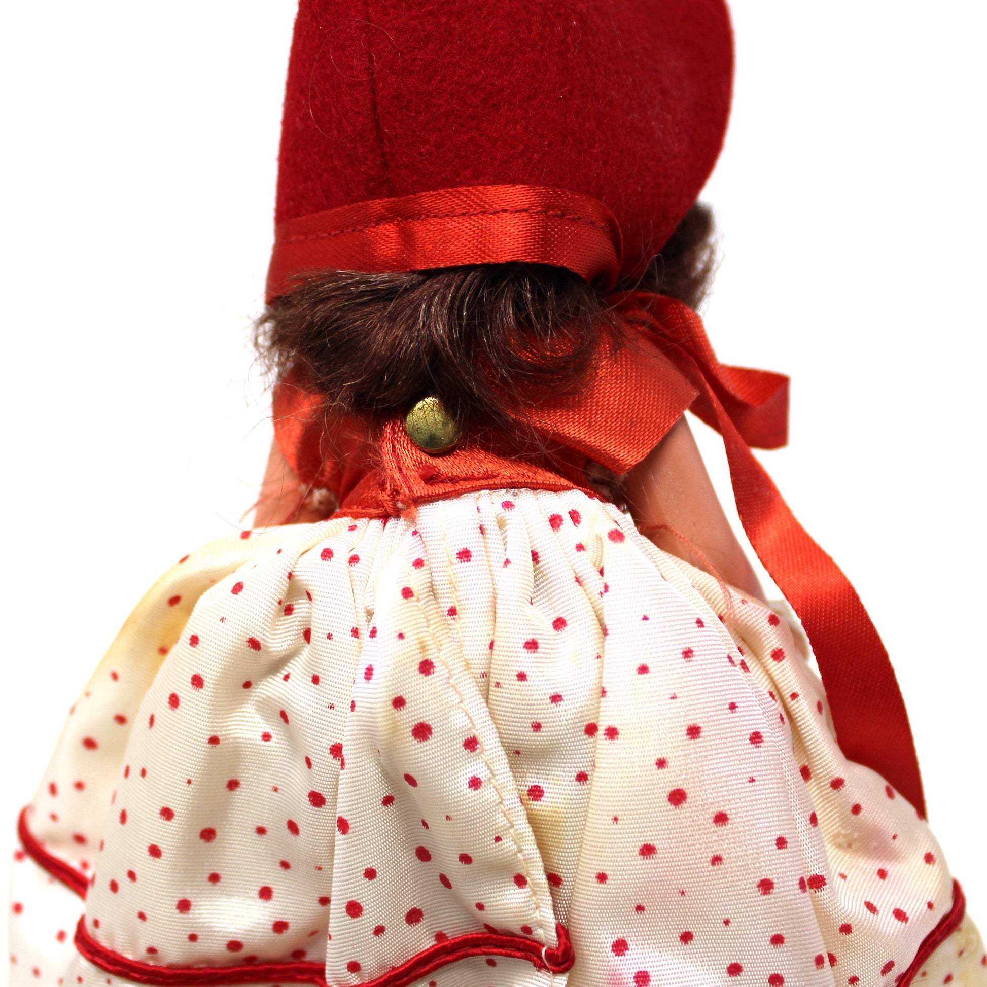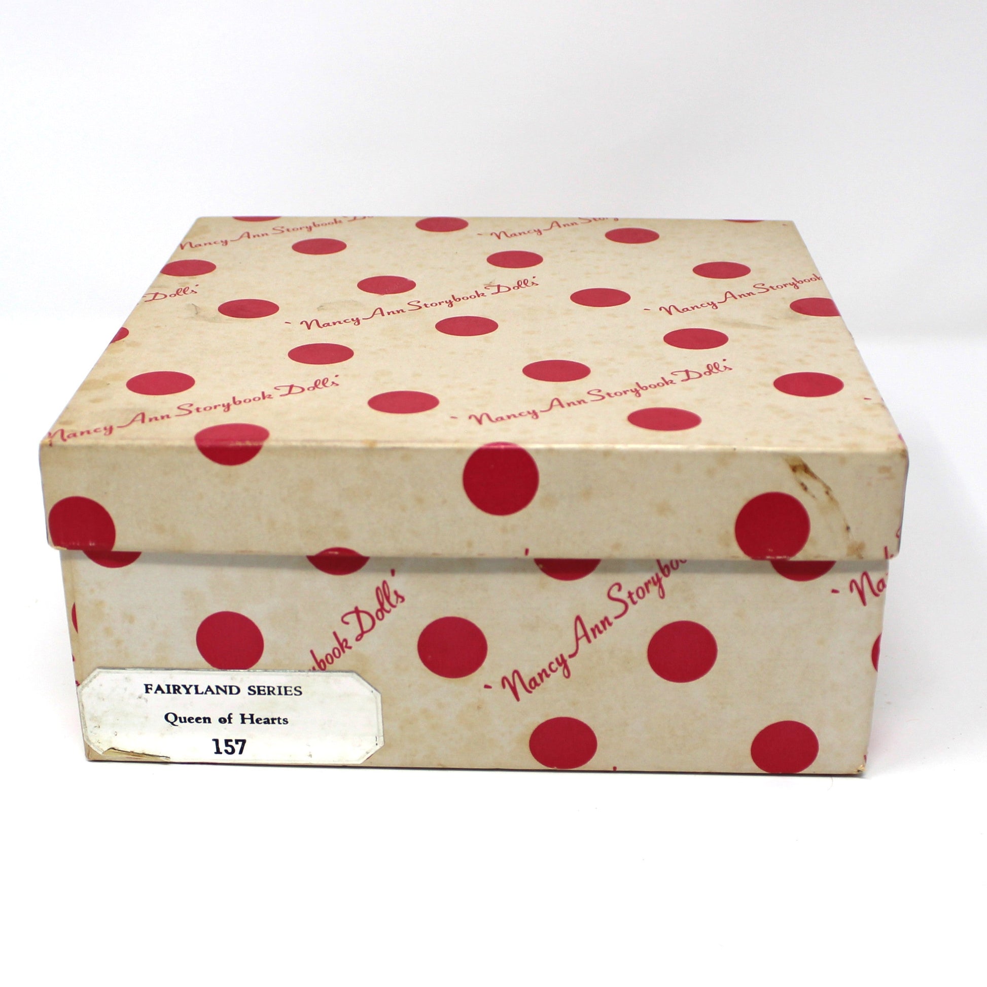 - Details: An absolutely wonderful vintage doll! From the Nancy Ann Storybook collection. This is Queen of Hearts #157. Doll retains the original wrist gold foil tag which helped us date it, (torn off the wrist, has been taped back on, not us). For further identification please consider the following: The taffeta polka dot dress is held in place with a snap button, she wears white muslin pantaloons. She is bisque with painted eyes, and painted shoes. She has jointed legs and jointed arms. It's in the original box, white with pink polka dots. Never been played with, from a doll collector's estate sale.