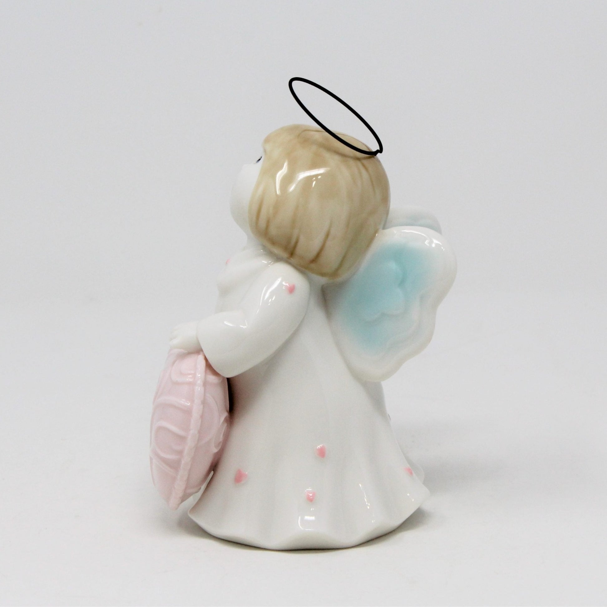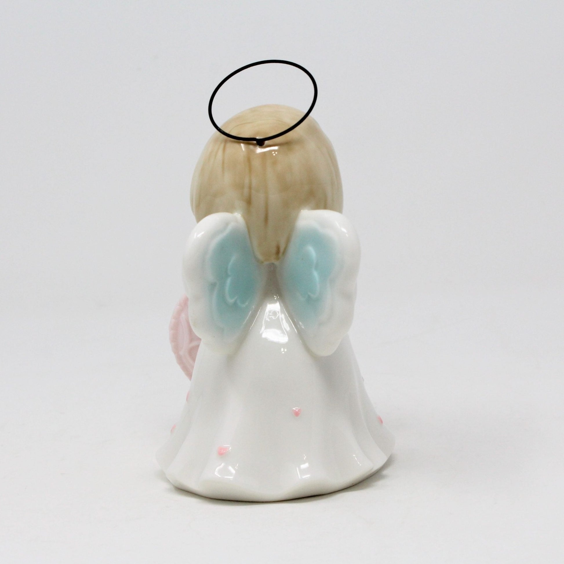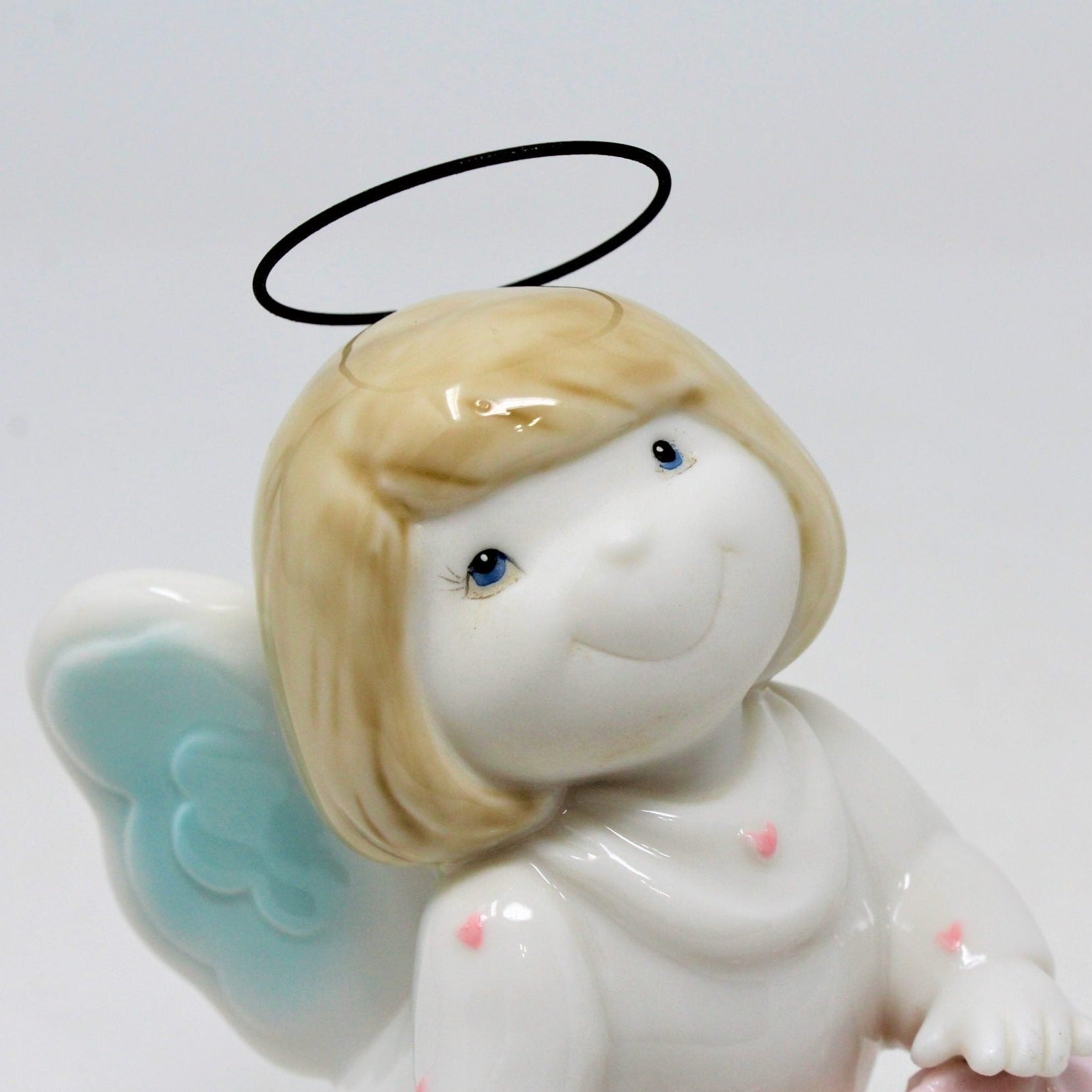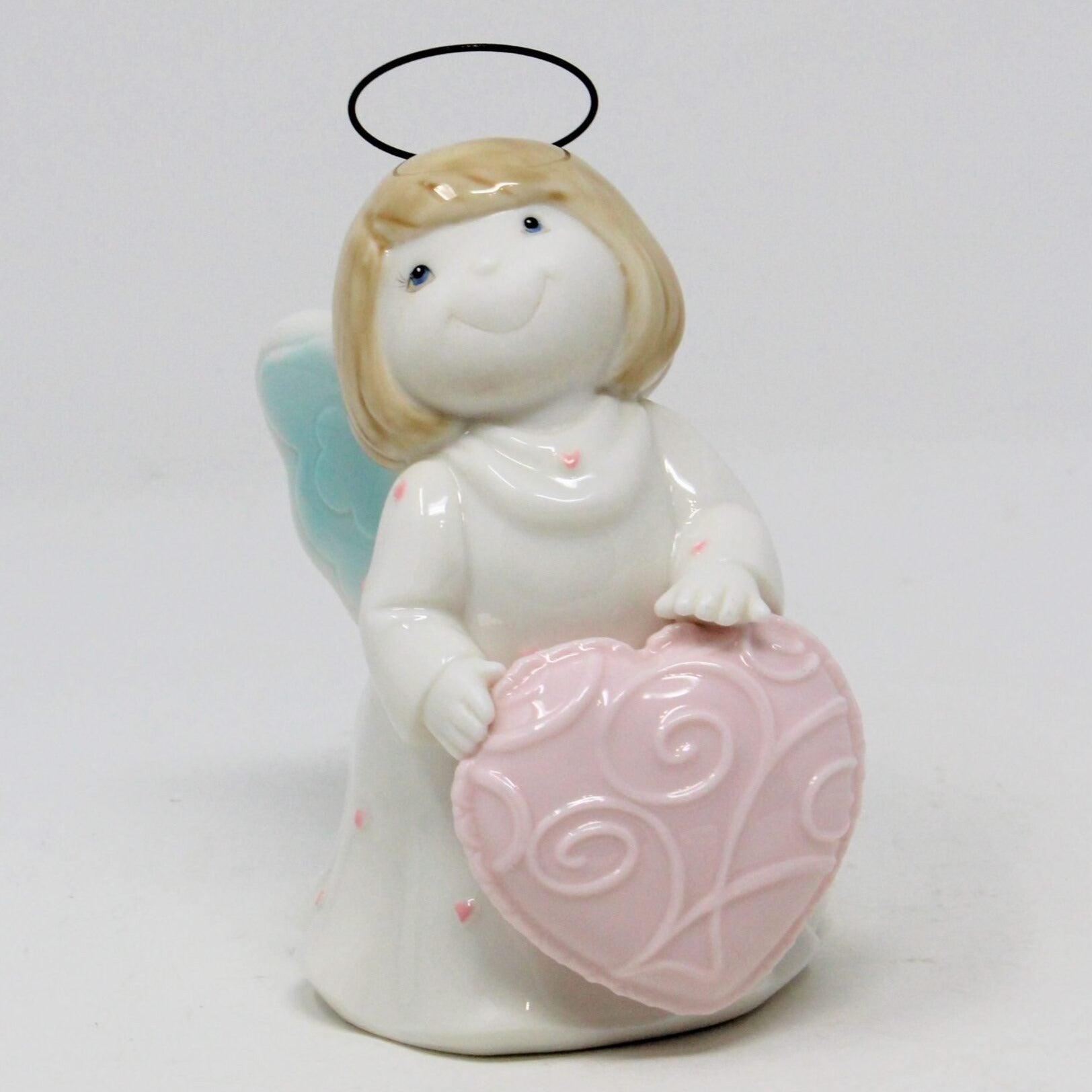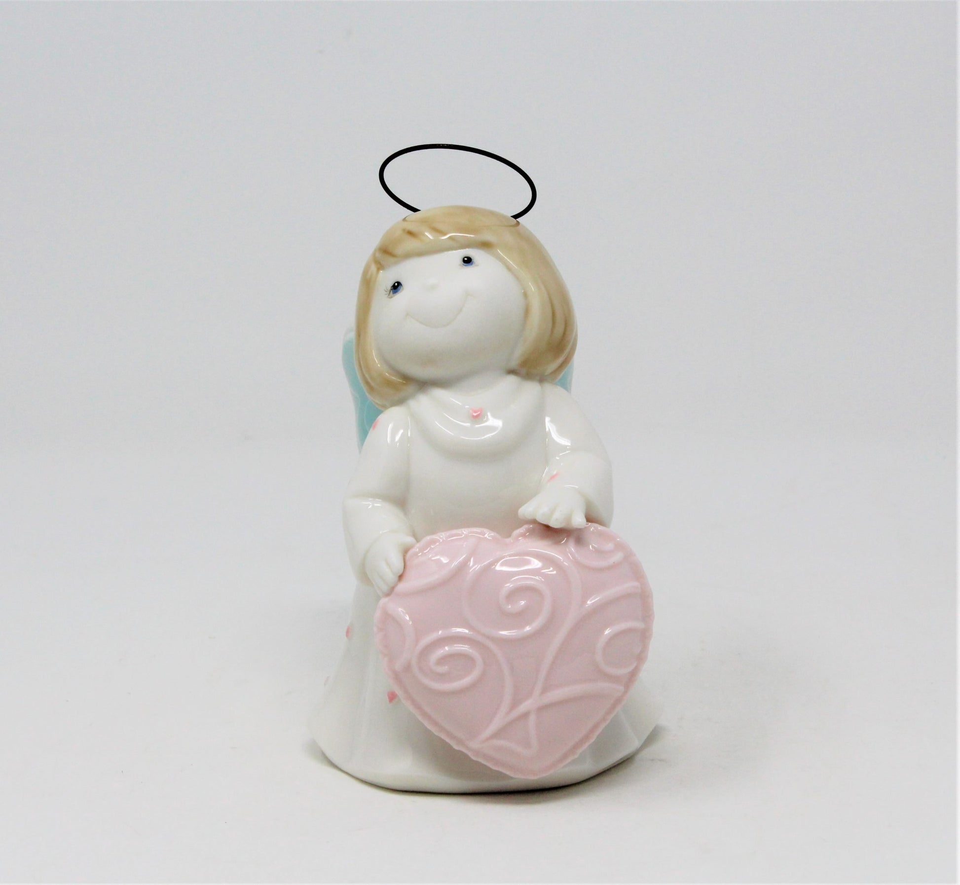 - Details: This angel has one of the sweetest faces we've seen in a long time! She is smiling right at your with sweet eyes and a large smile. She has a white gown with little pink hearts all over it and holding a great, big pink heart. Her wings are blue and white and her halo is made out of metal/wire. She's ceramic and heavy for her size. Her face and hands are matte, but the rest has a light shine glaze. Unfortunately we didn't find information on the manufacturer so we're unable to tell you much beyond the description. Perfect little angel to decorate just about anywhere.