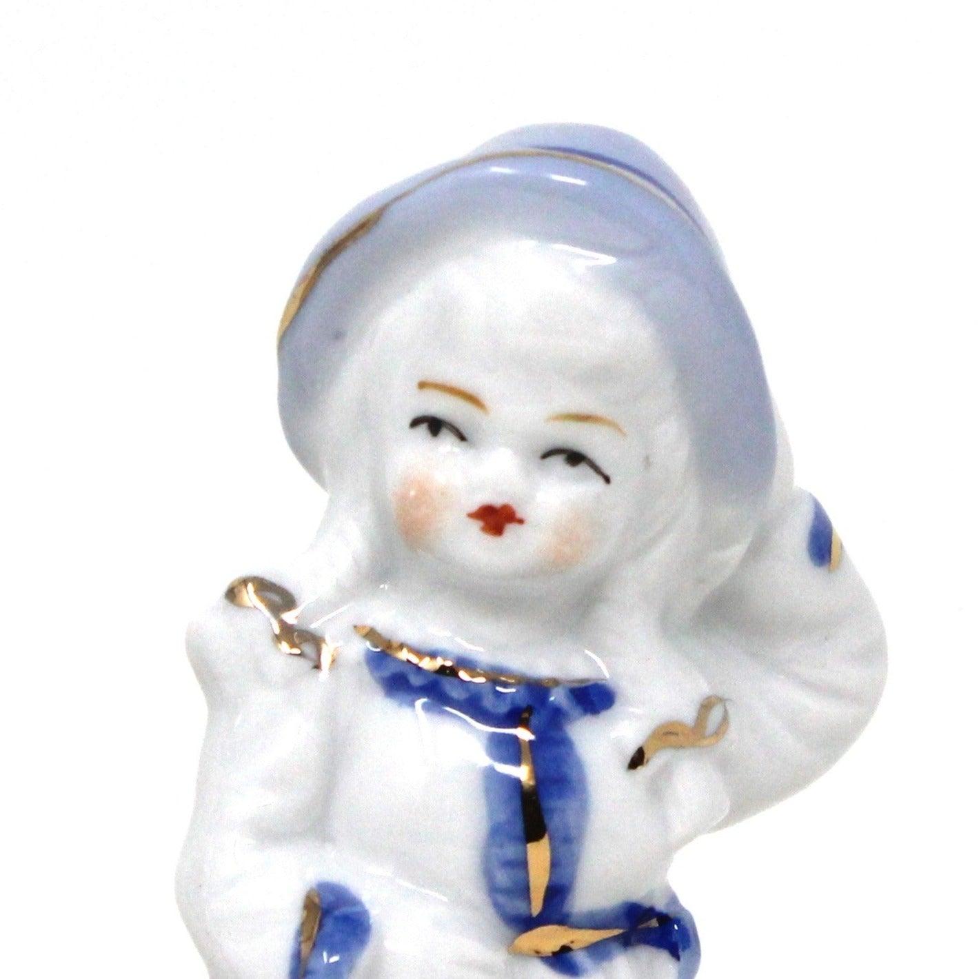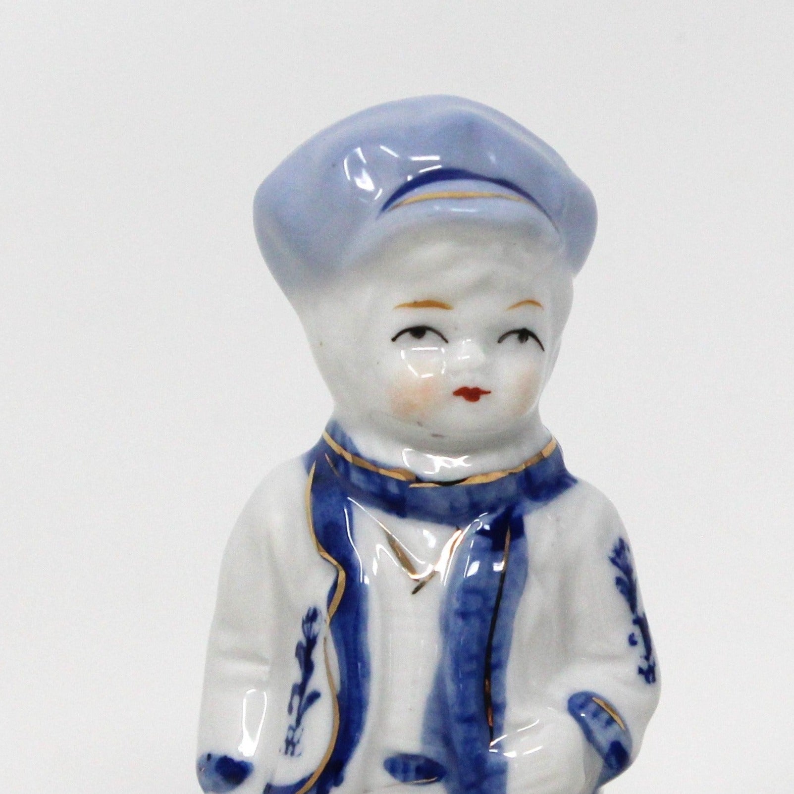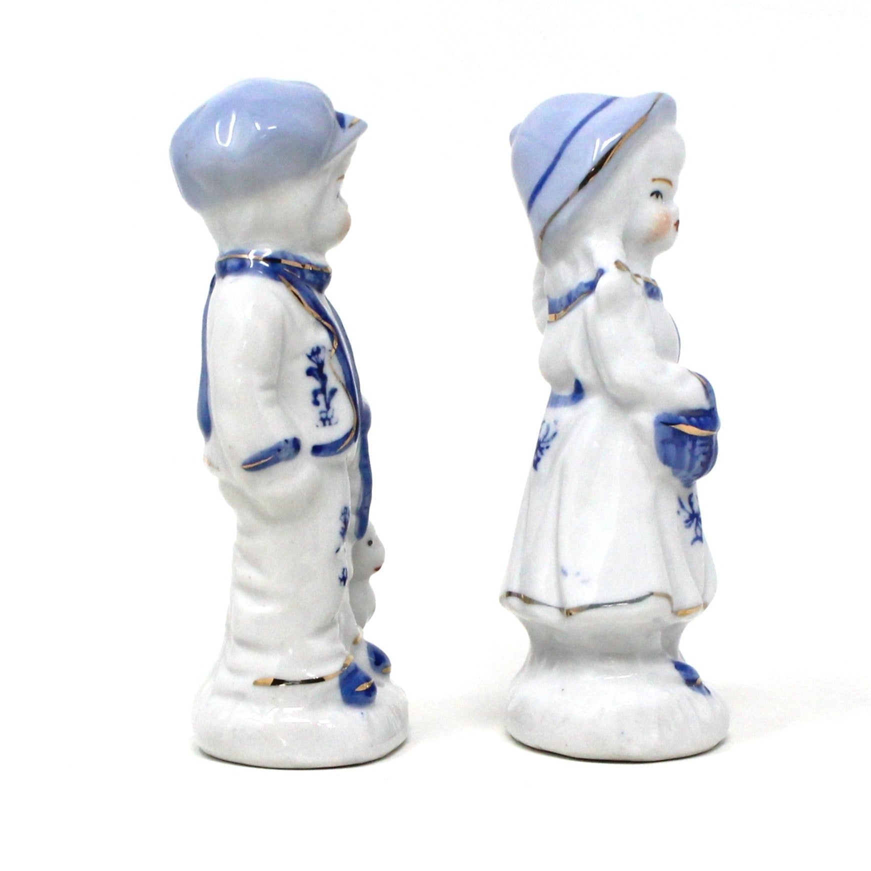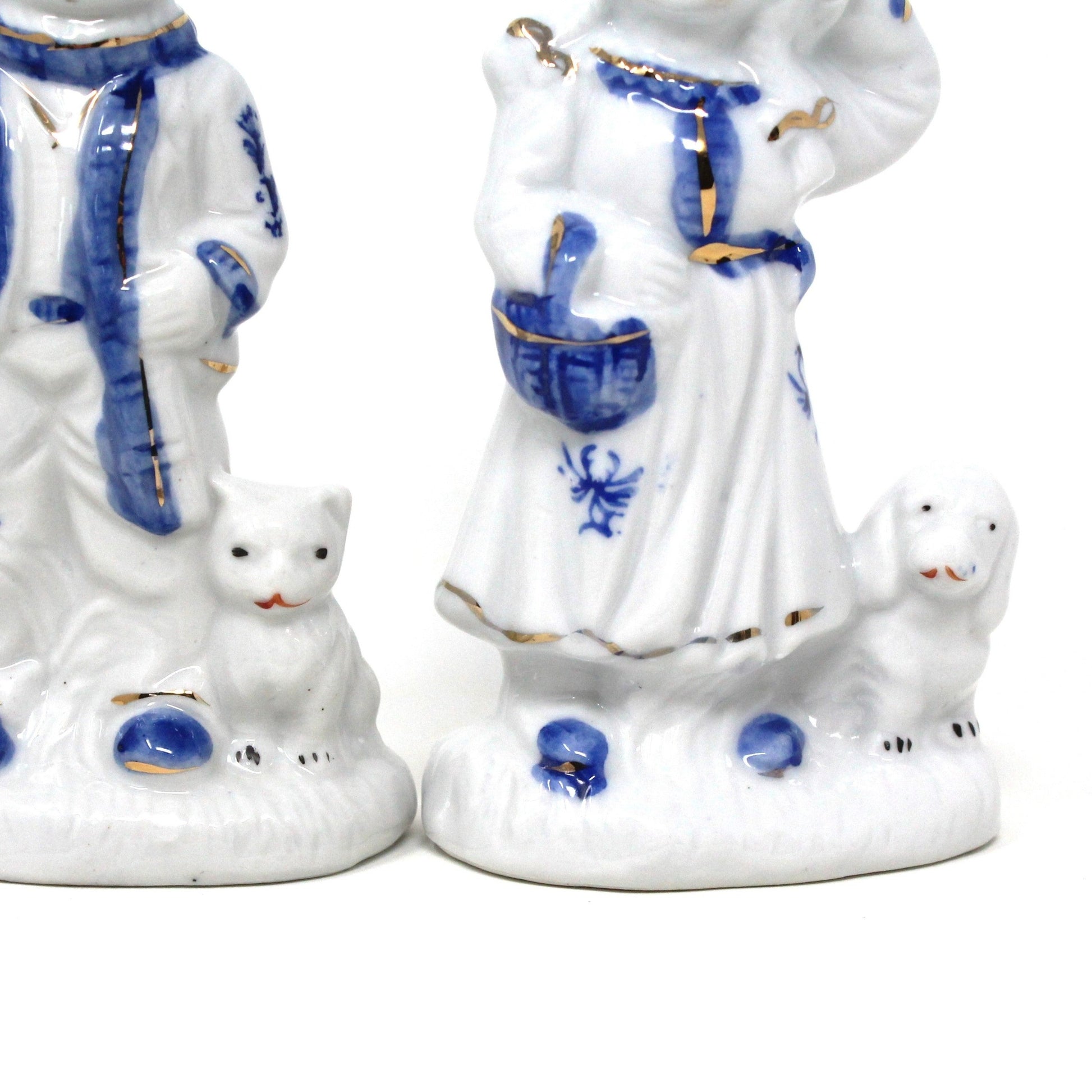 - Details: The quality of these adorable Delft style, blue & white, children figurines tell us these are not recent Chinese imports. The wonderfully detailed, hand painted faces, the floral designs on the clothing and the pretty gold accents, seem to indicate these are from a time prior to China earning a reputation for inferior goods. The girl has a puppy by her side, the boy a kitten. They both retain their original foil sticker: Made in China. If you collect blue and white figurines, we hope this is a great find. Their classic vintage charm and sweet faces will be a wonderful addition to any decor. Cute in a child's room.