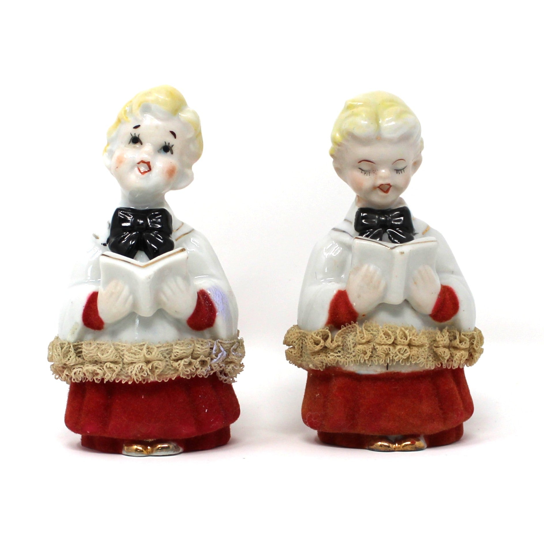 - Vintage Figurines, Christmas Choir Boys Wearing Red Flocked Gowns with Dresden Lace, Hand Painted Porcelain, Holiday Decor, Mid Century, Japan Imports, (Discontinued)