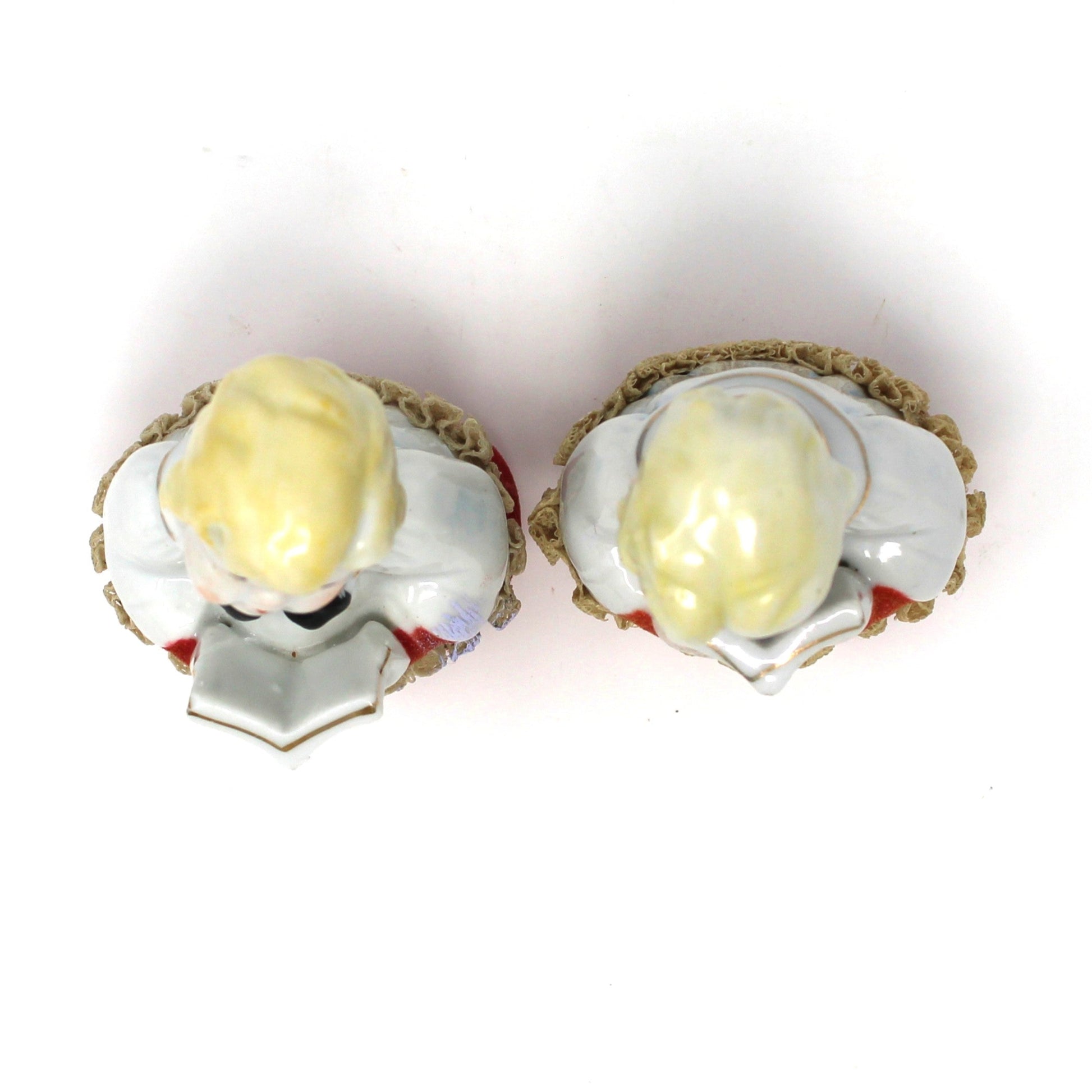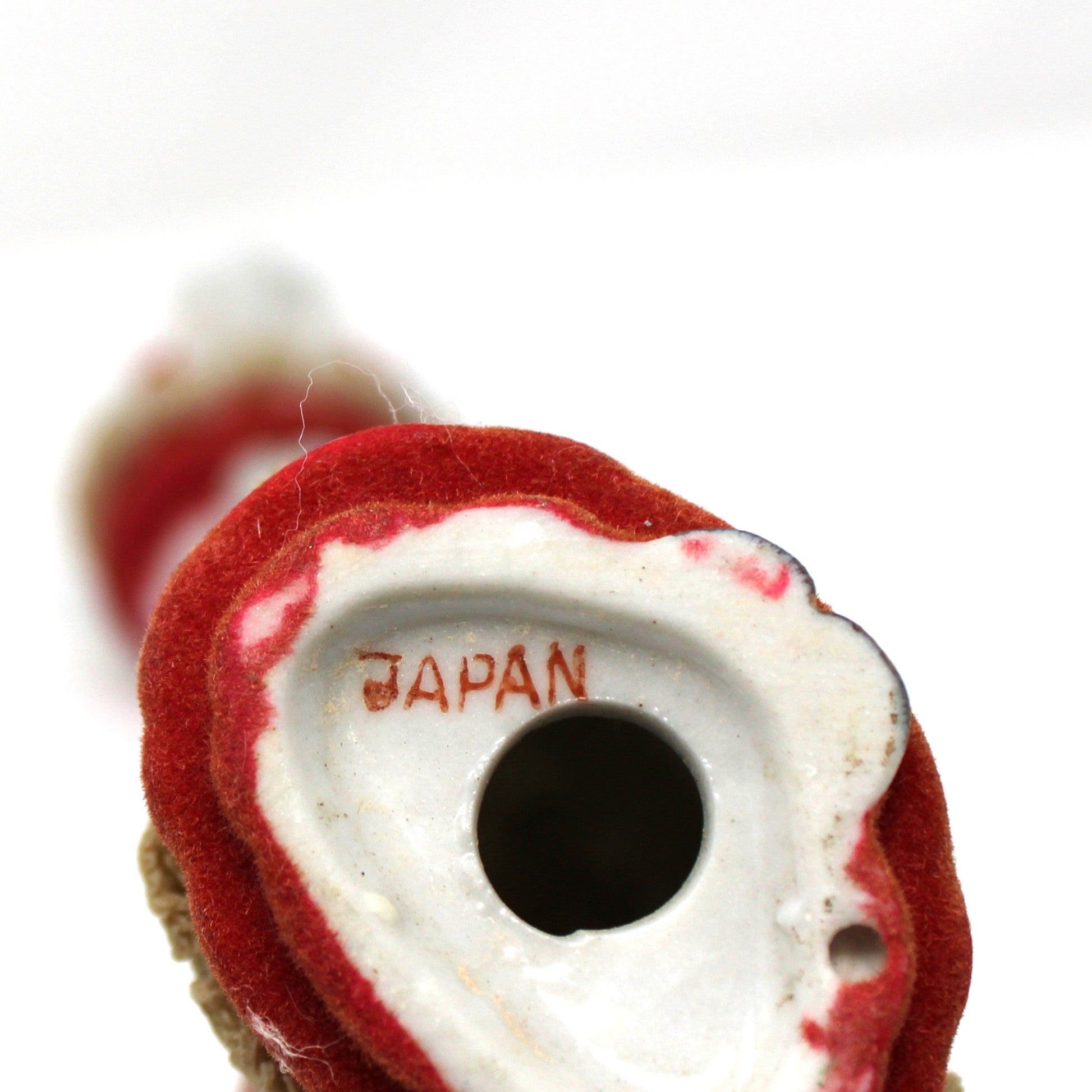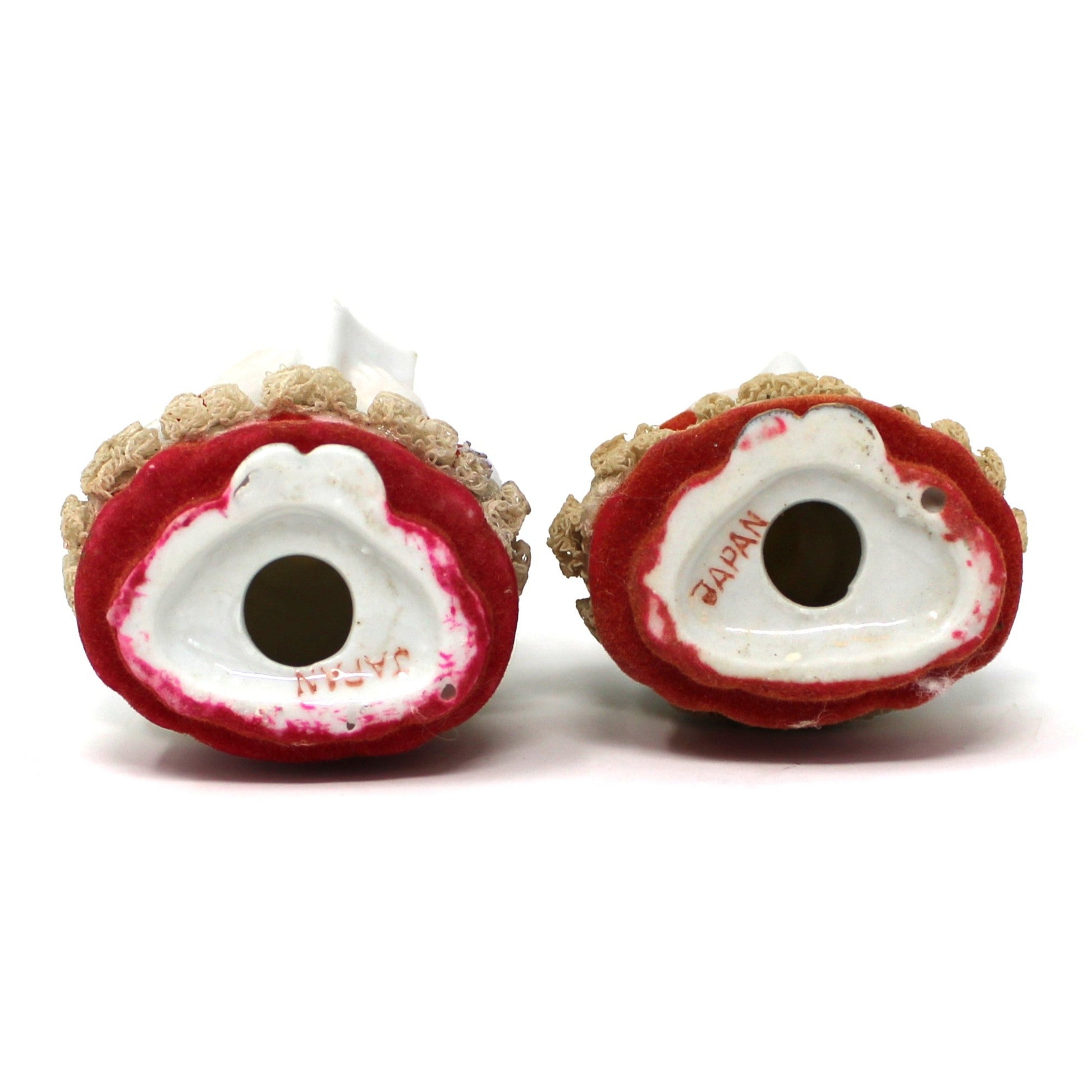 - Details: An exquisite set of two Christmas figurines, singing choir boys, wearing red and white robes, the red is flocked and they have real Dresden lace (not spaghetti). They have black bow ties, gold shoes and are in wonderful vintage condition. Beautifully hand painted faces and gold accents, embodying timeless holiday elegance. Both are marked "Japan" on the bottom. Ideal for collectors or adding a refined, nostalgic touch to seasonal décor.