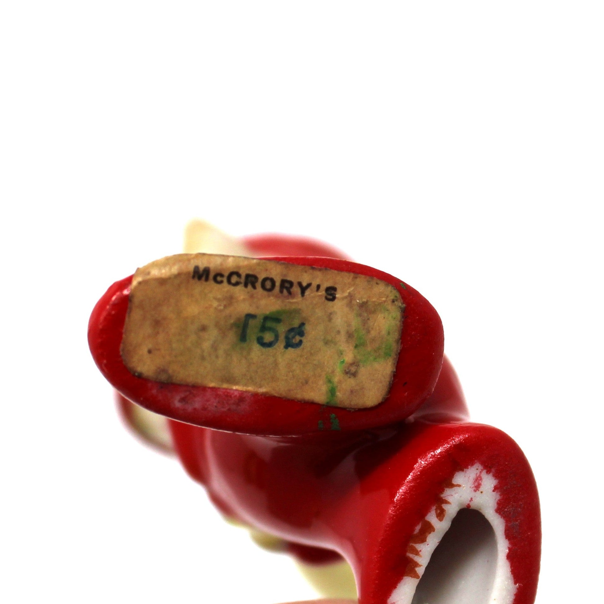 - Details: This charming mid-century pixie elf miniature, captures the whimsy of vintage holiday décor. Hand-painted in bright red and holding a yellow baseball bat, he is ready to join the team. These miniatures were typically Bone China, however, this one is unmarked, so we're listing it as Porcelain. It retains its original store label, showing this was sold at McCrory's (1882 - 1992). These are becoming harder to find, especially in this wonderful condition. It will bring a touch of nostalgia to any seasonal display or curated collection. Great for arts and crafts.