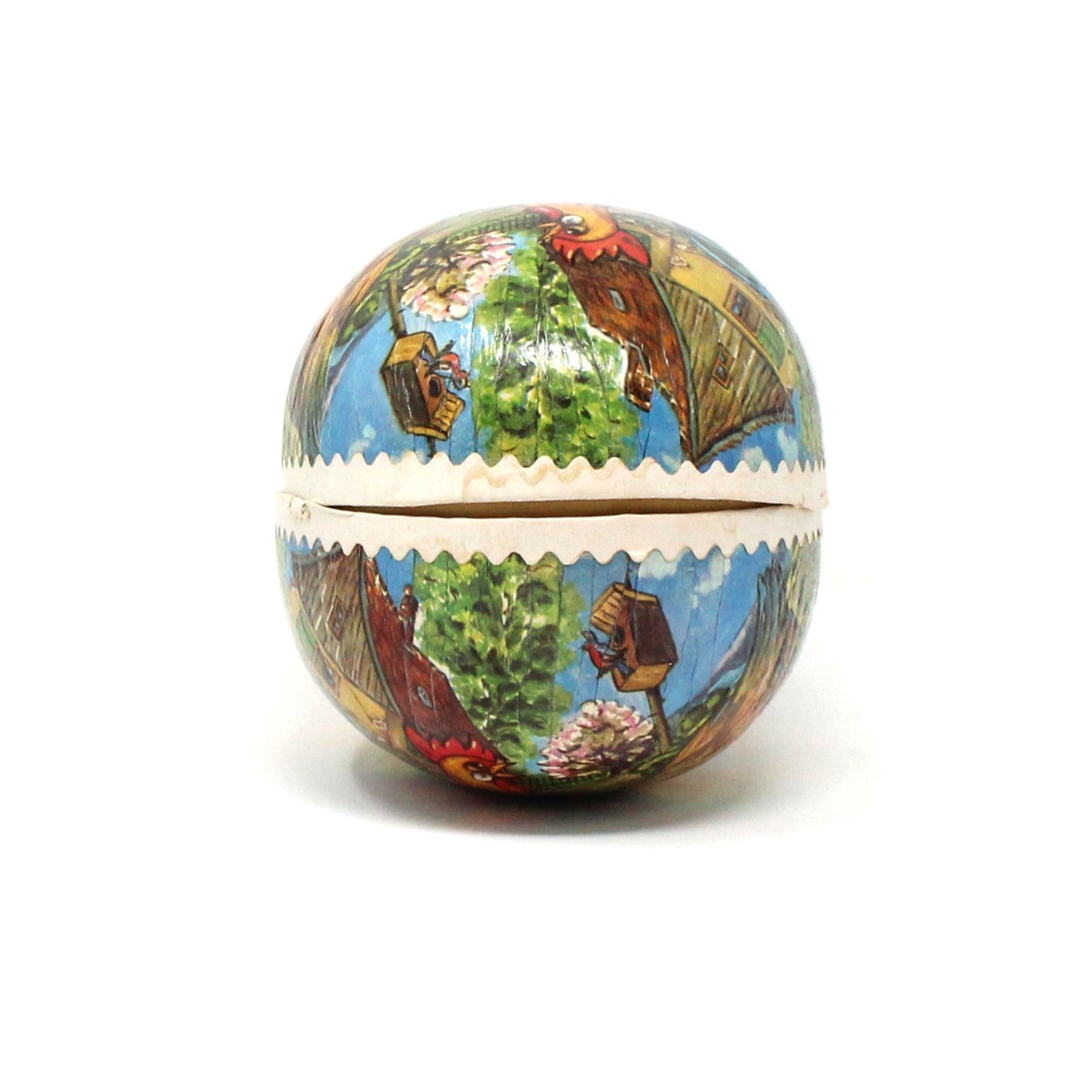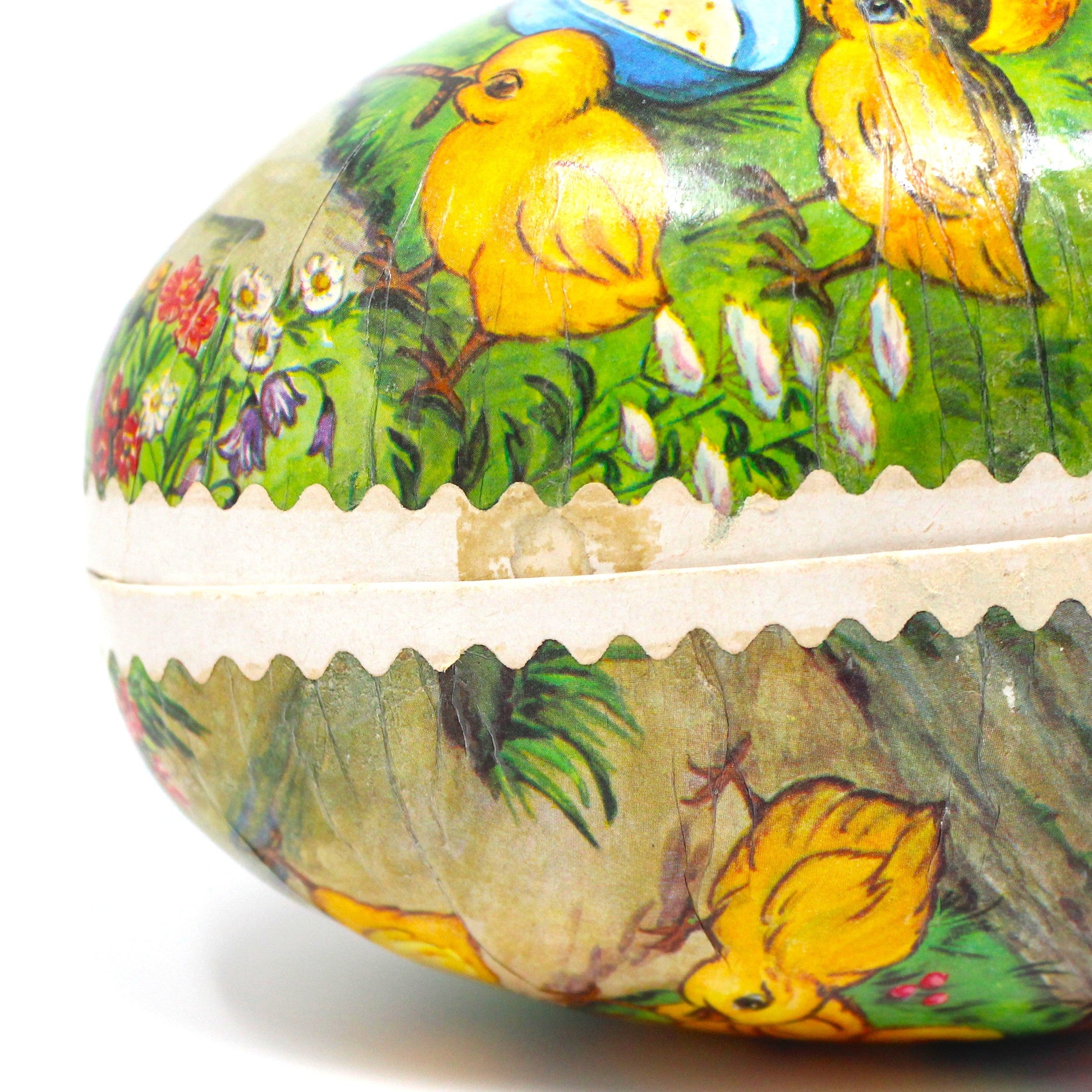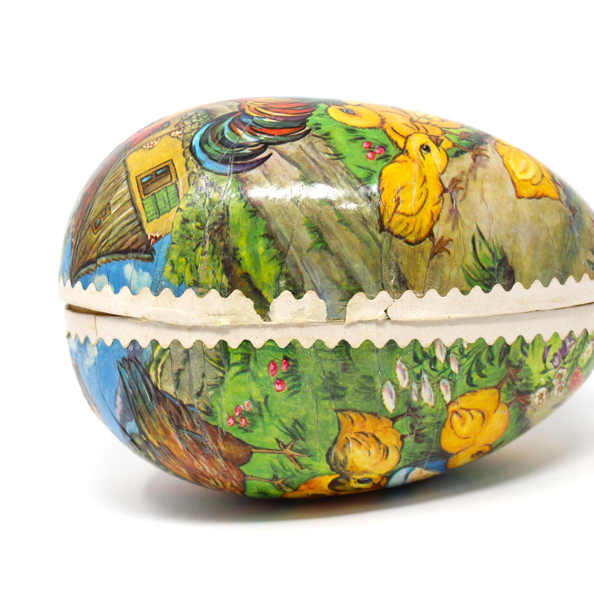 - Details: Such cute paper mache Easter Egg candy box!! This one looks to be an older one, however, it is unmarked, but we can still see some of the tell-tales signs of an older piece. For example, we know older paper mache eggs had decorated edges, and this one has a white strip of "rickrack" shaped paper. Also, the design used looks like a very old illustration, plus it has lots of folds, not smooth like the newer ones. But we are not experts, please review all pictures and make your own determination. This container opens into two halves, same illustration on both sides. Made specifically for the Easter holiday, these typically feature illustrations of spring, florals, rabbits, ducks, or chicks, anything related to spring rebirth and renewal. This one is empty, fill it with treats or decorate your home with it to bring a nostalgic, old world look to your Easter holiday and spring decor. As expected with these older paper items, there are some condition issues, please see below for details.