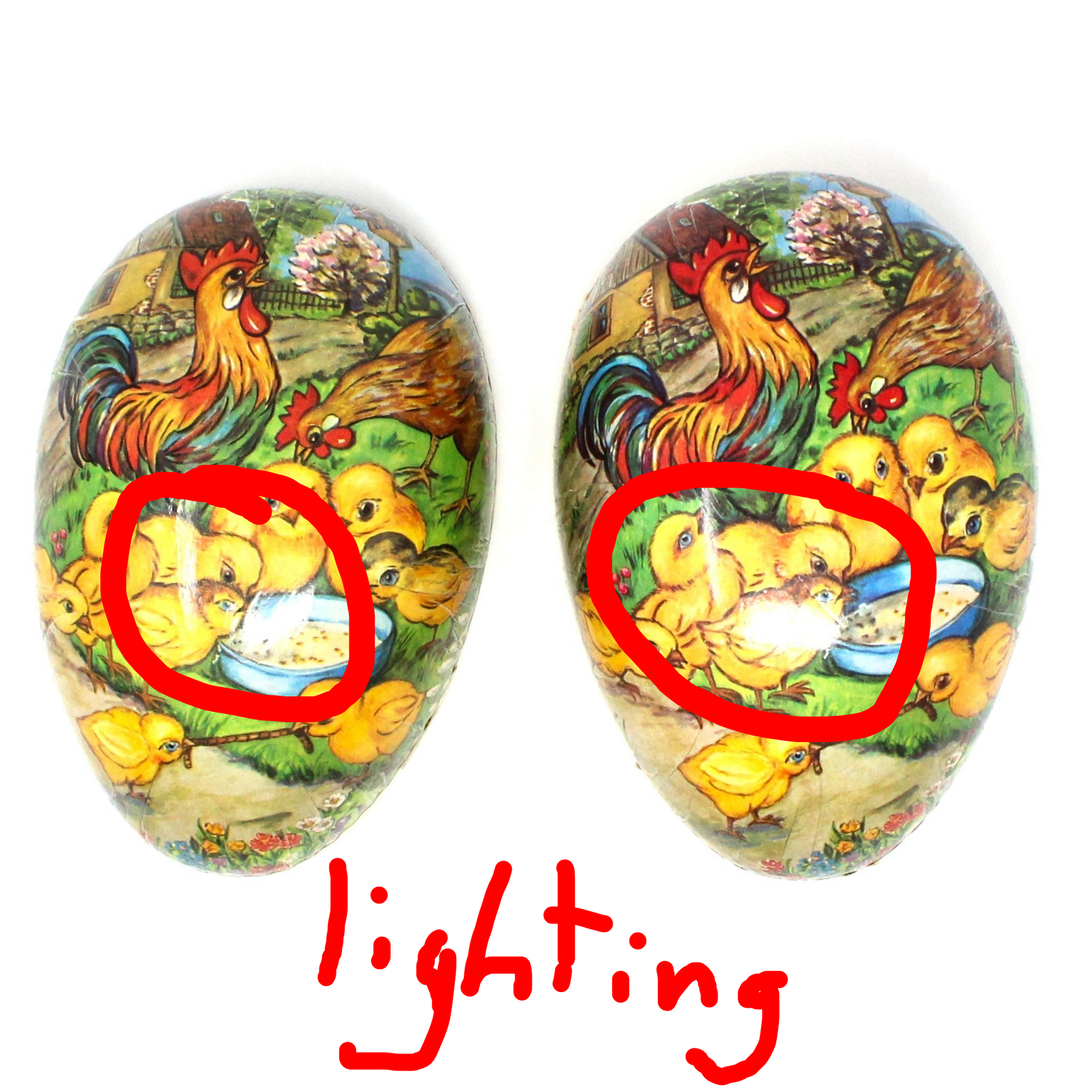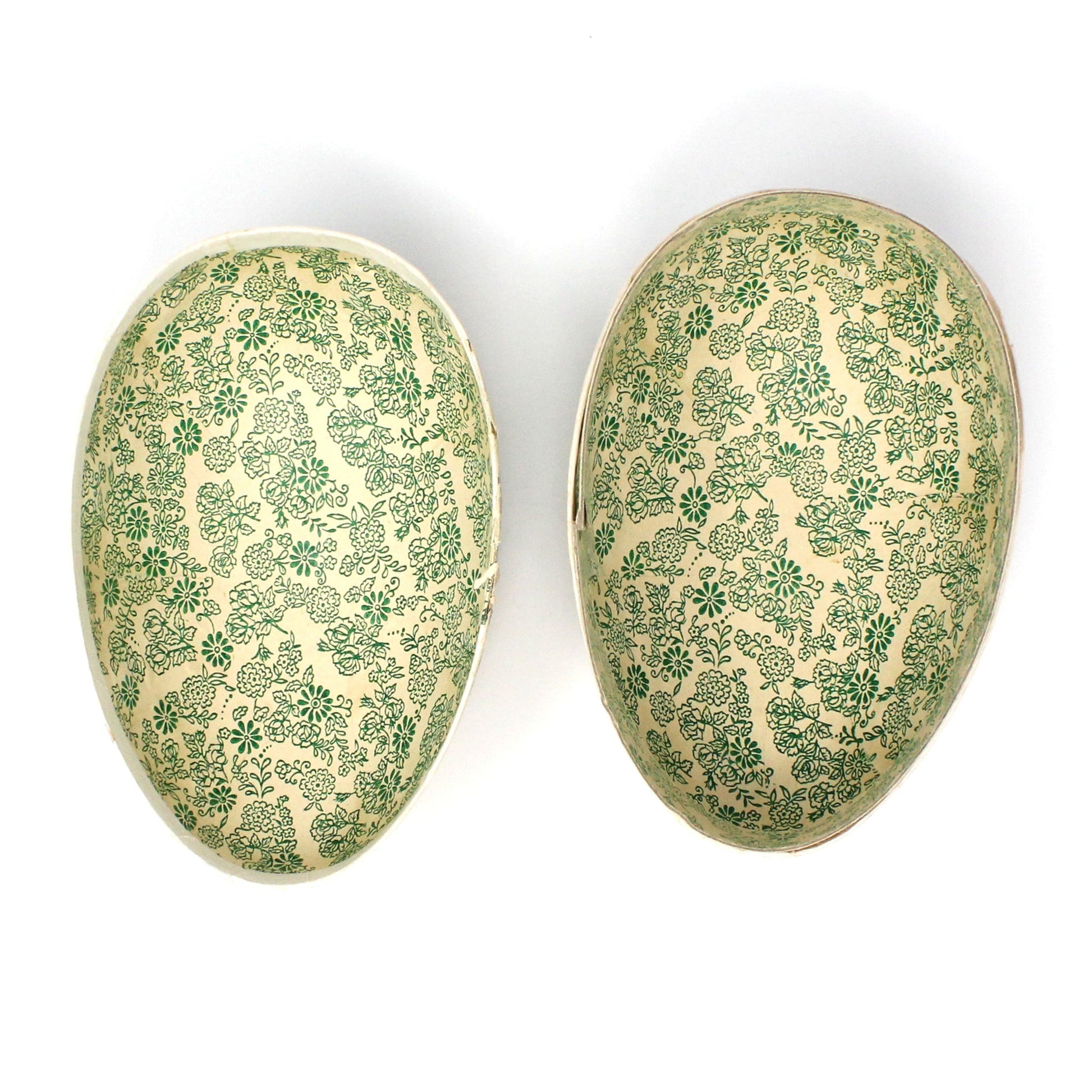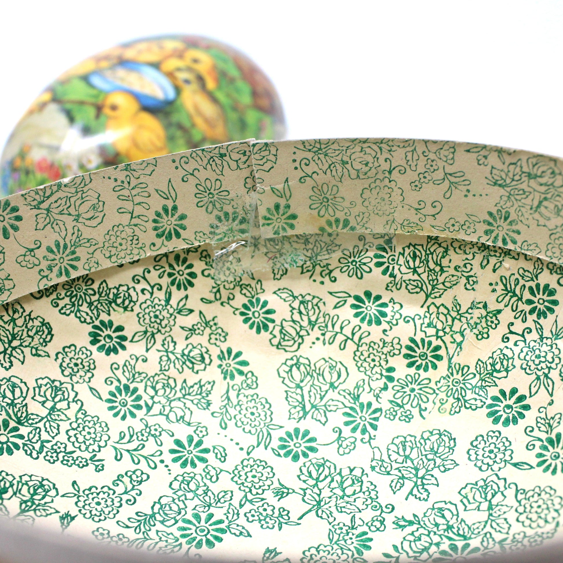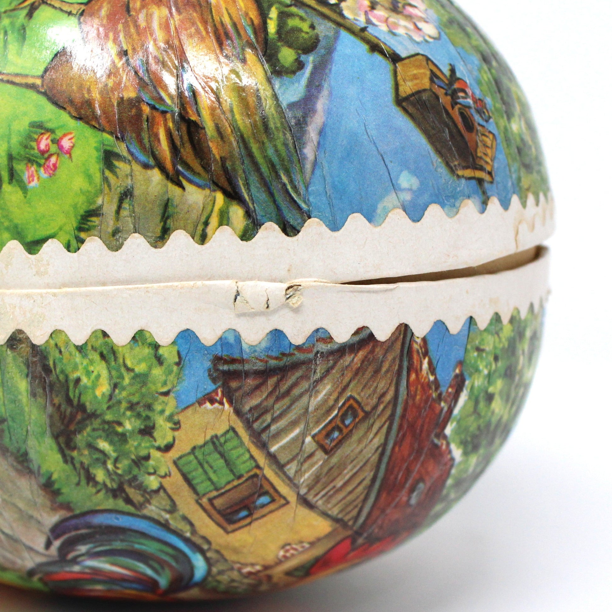 - Details: Such cute paper mache Easter Egg candy box!! This one looks to be an older one, however, it is unmarked, but we can still see some of the tell-tales signs of an older piece. For example, we know older paper mache eggs had decorated edges, and this one has a white strip of "rickrack" shaped paper. Also, the design used looks like a very old illustration, plus it has lots of folds, not smooth like the newer ones. But we are not experts, please review all pictures and make your own determination. This container opens into two halves, same illustration on both sides. Made specifically for the Easter holiday, these typically feature illustrations of spring, florals, rabbits, ducks, or chicks, anything related to spring rebirth and renewal. This one is empty, fill it with treats or decorate your home with it to bring a nostalgic, old world look to your Easter holiday and spring decor. As expected with these older paper items, there are some condition issues, please see below for details.