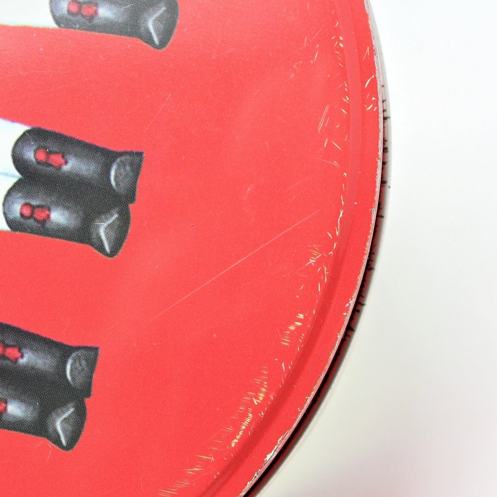 - Details: This is a really cute tin. It has three Marching Band T(oy Soldiers) on the lid, remind us of the ones from "Babes in Toyland". They are dressed in bright uniforms, one green one red and one blue with their musical instruments. The sides are just as fun with groupings of 3 soldiers, snowflakes, candles, holly, and toys all around on a red background. There is no information on the manufacturer, we've estimated the date. Great for kids room Christmas decor, traditional or more contemporary holiday vignette. Great gift for a tin collector during the holidays.