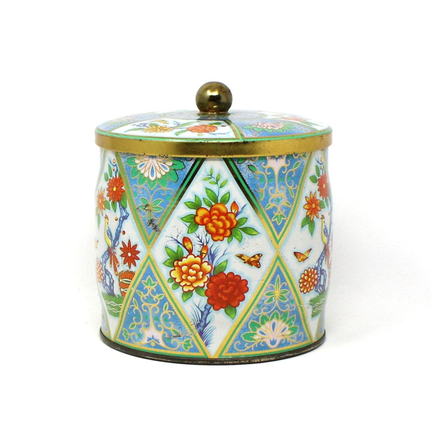 - Vintage Collectible Tin, Oriental / Asian Daher Floral, Biscuit Tin, Storage Container, Home Decor, Cookie Tin, Cylinder Style, Birds and Butterflies, Chinoiserie, (Discontinued)
