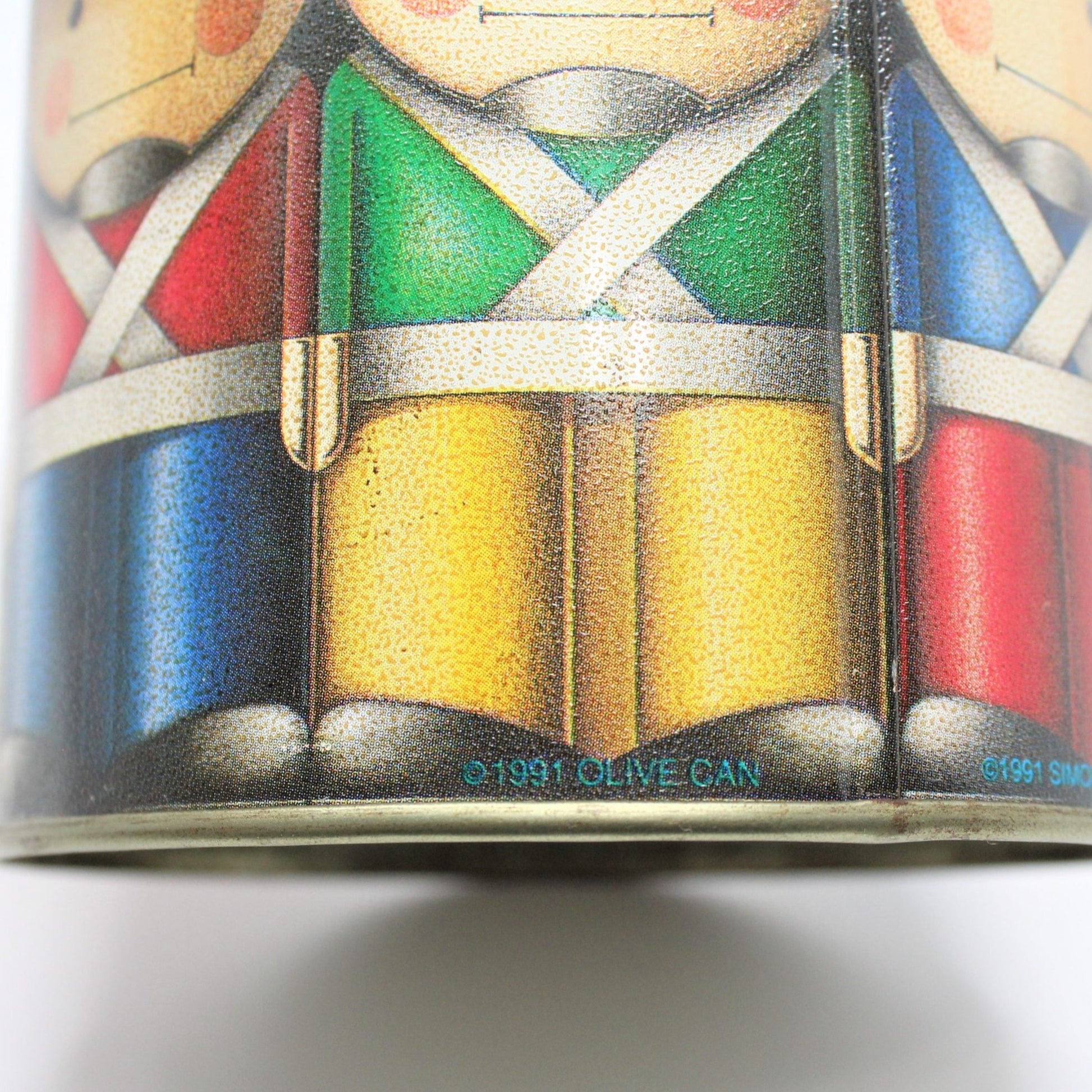 - Details: This is a really cute tin, perfect for the holidays! It has colorful Toy Soldiers all around the cylinder shaped tin. They are all wearing uniforms in primary colors Blue, Yellow, Red and Green and the lid has an antique-gold color. The entire tin has a nice grainy texture, it is not smooth. The lid has the Mrs. Field's logo in white letters and that's it, simple and cute as can be. The bottom edge reads: "1991 Olive Can, 1991 Simonelli Design". These are not easy to find, and this one is in very good condition. Great Christmas decor in a kid's room. Perfect gift for a tin collector during the holidays. Makes a nice "gift box" too!
