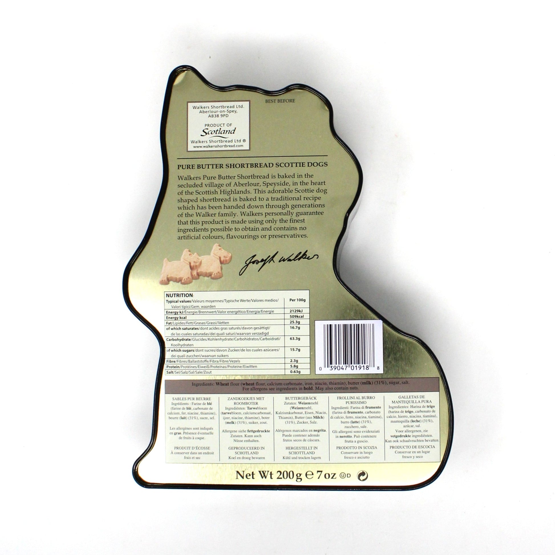 - Details: A very cute cookie tin from Walkers! Perfect for Christmas holidays or simply winter decor. The tin is shaped like a black Scottish Terrier Dog wearing a plaid hat and collar with his name tag: "MAC". This tin is empty, Walkers continues to sell this tin today with their shortbread cookies. It is in wonderful condition! Great for a child's room, or as part of a Christmas decor vignette and of course, for Christmas cookie gifting.