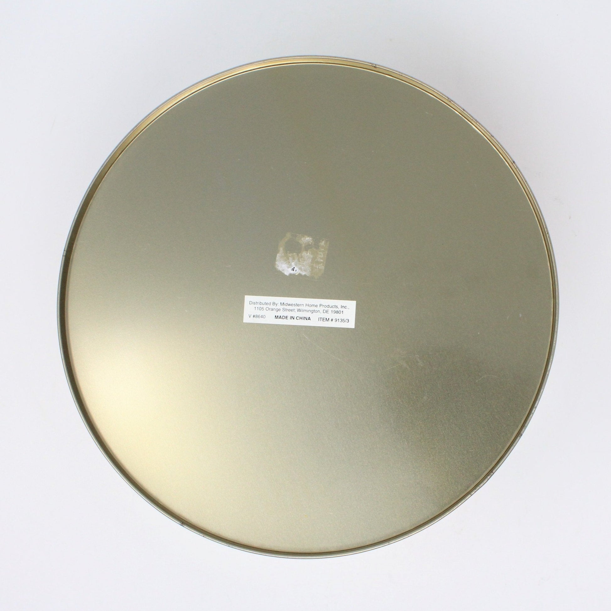 - Details: This is such an adorable cookie tin! It features an extensive collection of Christmas fabric patterns around the tin, reminds us of quilting patches. There is a sticker on the bottom that reads in part: "Distributed by Midwestern Home Products Inc., Wilmington, DE, Made in China". We think it's the ideal place for quilters and seamstress, (sewers, sewist?), alike to store their fabric remnants! Great for country / farmhouse decor, or for a tin collector, it is in perfect condition.