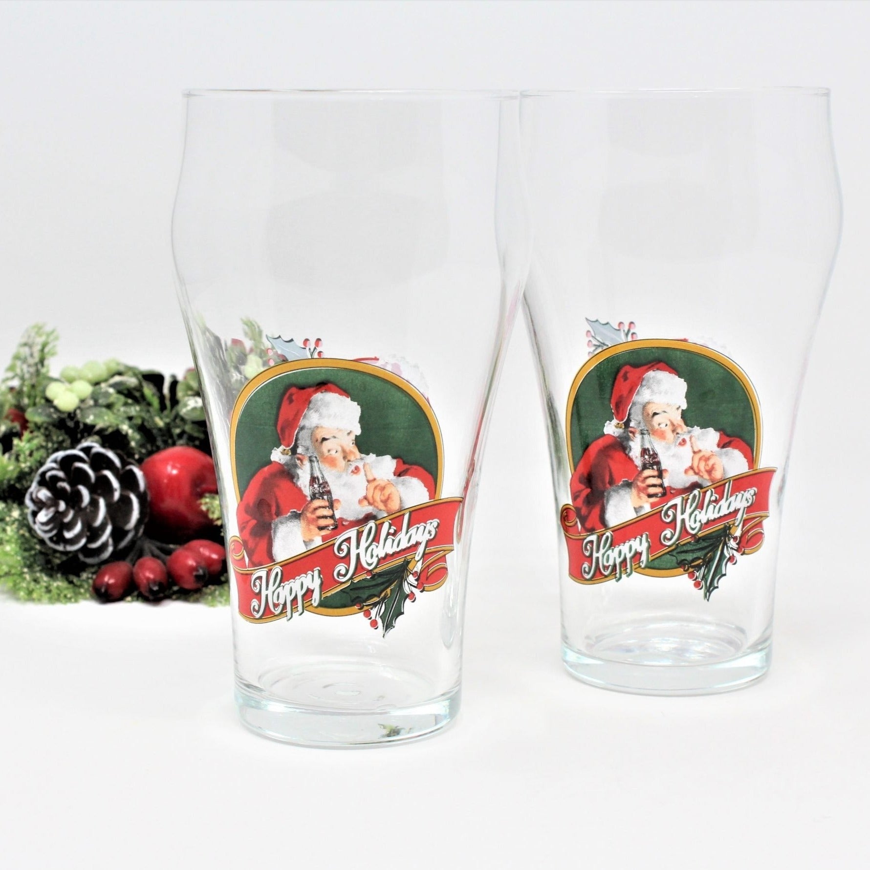 - Details: Highly collectible Coca Cola bell shaped drinking glasses / tumblers. These are the larger, 16 oz glasses, called Big Boy glasses. They have the Sundblom Santa holding a bottle of coke with a big red ribbon that reads "Happy Holidays". The back has a different decal, a bottle of Coca Cola within a red circle decorated with holly and berries. They are not marked on the bottom however they have a pontil mark, looks like blown glass. Perfect addition to your bar or kitchen holiday decor!