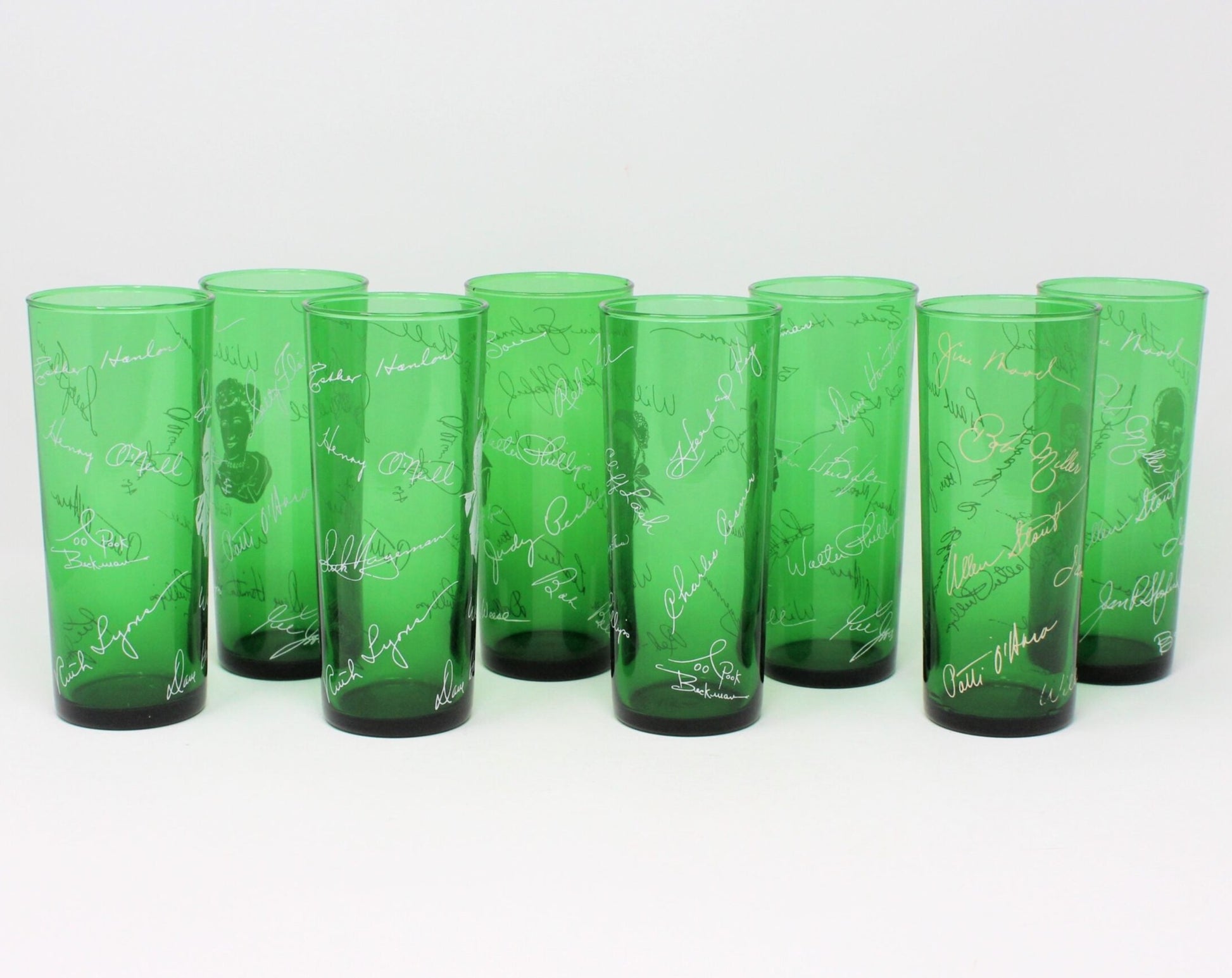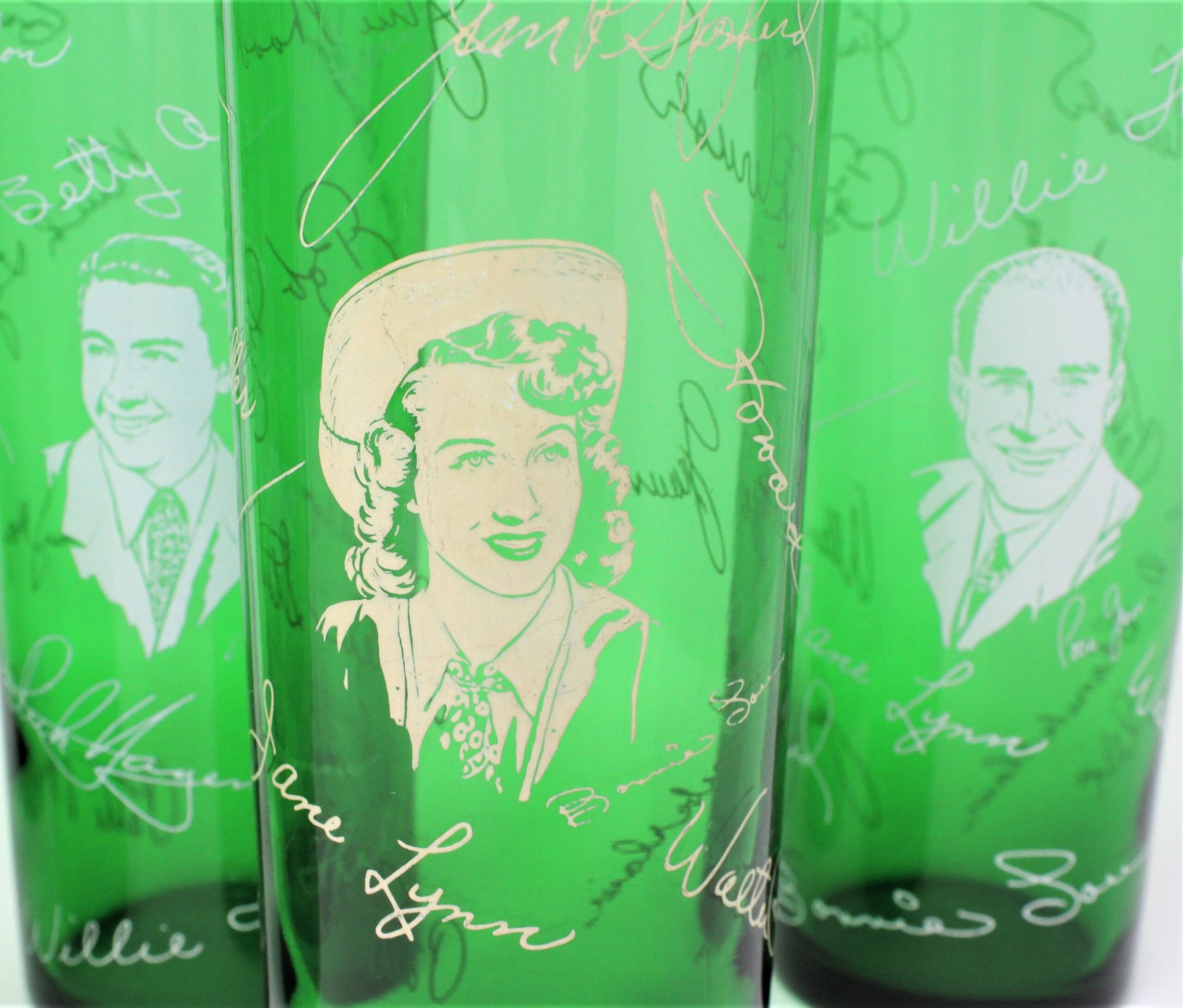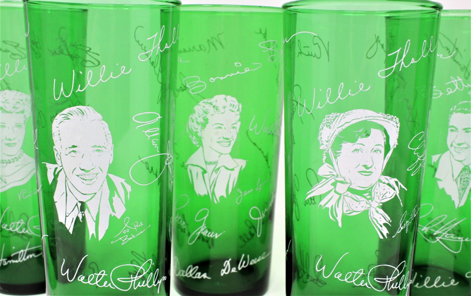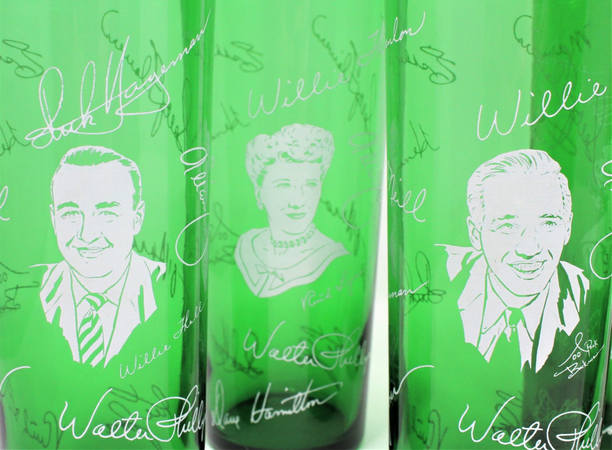 - Details: This set is a piece of radio history! These are green glass Highball Glasses with white pyroglaze enamel portraits, and signatures, of WLW Radio announcers and performers. Each glass features a different person's portrait surrounded by signatures from others at the radio station. Our glasses include: Ruth Lyons, Sally Flowers, Bonnie Lou, Jane Lynn, a very young Bill Bailey, Spook Beckman, Willie Thall and looks like Peter Grant, hard to read. All these personalities took part in the Midwestern Hayride series at WLW Radio in Cincinnati, which ran from 1930 to 1972. We dated the glasses between 1940's to the 1950's based on the life history of those featured (yes we read each one, if you'd like information on any, please let us know, happy to share), plus the style of their hair and clothes. The glasses are unmarked, they look like blown glass. This is a beautiful set and a wonderful piece of American entertainment and radio history. Because of all the white pyro against the bright green glass, they will really stand out in your bar or display case. They are the perfect size for Tom Collins. Great gift for a radio buff, entertainment historian, or country music historian