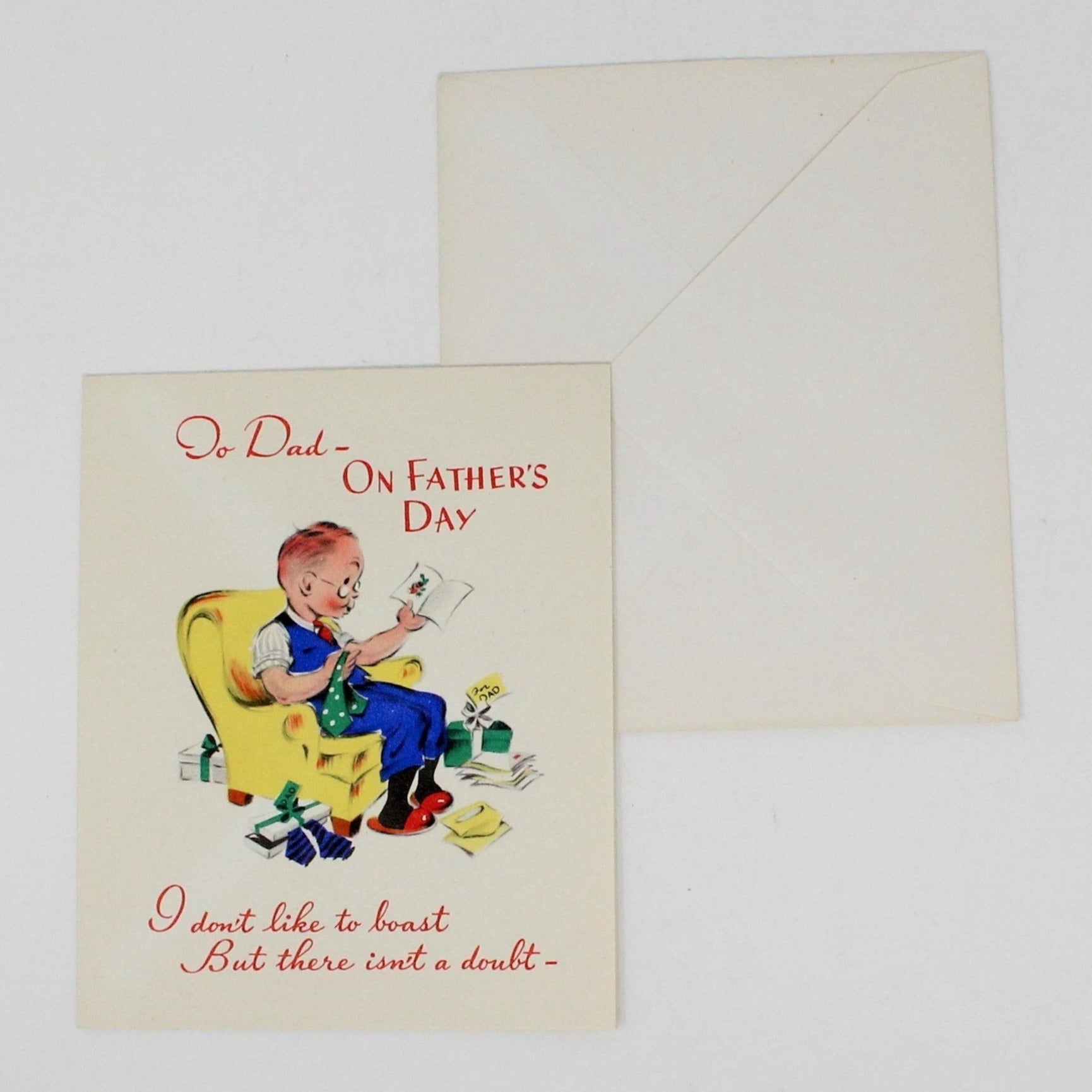- Vintage Father's Day Card, To Dad on Father's Day, Unused with Envelope, RARE, Greeting Card Collectors, Bragging About Dad, Volland Brand, Novelty Ephemera, Dad on Chair, Scrapbooking, (Discontinued)