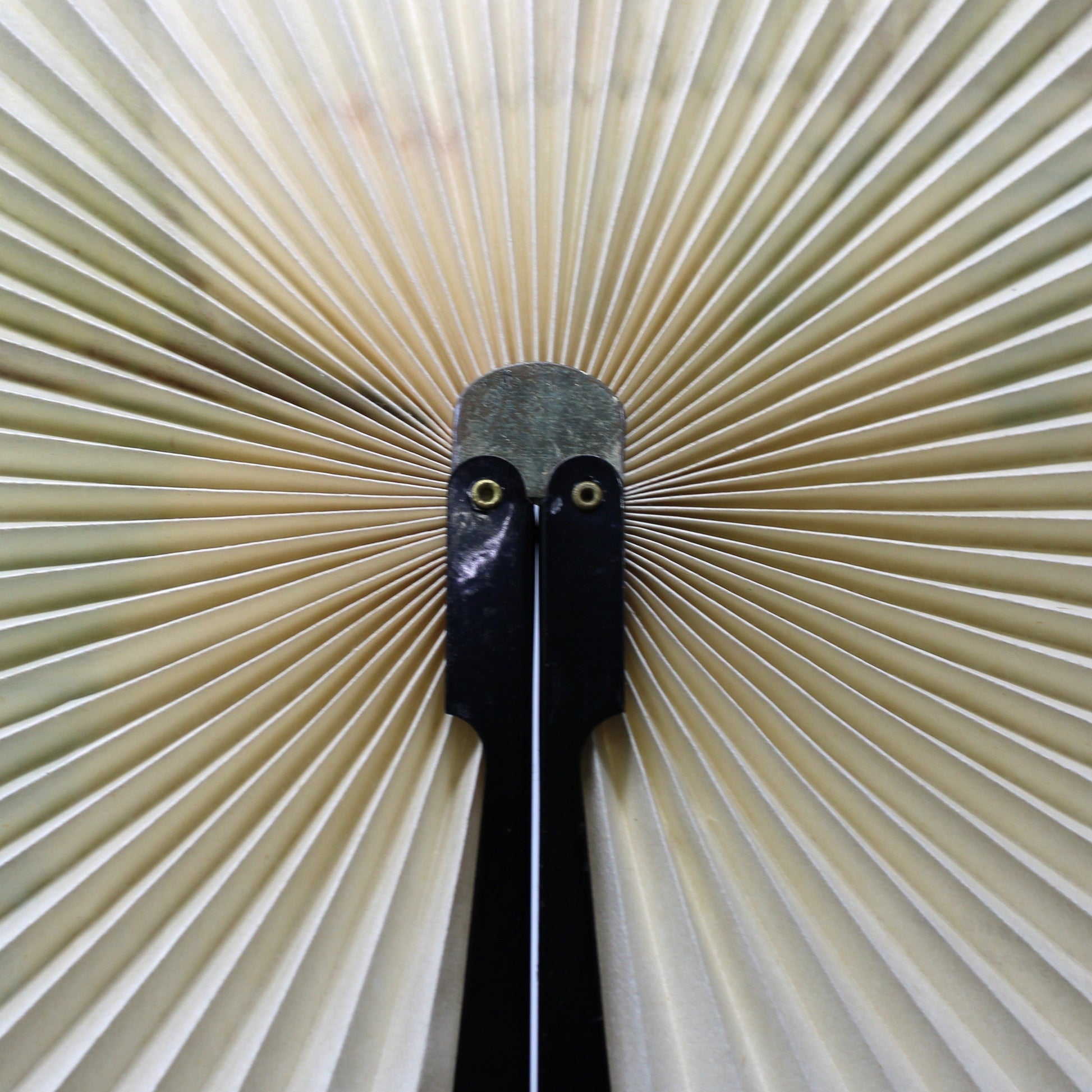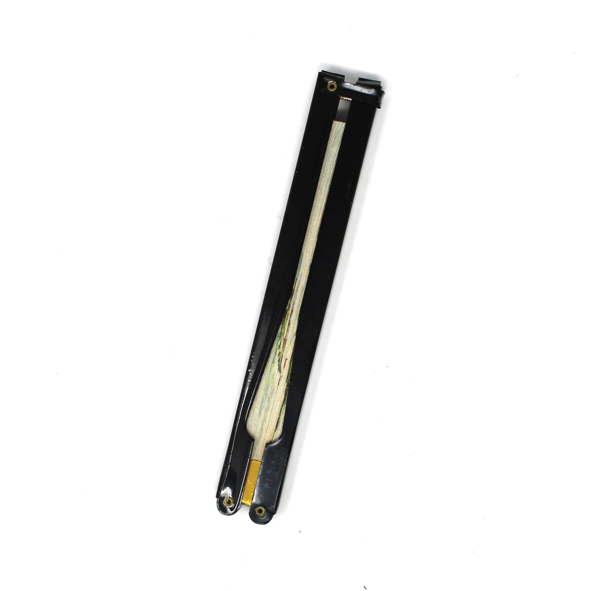 - Details: This beautiful folding hand fan, the leaf features a serene Oriental landscape image of a lake, mountains and a man on a boat. This style fan is known as a Cockade Fan, it has a pinwheel shaped when opened and folds flat for easy storage. This may be rice paper, it is very stiff, but we are not experts. The handle is black metal, both are in very good shape. It is marked with Oriental characters and "Made in the People's Republic of China". Fans have been around since Roman times but these hand held - folding fans were introduced in the West during the 17th Century, and quickly became popular. This cockade style was popular in the 18th and 19th centuries. Today they are highly collectible, perfect for an outdoor summer get-together.