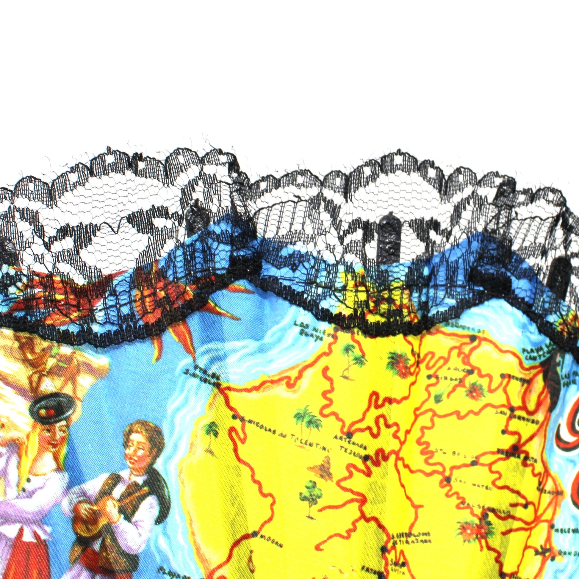 - Vintage Hand Fan, Spanish Style, Souvenir Folding Fan from the Canary Islands, Gran Canaria, Landmarks on Fabric, Black Lace, Open Cut-Work Ribs, Collectible
