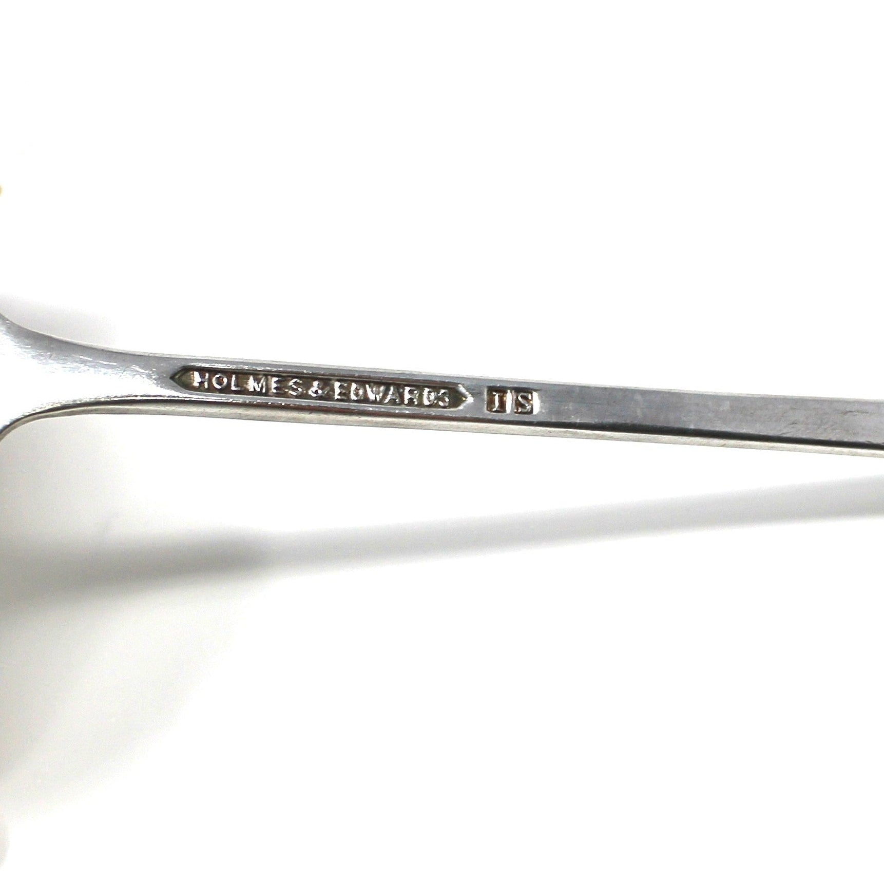 The Holmes & Edwards Silver Co started in 1882, in Bridgeport, CT.  At first making only low priced plated flatware.  However, there was a turning point when William A. Warner of Syracuse, New York joined the company.  Warner had invented, and patented, a technique of inlaying blocks of sterling silver at the wear points on the back of spoons and forks prior to plating them.  Because of that process they were able to offer a 25 year guarantee of no worn spots at those points.  That process brought them fame and prominence among the silver plate industry .  The Holmes & Edwards plant was taken over in 1898 by the International Silver Company, continuing to operate in Bridgeport until 1931 when it moved to Meriden.   Silver inlaid production was discontinued in 1972 and later marketed by Wallace International Silversmiths Inc.  Since this spoon does not carry the initials IS (International Silver), after the Holmes & Edwards name, we can confirm this spoon was manufactured prior to 1898.