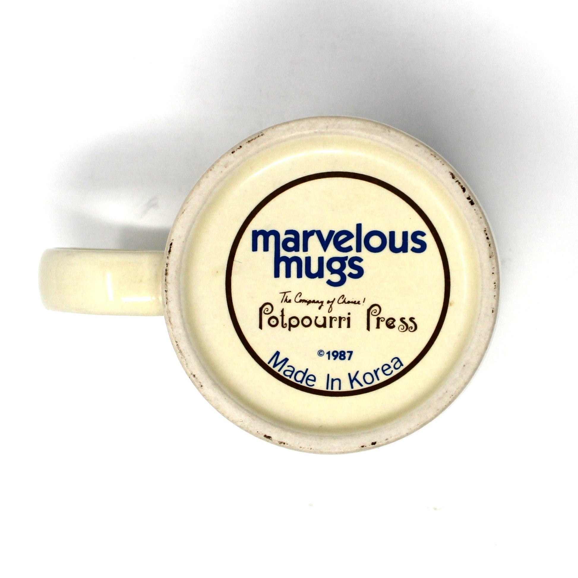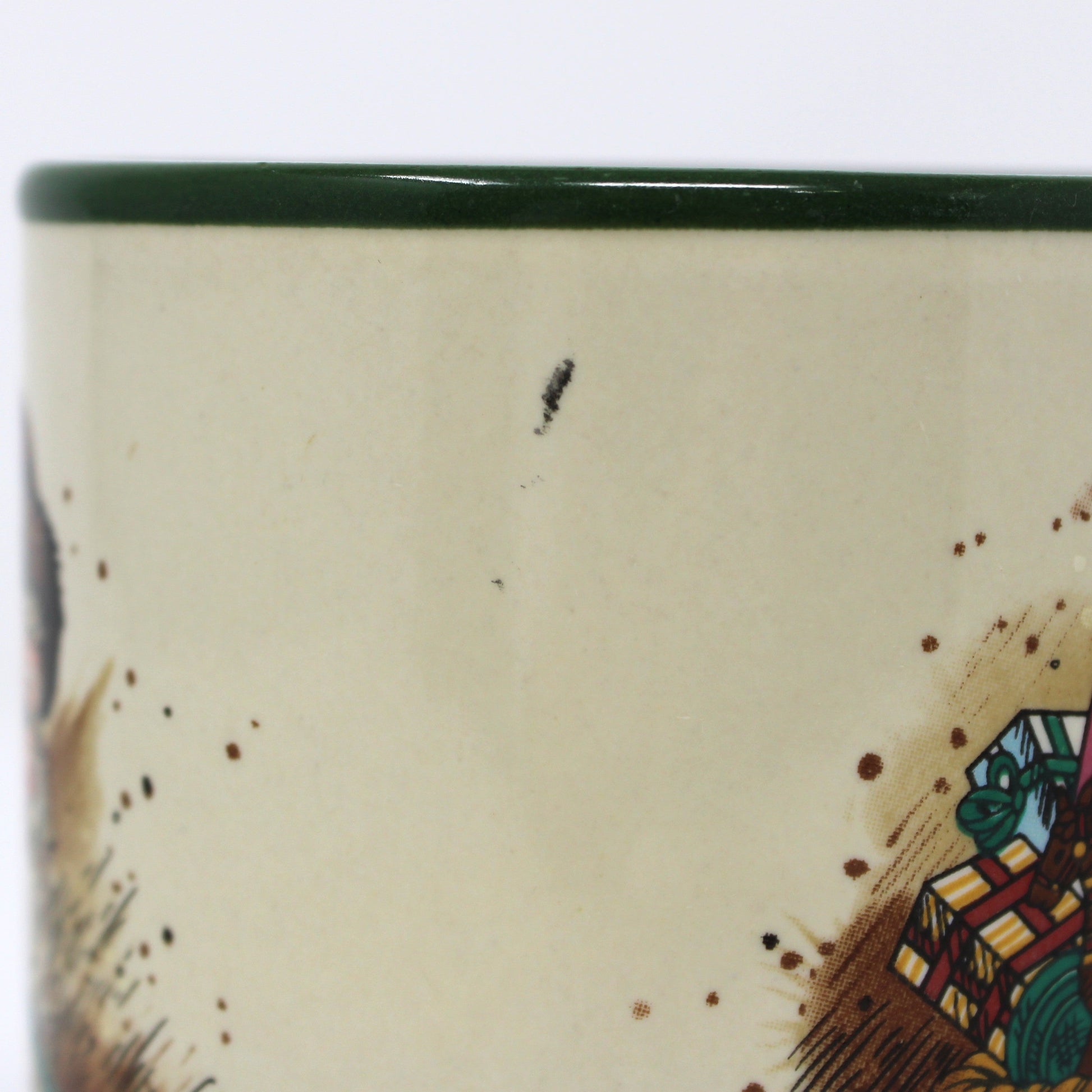 - Details: A much loved Victorian Kris Kringle / Santa Claus design signed by Wim Schimmer "WIM". This will become a favorite mug for the holidays! Santa has a red coat and hat with brown fur, not white, and carries a basket full of toys, much like the Victorian Kris Kringle images. The exterior has a soft beige color and the interior has a dark green color. The mug is ceramic with a shiny glaze inside and out. The bottom is stamped: "Marvelous Mugs, The Company of Choice! Potpourri Press, 1987 Made in Korea". Perfect as Christmas kitchen decor, or for your favorite coffee drinker. Great little gift for the office with candies or chocolates!
