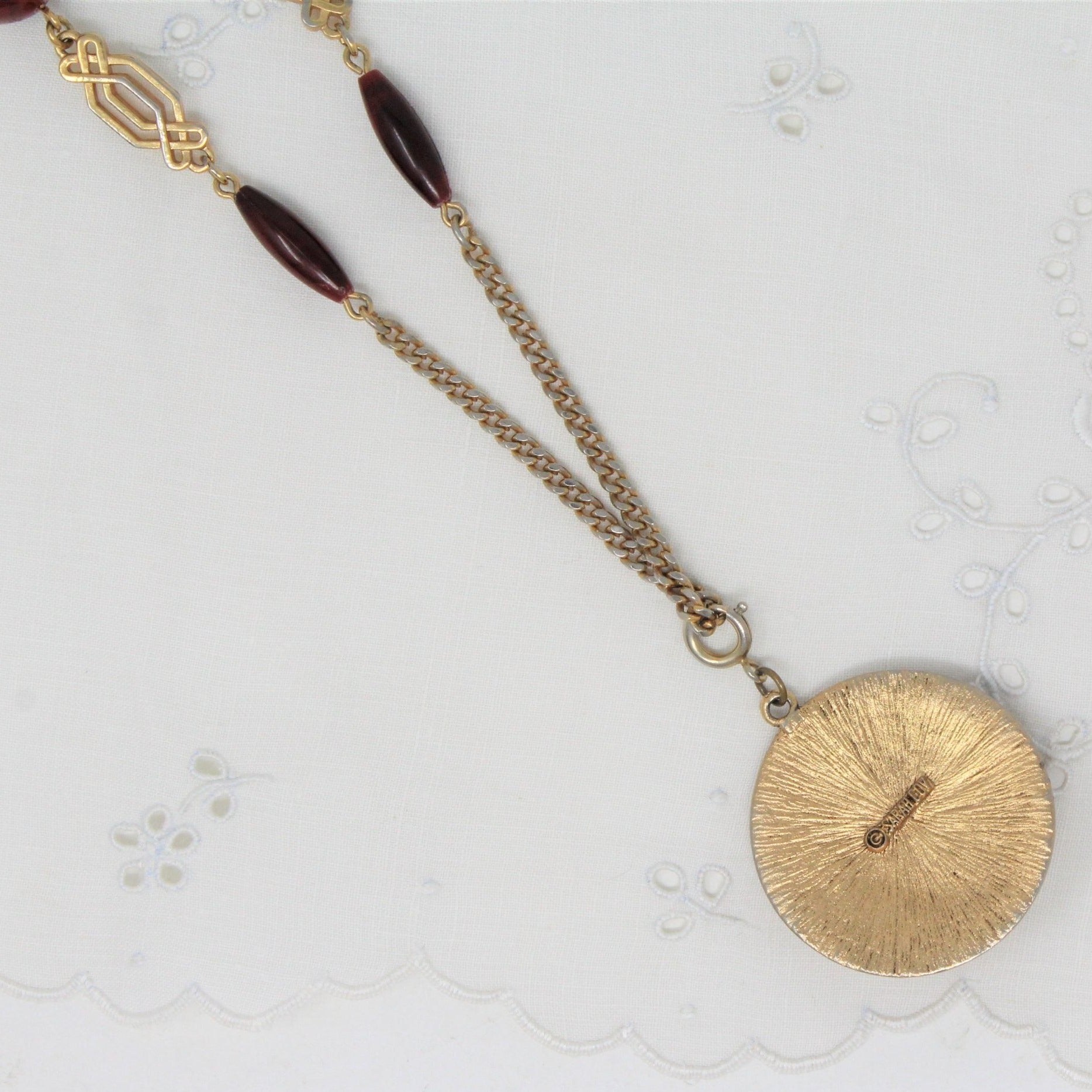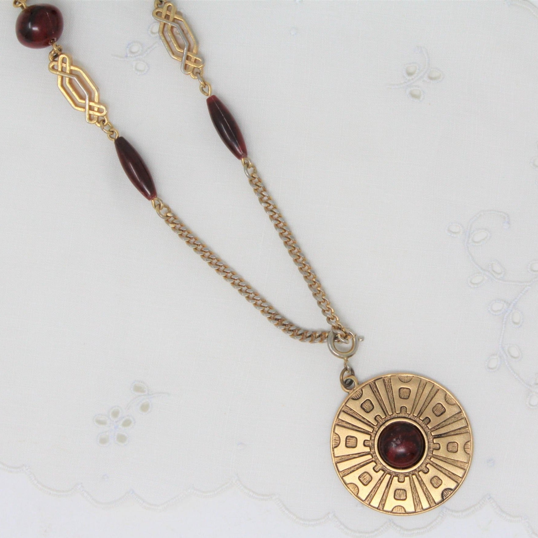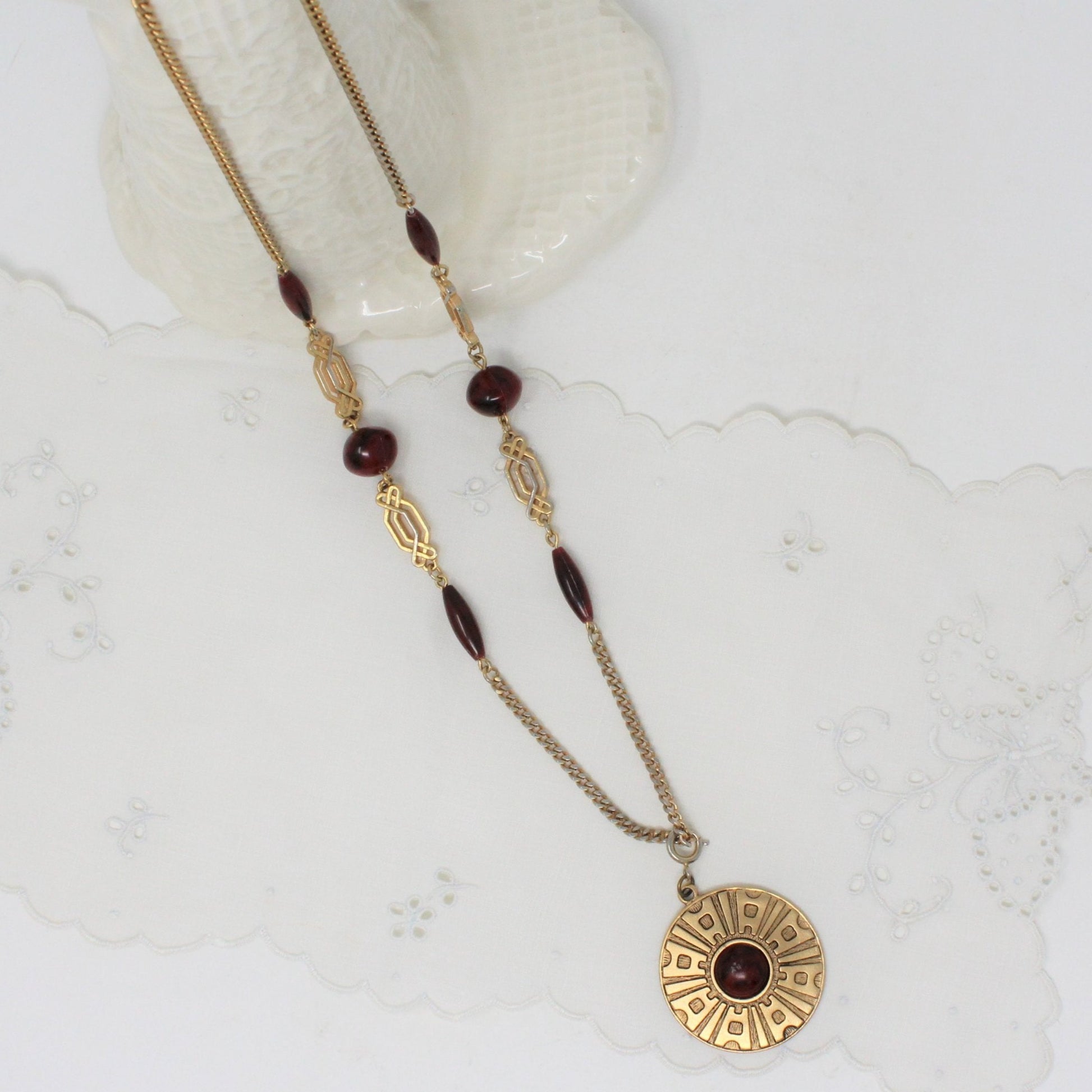 - Details: A super nice necklace from a much loved brand, Sarah Coventry. This piece is from the late 70's, around 1978, and it clearly reflects the bohemian style that was "in" at the time, interestingly, it's made a full come back and now this look is right back in style. The necklace features an antique gold-tone chain beautiful open work spacers and small cranberry color beads in rounded and elongated oval shapes. The most striking part is the large medallion with a Lucite cranberry color cabochon in the center and a Safari and/or Aztec type design all around the large bead, this piece can be removed and the necklace used without the pendant. The medallion is embossed "SarahCov." on the back, this mark was first used in 1953.
