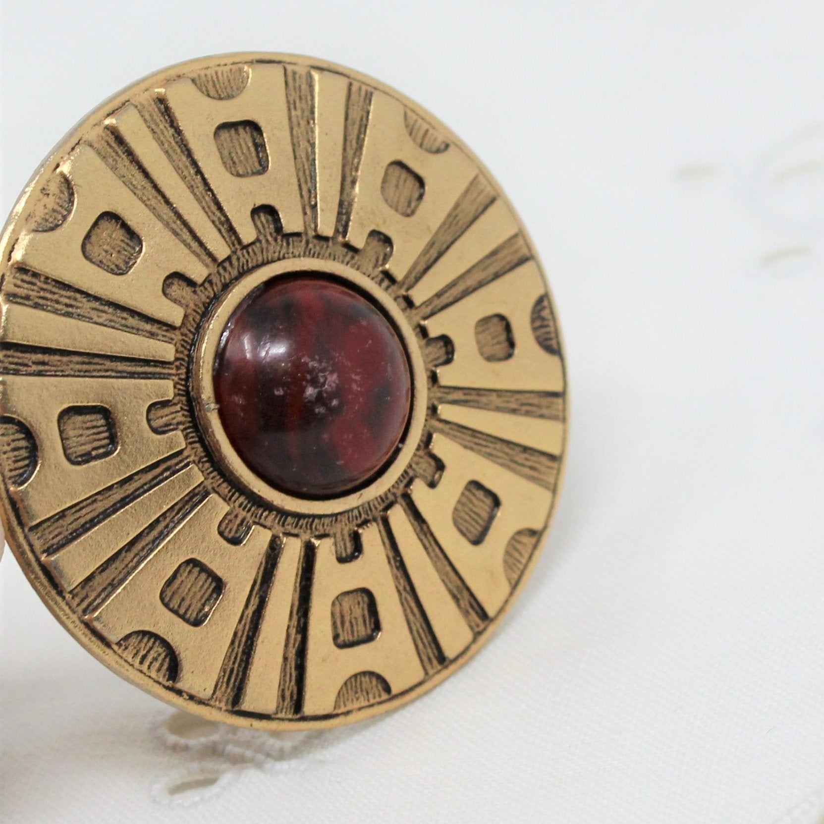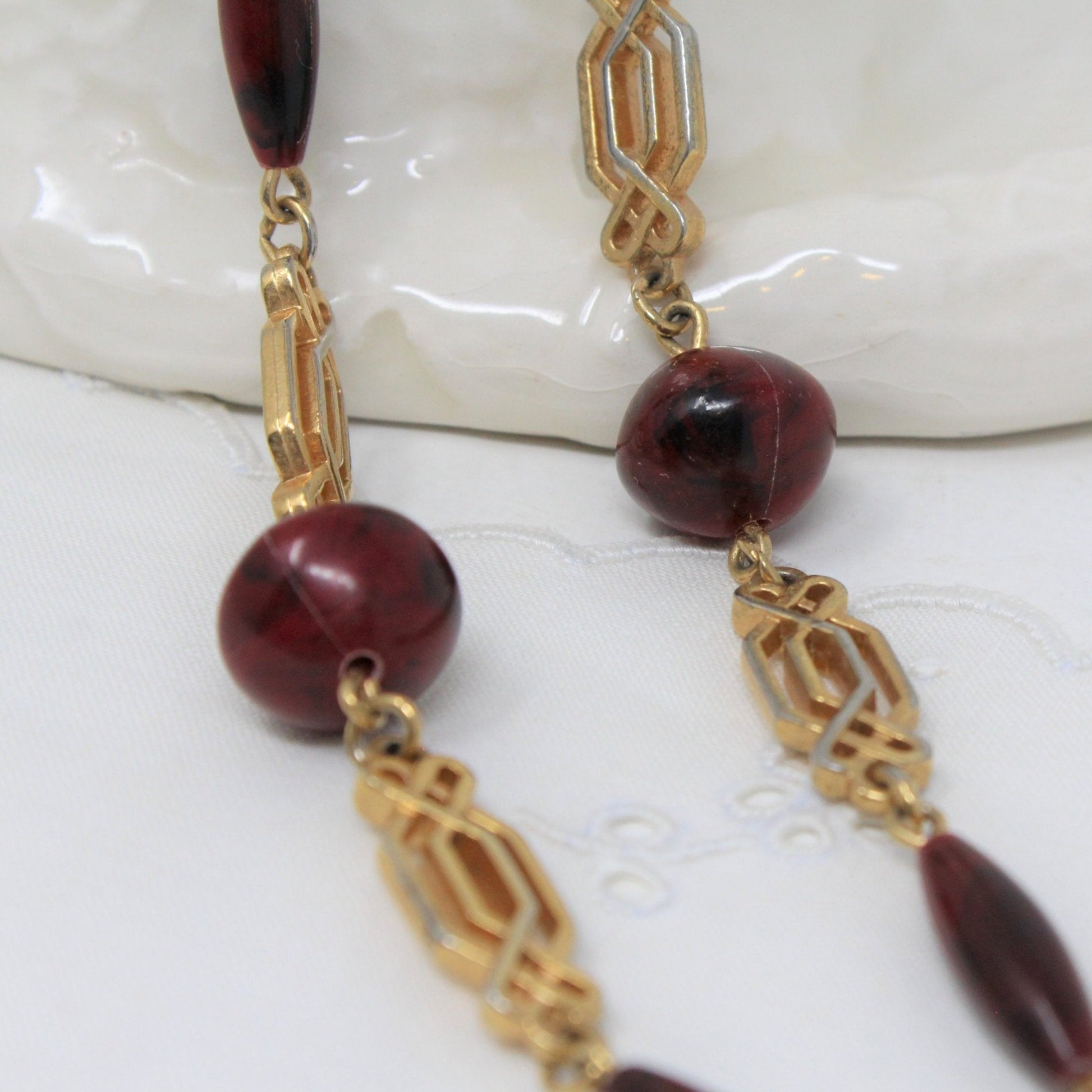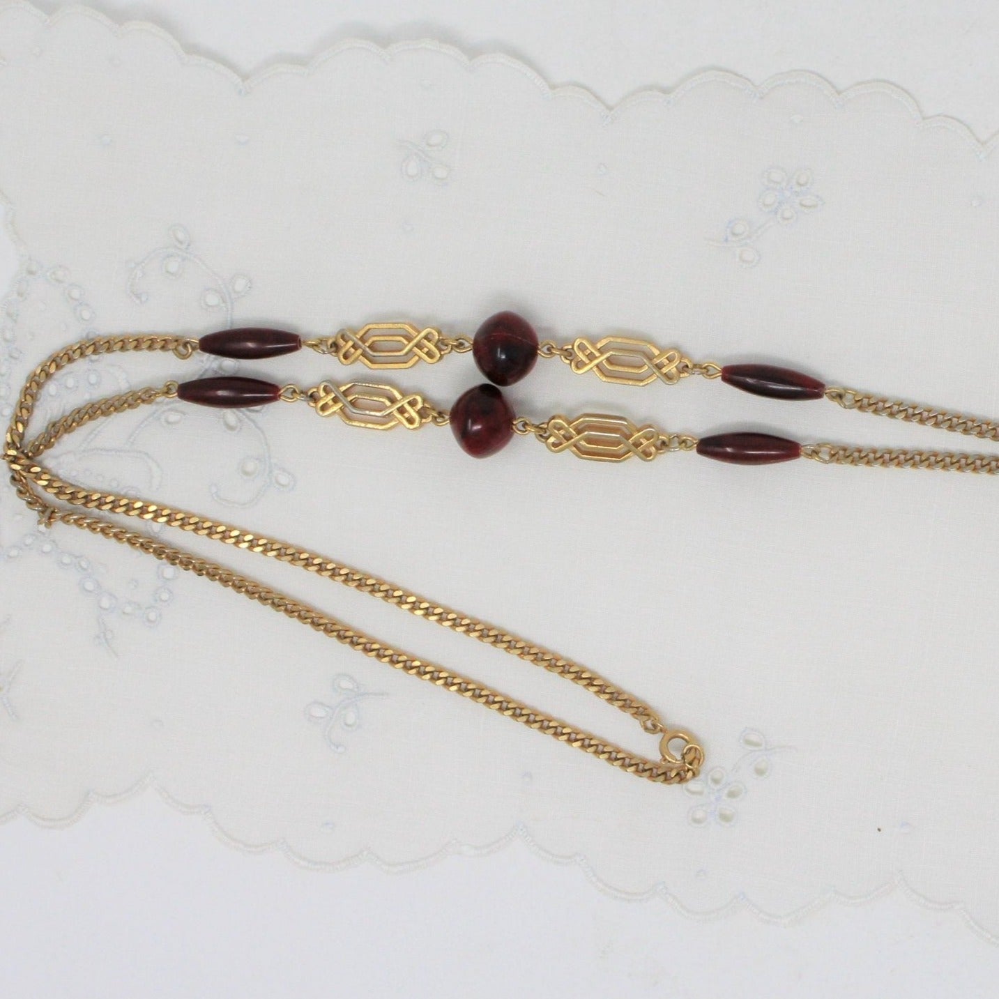 - Details: A super nice necklace from a much loved brand, Sarah Coventry. This piece is from the late 70's, around 1978, and it clearly reflects the bohemian style that was "in" at the time, interestingly, it's made a full come back and now this look is right back in style. The necklace features an antique gold-tone chain beautiful open work spacers and small cranberry color beads in rounded and elongated oval shapes. The most striking part is the large medallion with a Lucite cranberry color cabochon in the center and a Safari and/or Aztec type design all around the large bead, this piece can be removed and the necklace used without the pendant. The medallion is embossed "SarahCov." on the back, this mark was first used in 1953.