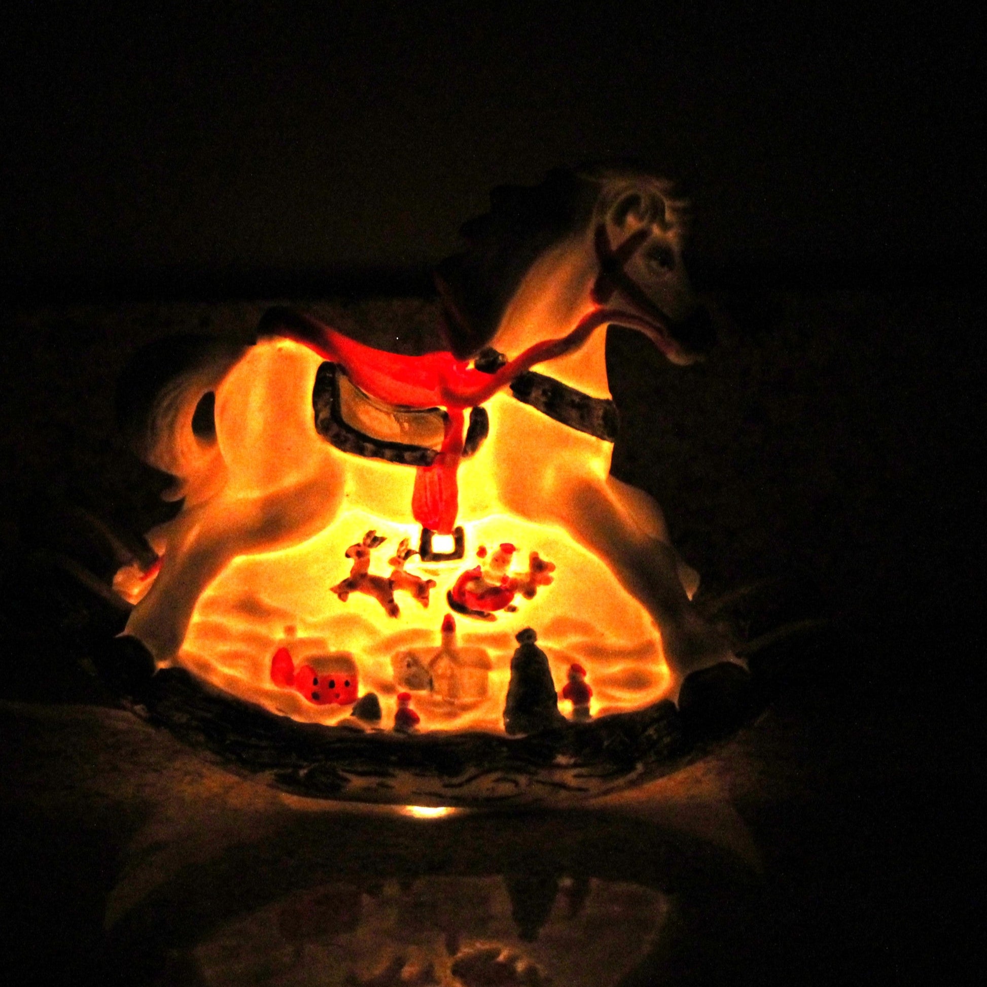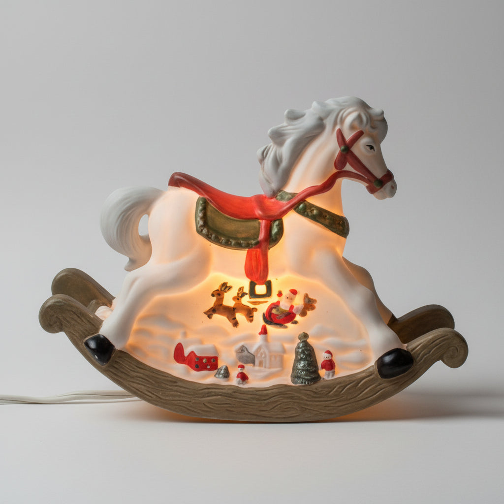 - Details: A precious Christmas accent light, or night light, featuring a porcelain rocking horse with a Christmas scene underneath. One side has Santa's sleigh flying over a holiday village, the other side Santa is on an airplane flying over a choo choo train. So fun for the holidays!! It includes the UL listed cord and light bulb in working condition. Perfect for a child's room as a night light or a great addition to a Christmas vignette. We had lots of fun playing with our AI photo options, enjoy a little Christmas fantasy!!