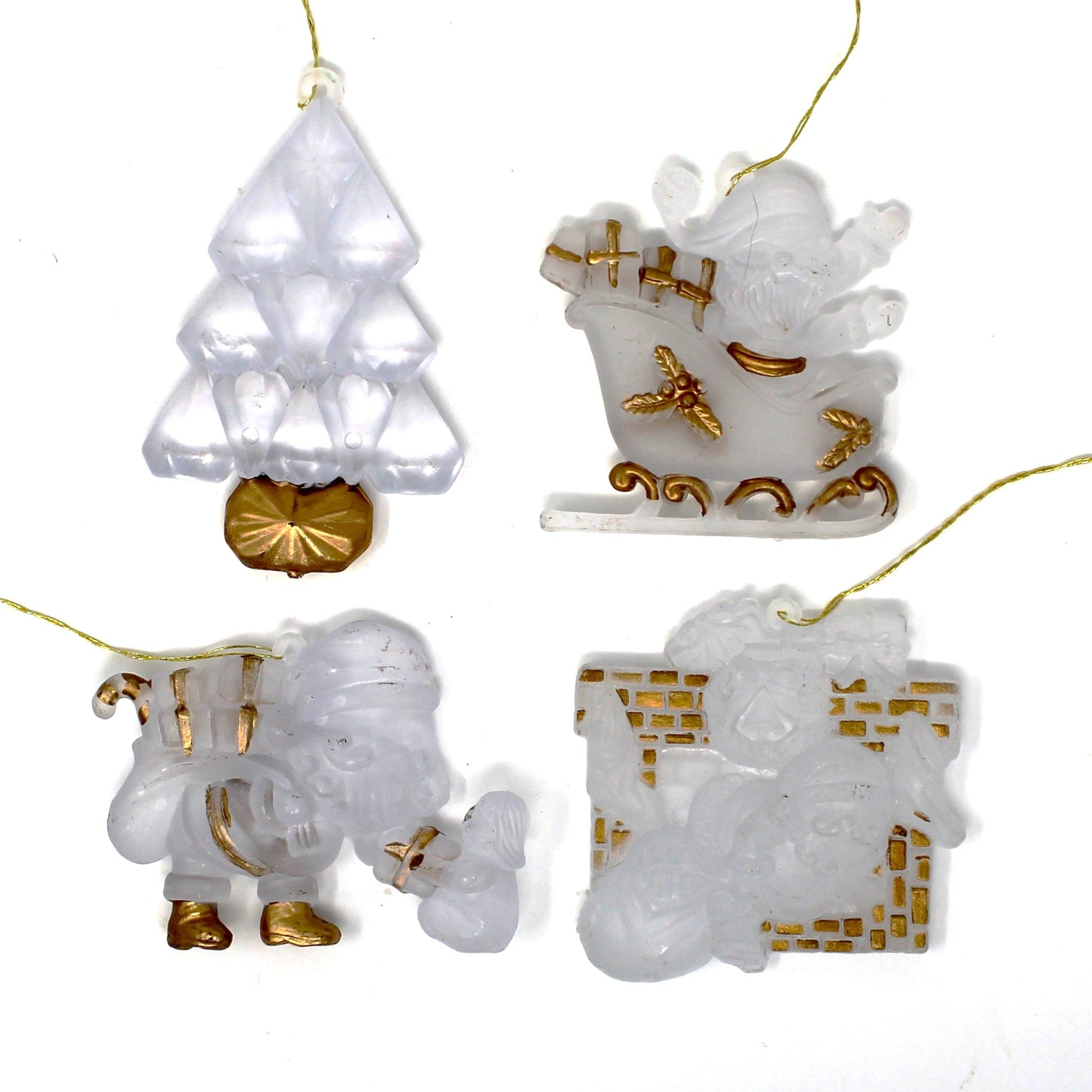 - Details: Bring festive cheer to your holiday decor with this playful set of four vintage frosted acrylic ornaments. Each ornament features charming gold-trimmed details. We have four in this lot: Santa with toys, Santa in his sleigh, Santa by the chimney, and a classic Christmas tree. Lightweight and shimmery, they add a magical touch to your tree or holiday display, perfect for creating joyful memories all season long. Each ornament has a gold metallic string for hanging. An inexpensive addition addition to your Christmas Tree or added to gift packages. We offer 20% off on the purchase of 3 or more ornaments, mix and match, any 3. Please Contact Us, let us know which ornaments you're interested in to receive discount. (Sets Count as 1 Item).