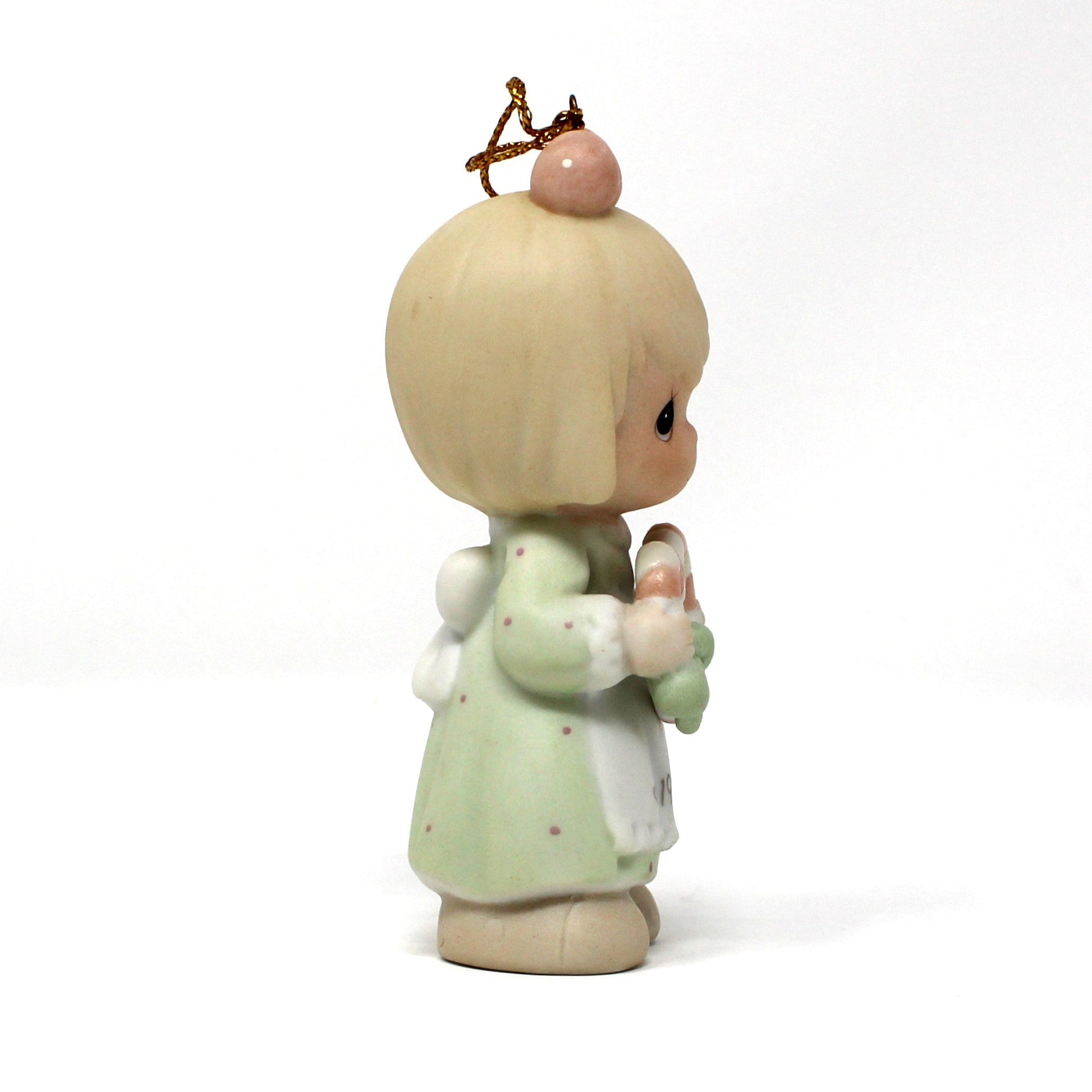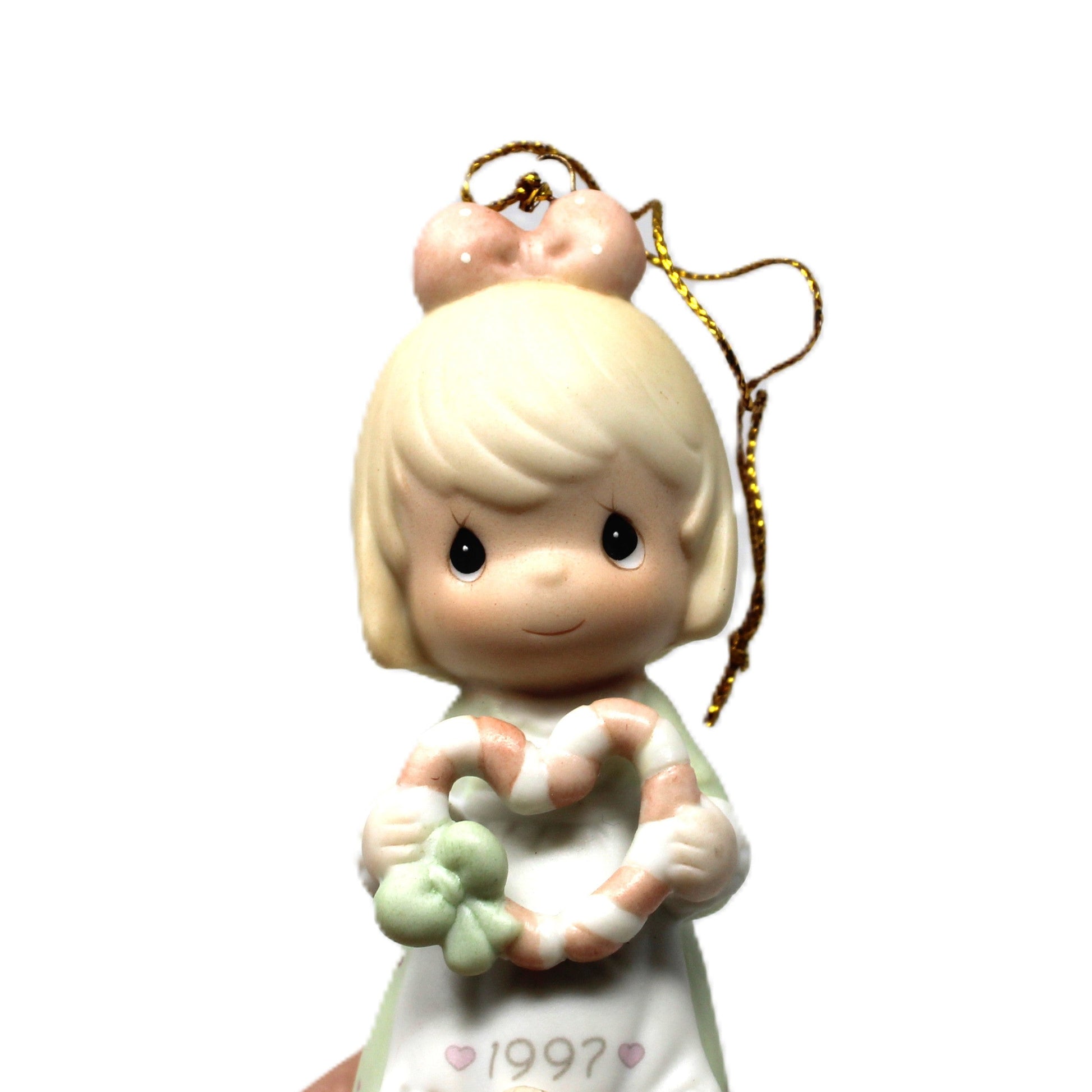 • Details:  This is an adorable ornament from the Precious Moments Collection.  Featuring a girl holding a striped heart with a green bow.  She is bisque porcelain,,  wearing a green dress, white apron and a pink bow on her hair.  This is an ornament, comes with a gold hanging cord, however, it can be used as a figurine, it stands on its own.  Made by Enesco, she is dated 1997, in original box.  Great addition to your Precious Moments Ornament Collection.  We offer 20% off on the purchase of 3 or more ornaments. Please Contact Us, let us know which ornaments you're interested in to receive discount.