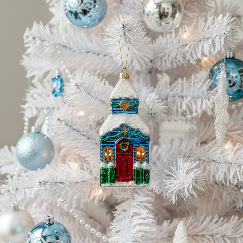 - Details: This church shaped ornament is mouth blown glass and hand-painted in bright red, blue, green and silver. It is a very large ornament, 7 inches, with lots of glitter that will really stand out on your tree and give it that loved holiday sparkle we all love. This ornament will make a great addition to your collection. We offer 20% off on the purchase of 3 or more ornaments. Please Contact Us, let us know which ornaments you're interested in to receive discount.