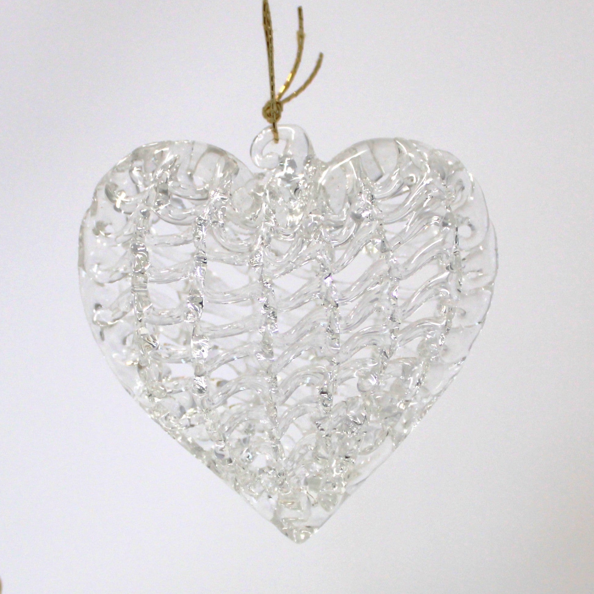 - Details: Bring festive cheer to your holiday decor with this gorgeous set of blown glass heart shaped ornaments! Each ornament features intricate spun glass shaped into a woven open filigree heart. Because they're clear glass they will reflect light on your tree and provide a beautiful glow. Each ornament has a gold metallic string for hanging. These ornaments have never been used, the box had never been opened, however, we opened it to inspect each piece and photograph. These are perfect for Christmas, Valentine's or anytime you want to create a romantic atmosphere. We offer 20% off on the purchase of 3 or more ornaments, mix and match, any 3. Please Contact Us, let us know which ornaments you're interested in to receive discount. (Sets Count as 1 Item).