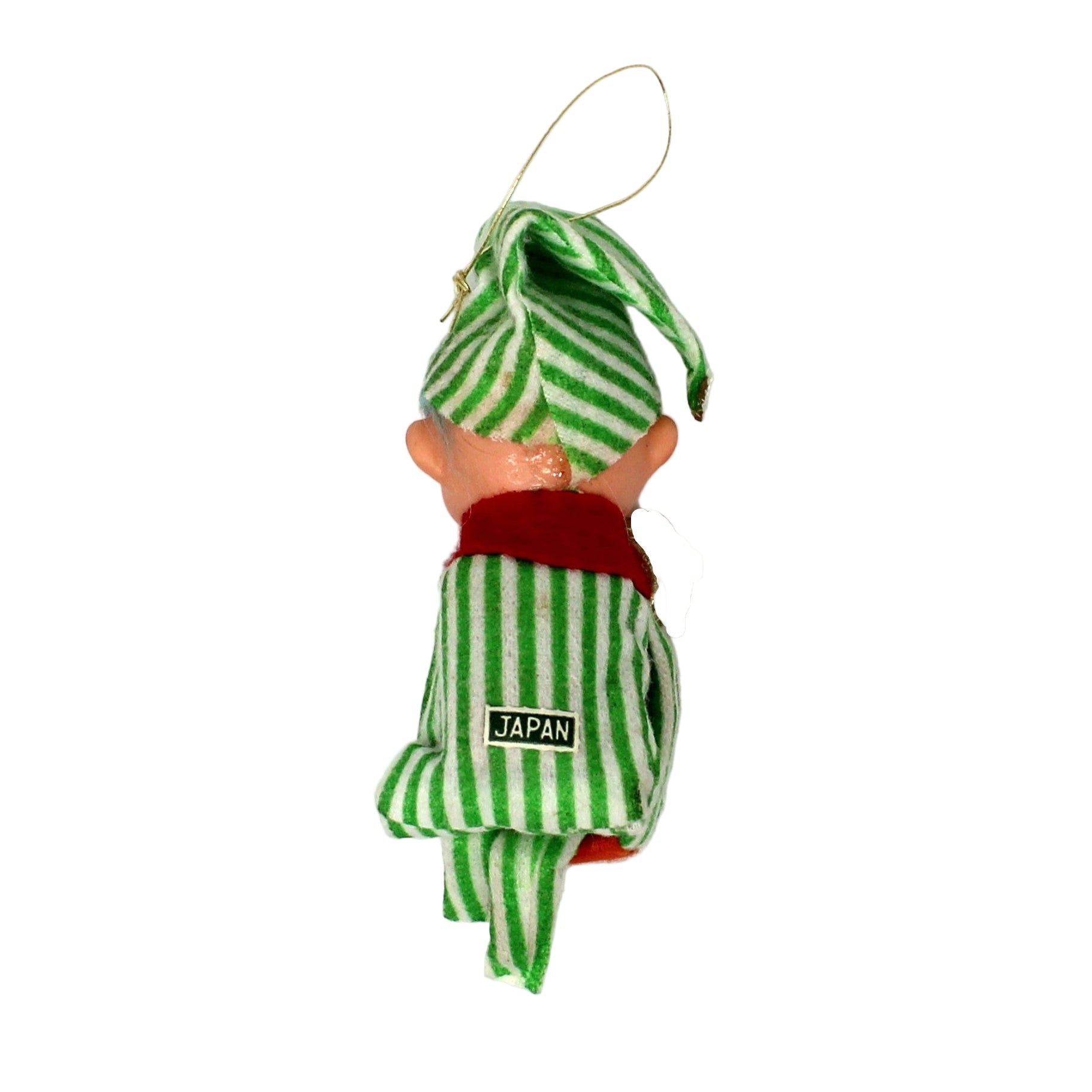 - Details: This is a rare vintage Knee Hugger Pixie Elf ornament. Crafted from green and white striped fabric, he has bright blue hair and a quirky bow tie. This playful mid-century collectible has a normal nose and normal ears, not pointed, definitely makes him stand-out in a sea of pointy nosed elves. He still retains the original "Japan" sticker. Perfect for adding a touch of charming retro Christmas magic to your tree, he's a delightful Japan import that’ll hug your holiday spirit with whimsy and joy. Wonderful gift for a collector!
