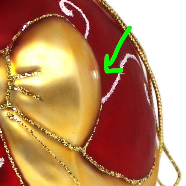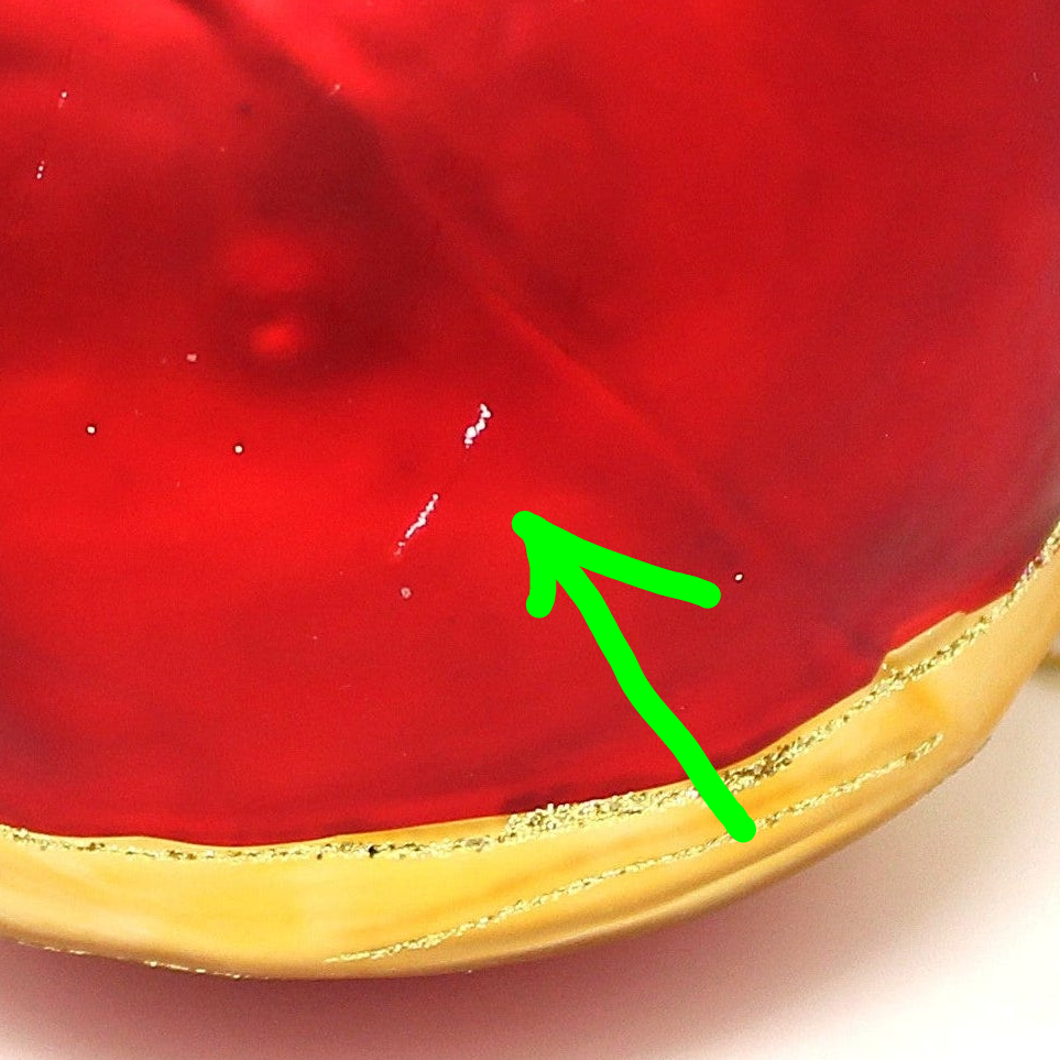 - Condition: Used. Very Good Condition. There are two minor issues, gold is missing in a small section of the bow. There's a thin scratch on the red bottom. Both photographed for you. The box shows wear, good for storage. Please review all pictures and make sure you love this item before purchasing, we can't accept returns. Please remember these are USED items, they are NOT new, every effort has been made to show any scratches, wear and tear and imperfections.