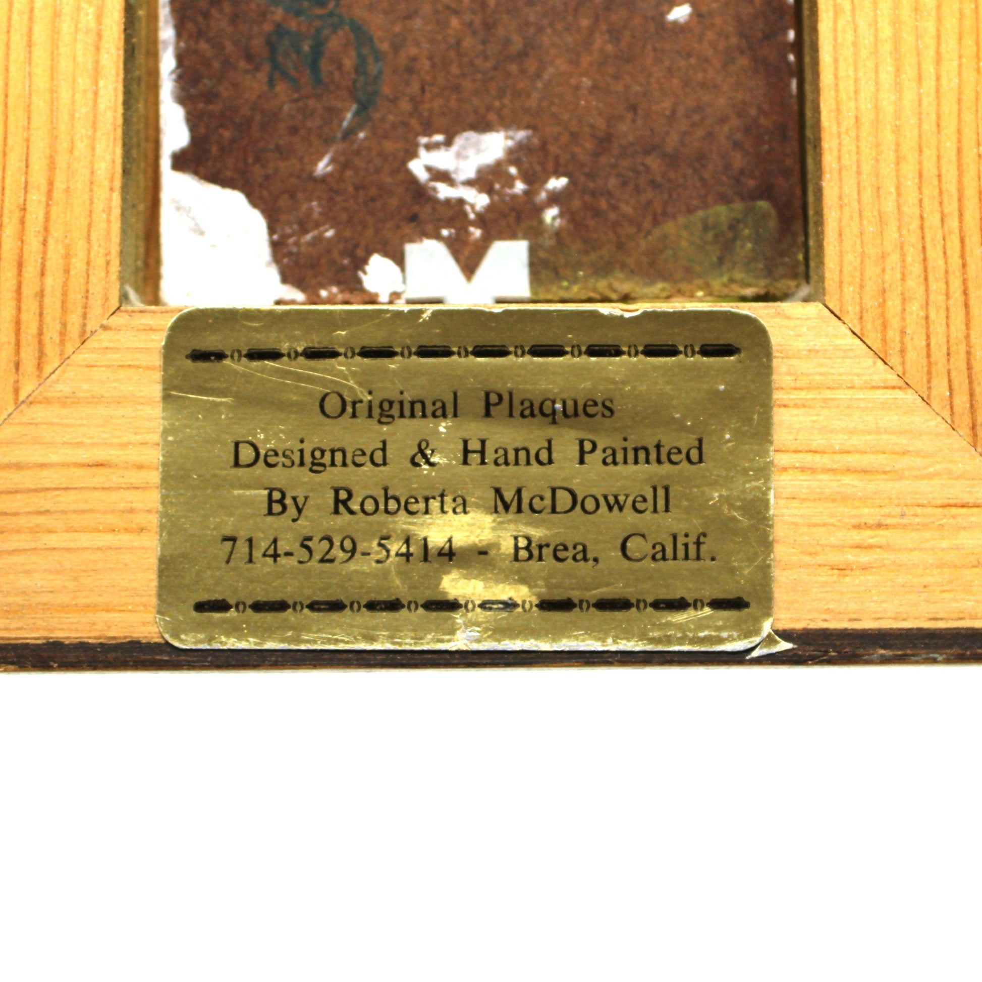 - Details: A charming vintage original by Roberta McDowell, this hand-painted and signed wall plaque, captures a whimsical blue bird perched on a branch, in bright, retro tones. Framed in a gorgeous, gold and beige, authentic wood frame, (no glass). This is an original work, not a print, the back retains the original foil sticker that reads: "Original Plaques Designed & Hand Painted by Roberta McDowell, Calif". Ready to hand with a sawtooth hanger attached. This 1970's piece brings genuine character to just about any space that needs a bright touch of color. The artist's distinctive work and folk-art sensibility make it a collectible accent that celebrates vintage craftsmanship and timeless, lighthearted charm. We also carry a framed Girl with Blue Bird and Flower design by Roberta, if you'd like both paintings, please contact us for a 15% discount.