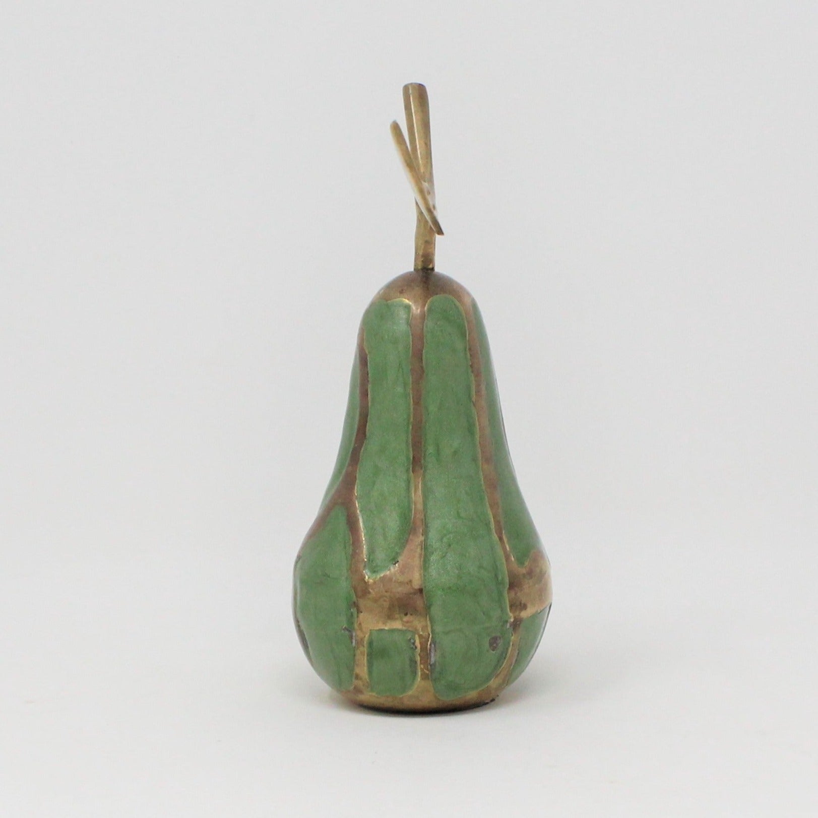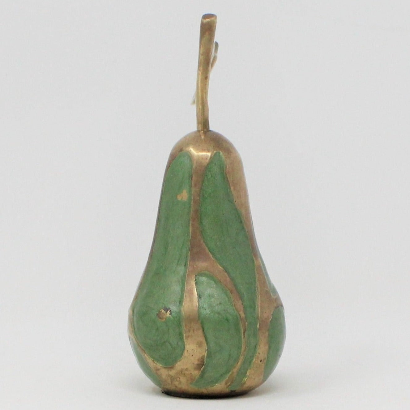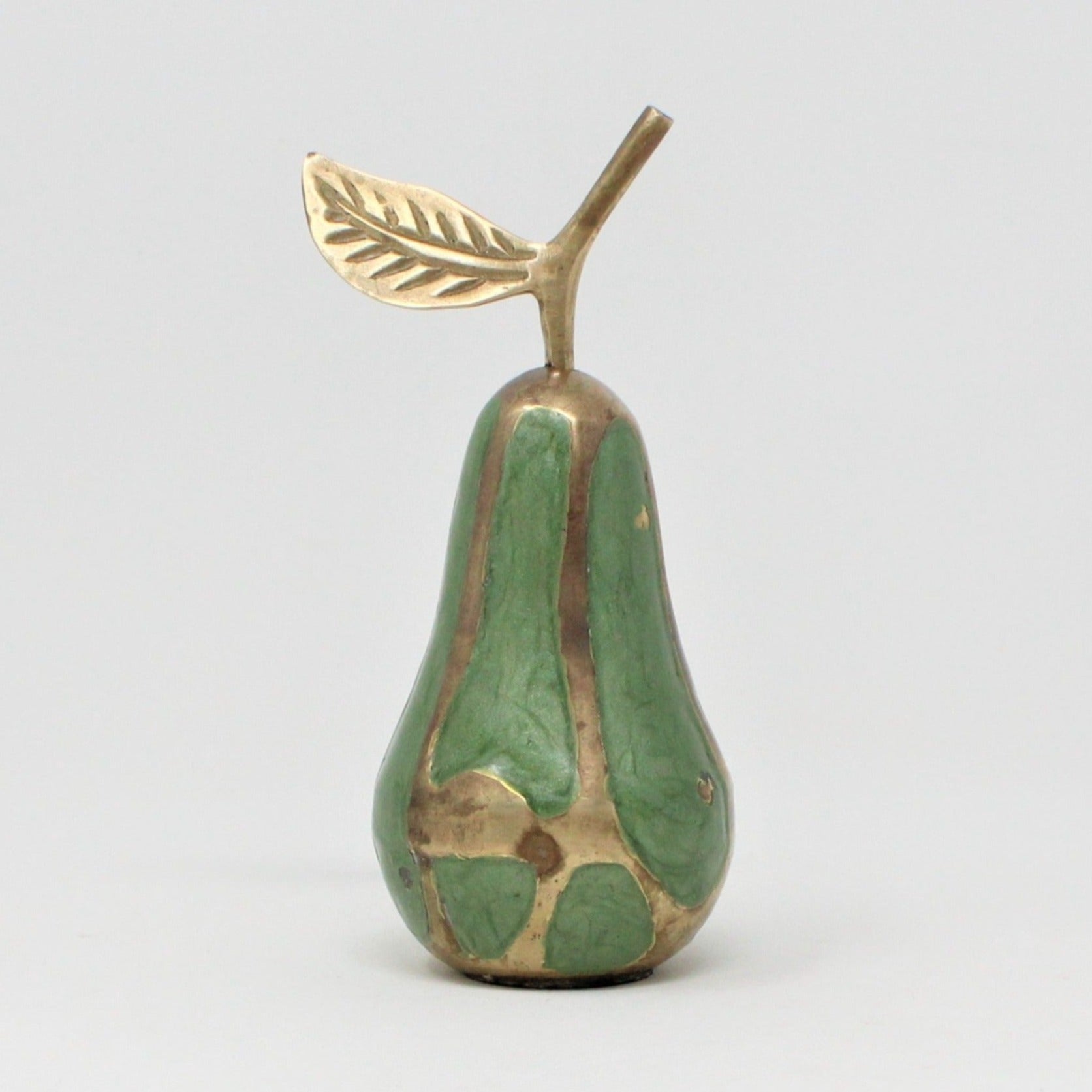 • Details:  A unique and very charming piece of decor, or paperweight for your desk.  This green Pear is made of brass and green enamel, using the Champlevé technique that creates a lovely design on this pear, finished with a brass stem and leaf.  There is black felt on the bottom to protect your furniture.  It was sold as a paperweight and it's perfect for a desk or office, but it will surely make a statement on a bookshelf, mantel, or wherever you want to showcase it.