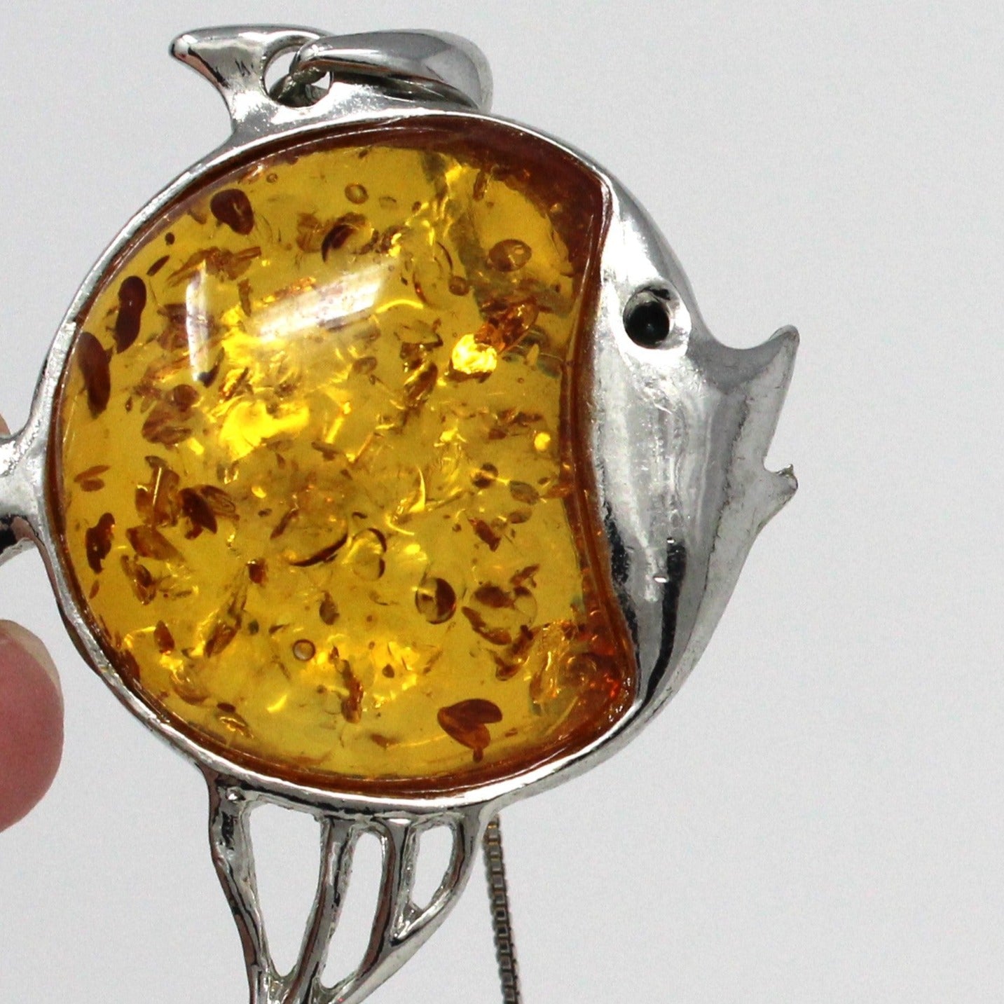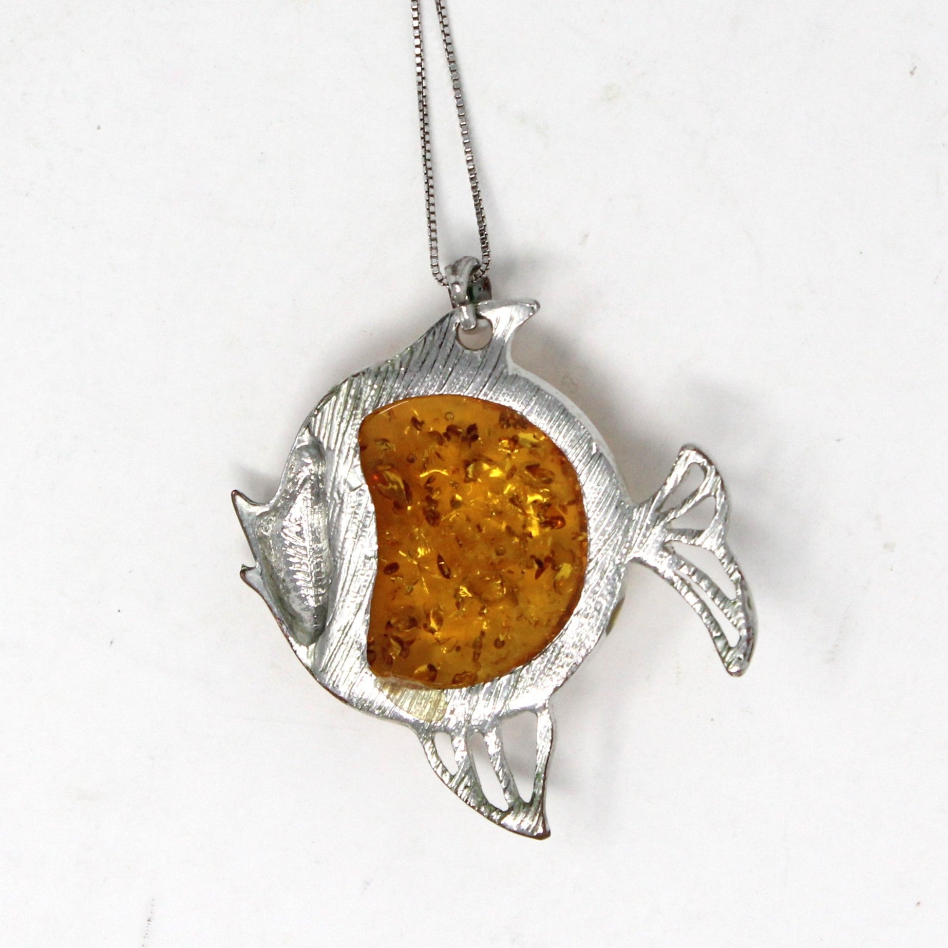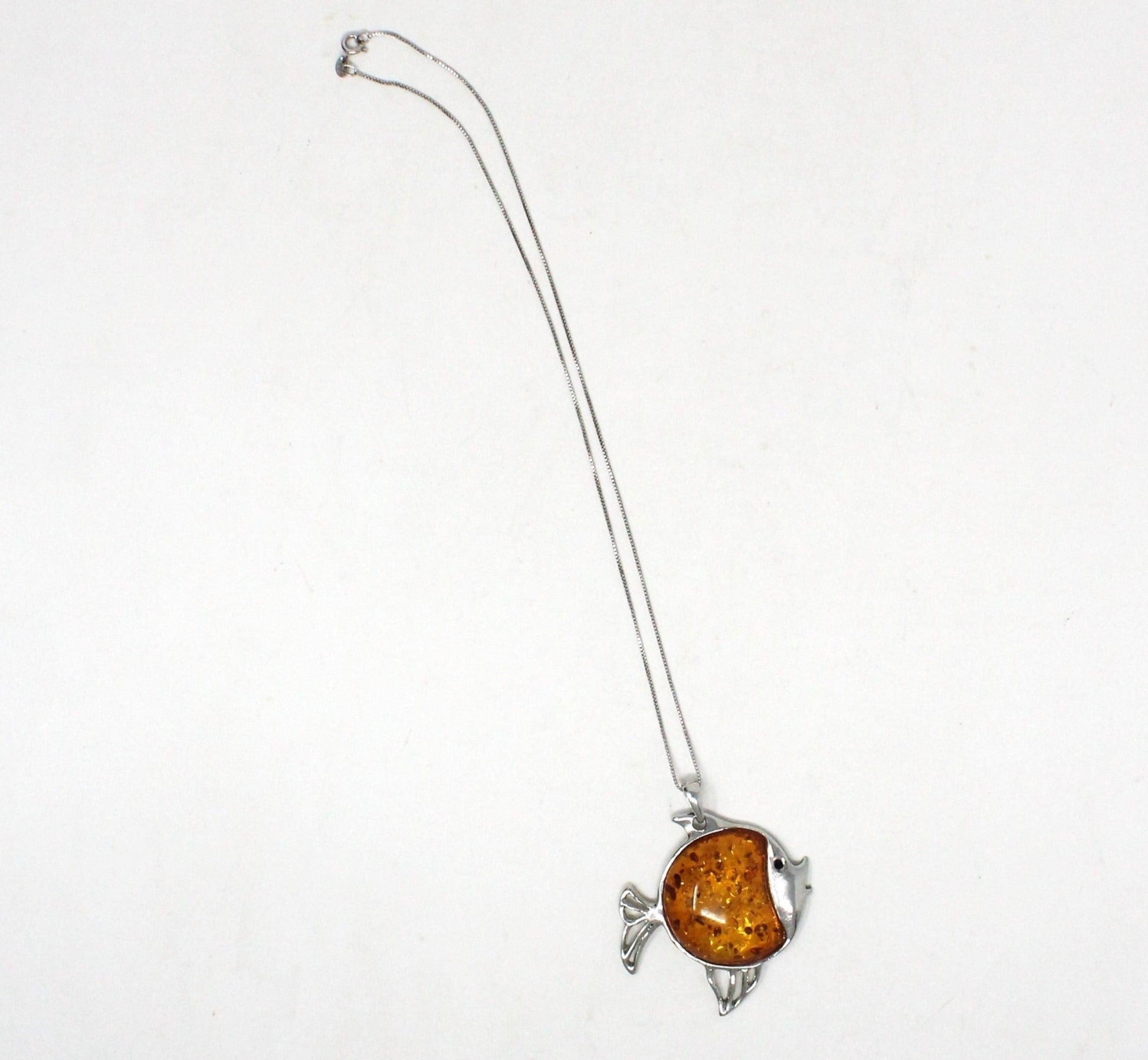 - Details: A very pretty fish pendant on a sterling silver chain. The fish is round with a very large amber stone with lots of inclusions, just beautiful! The fish tail and gills have cut-work that really enhances the look. This pendant comes with a sterling silver chain, marked "925 Italy". The fish pendant is not marked, we tested with a very strong magnet and it's not magnetized, always a good sign, but again, it is unmarked so we cannot guarantee the fish is sterling silver. A fun piece to wear all summer long.