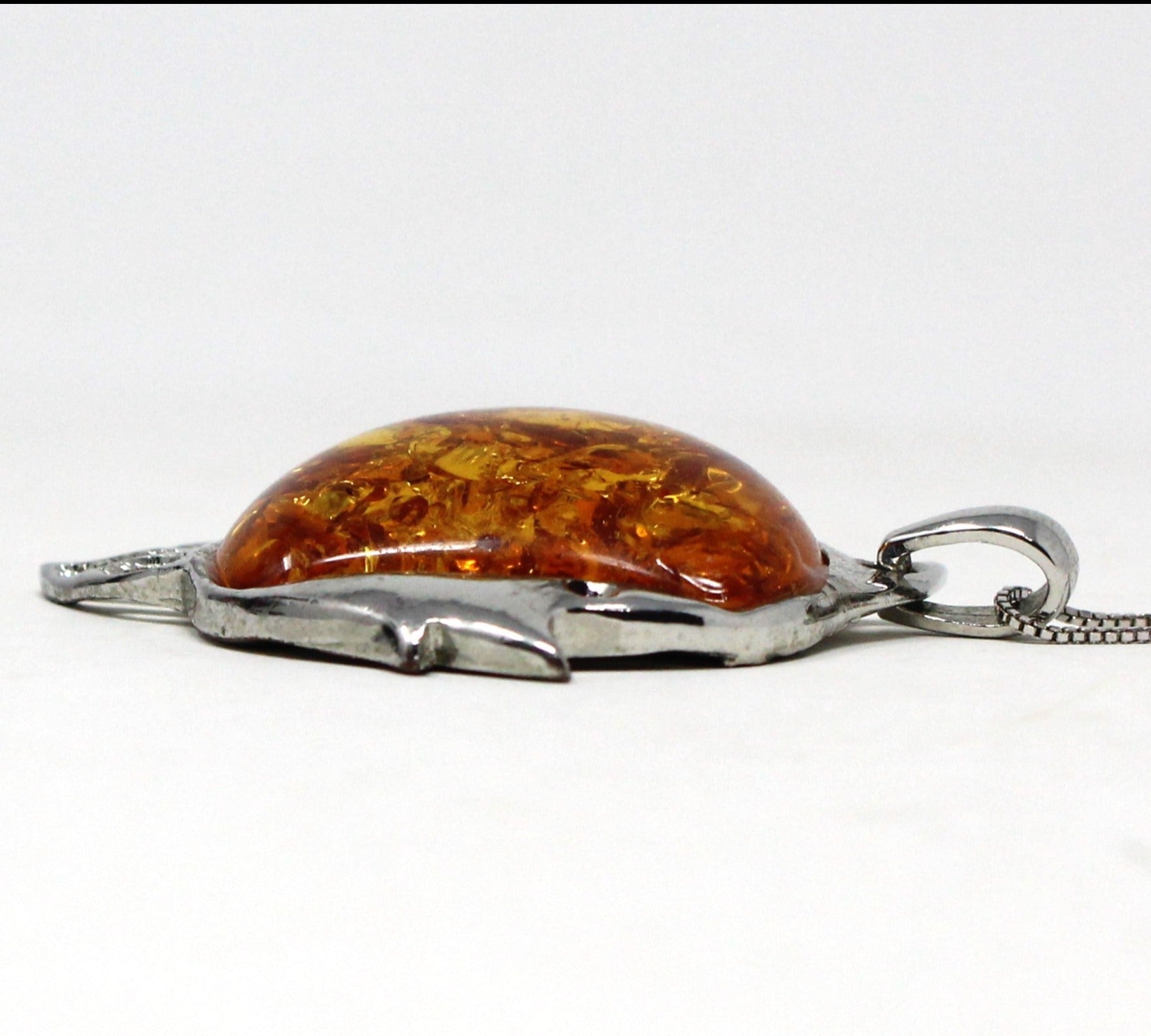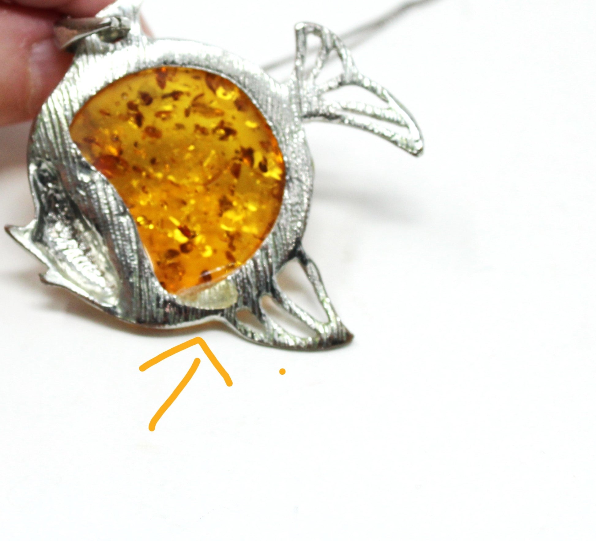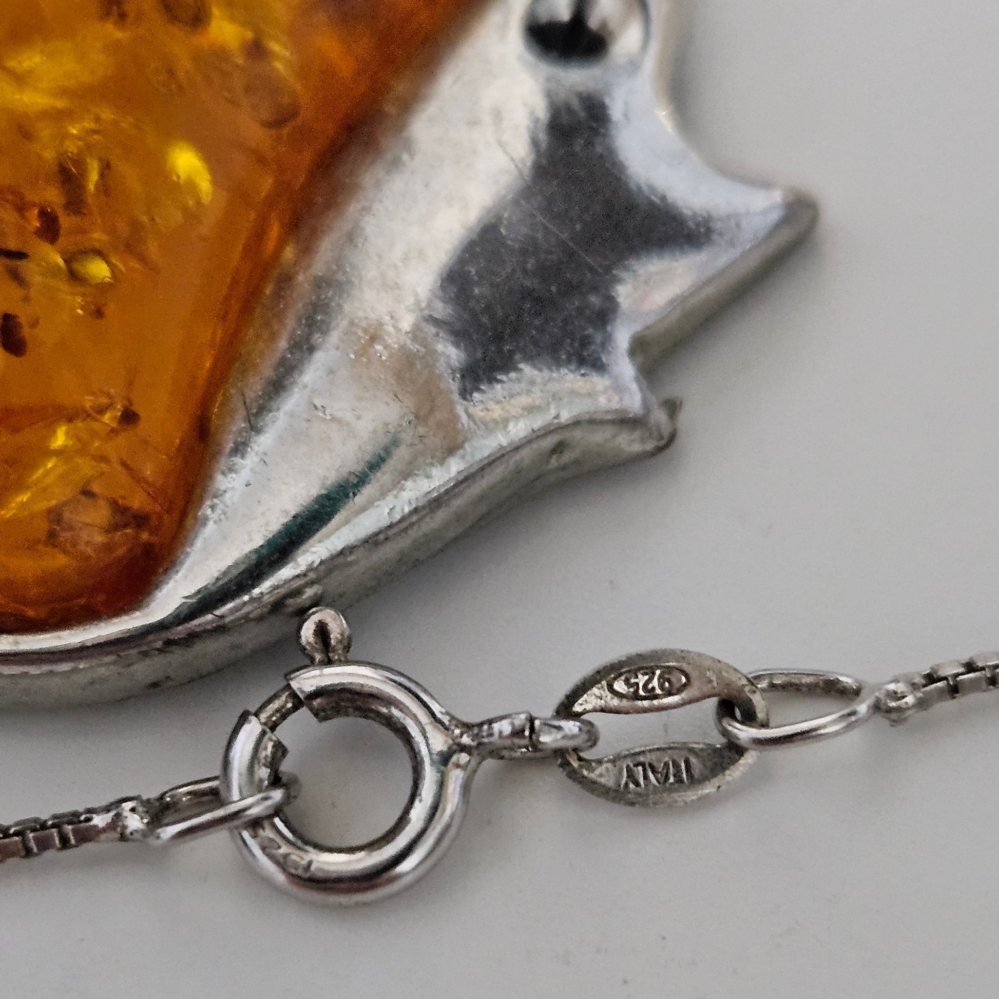 - Details: A very pretty fish pendant on a sterling silver chain. The fish is round with a very large amber stone with lots of inclusions, just beautiful! The fish tail and gills have cut-work that really enhances the look. This pendant comes with a sterling silver chain, marked "925 Italy". The fish pendant is not marked, we tested with a very strong magnet and it's not magnetized, always a good sign, but again, it is unmarked so we cannot guarantee the fish is sterling silver. A fun piece to wear all summer long.