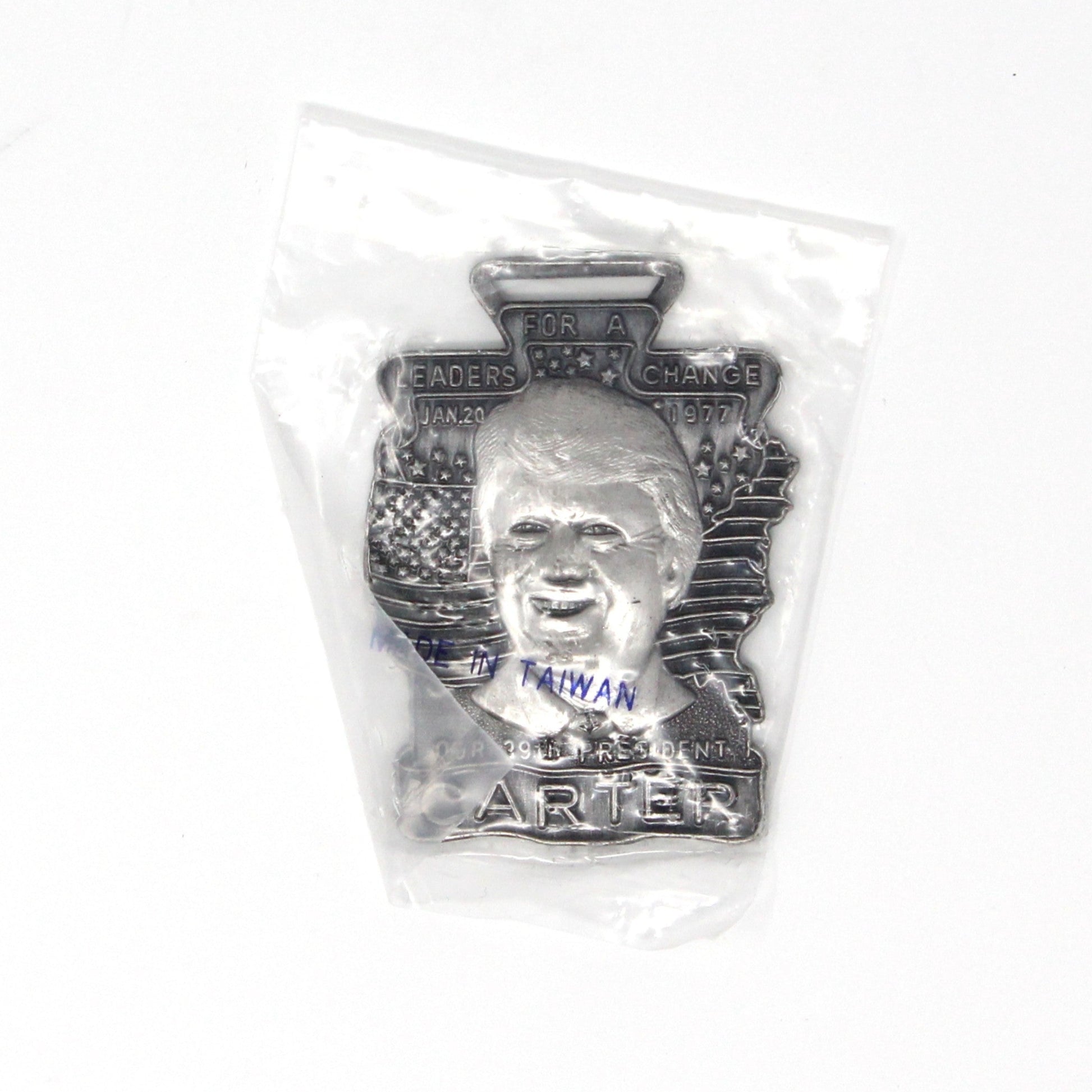 - Details: This Presidential collectible fob is from the Democratic Presidential Inauguration of our 39th President, Jimmy Carter. Dated January 20th, 1977. It's highly detailed with the likeness of James Earl Carter Jr, (affectionally called Jimmy), in the center and USA Flag behind him. These were commissioned by AAA Novelty in Washington D.C., made in Taiwan, and sold in novelty stores. This item is made of a heavy metal, imitation pewter color, and it's never been used, still in the original packaging. Fobs have been used since the early 1900's, traditionally evolved to describe the decorative ornament attached to the end of a pocket watch chain. Fobs became increasingly popular in the political world, issued with portraits of political candidates or just their names. Today, a fob can still be used with a pocket watch, but now it refers to any decorative pendant worn on a chain, even if not attached to a watch. Unique and historical accessory for your collection.